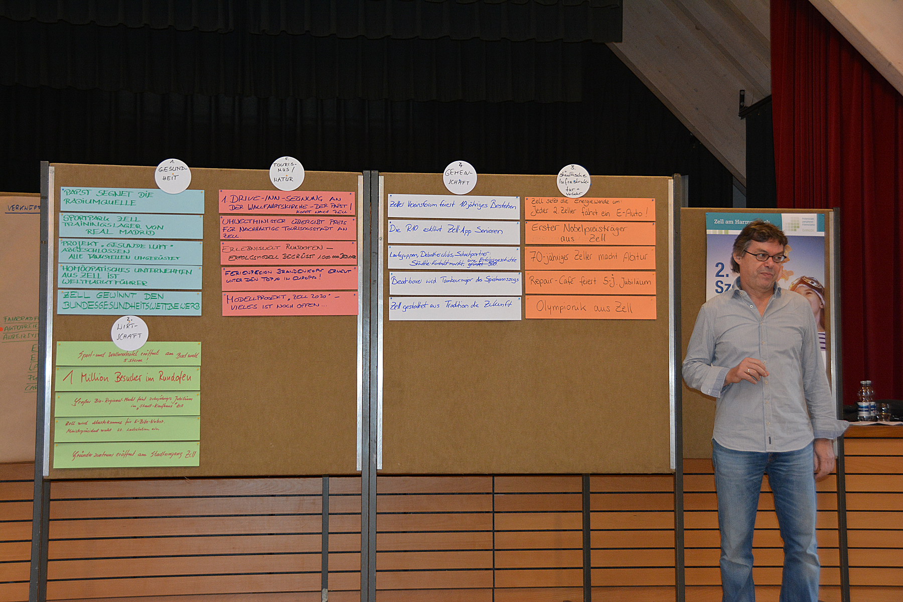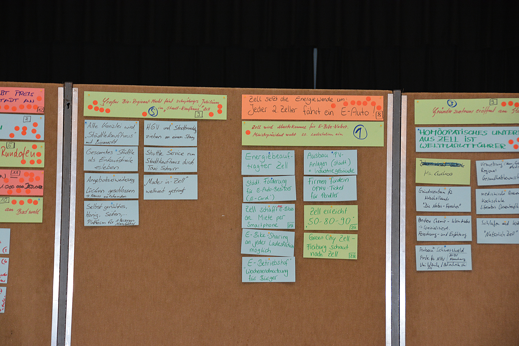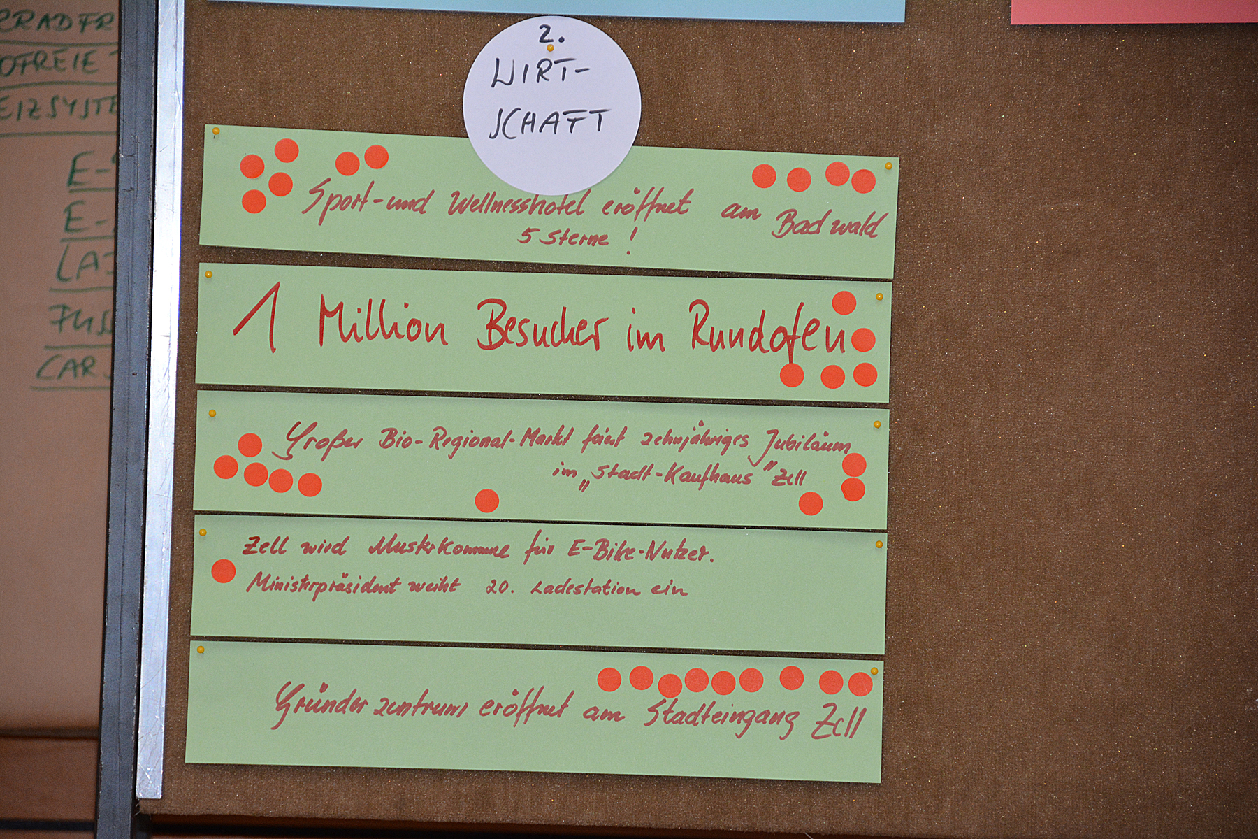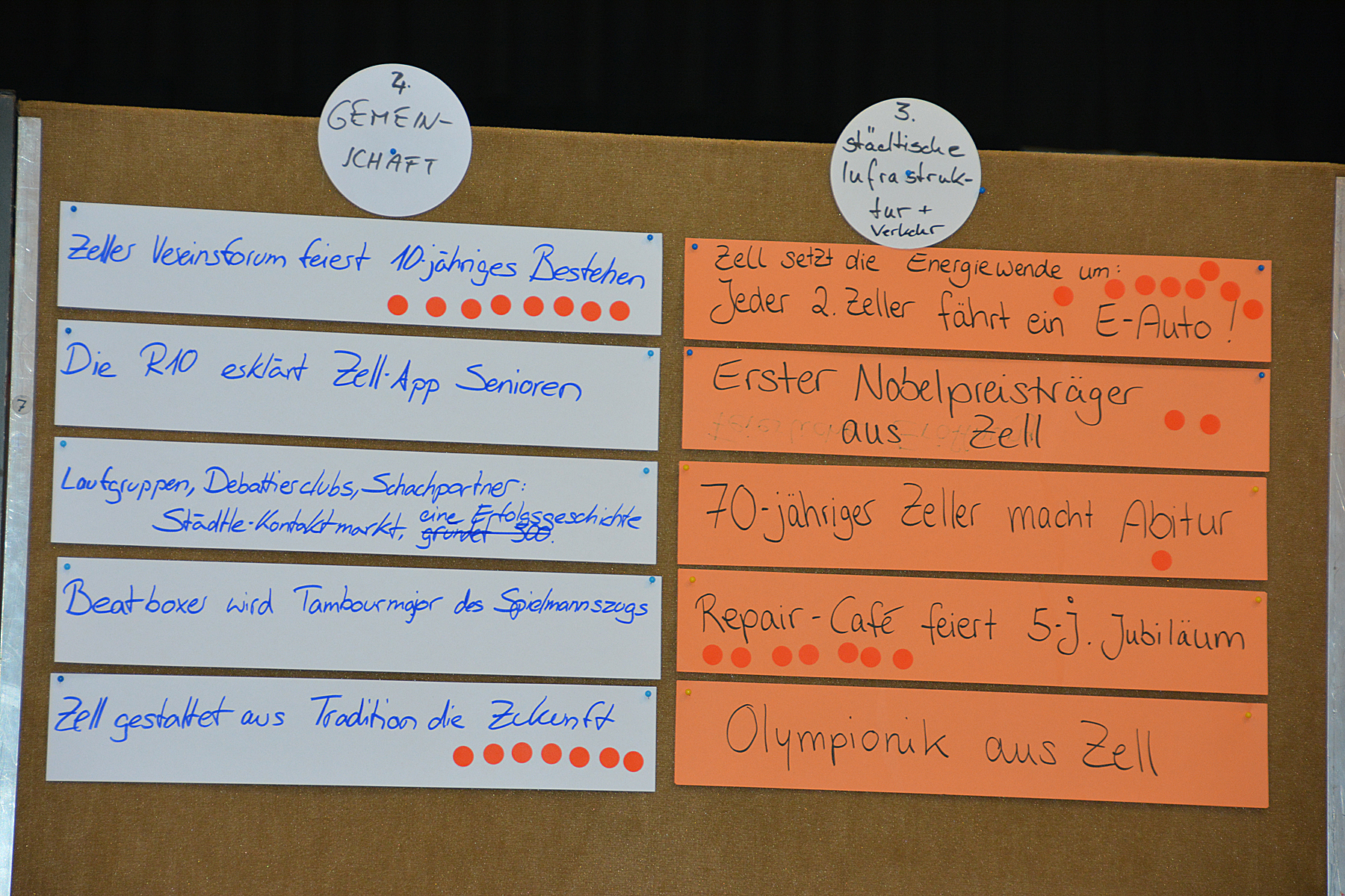 Aus der Vielzahl von Nennungen mussten die Teilnehmer dann mit jeweils fünf Klebepunkten darüber abstimmen, welche Ideen sie als besonders Zukunftsrelevant für Zell erachten. Daraus entwickelten sich fünf Themenschwerpunkte, zu denen im zweiten Teil der Szenariowerkstatt zunächst Überschriften und dann auch Berichte ausgearbeitet wurden, wie sie im Jahr 2030 in der Presse stehen könnten.