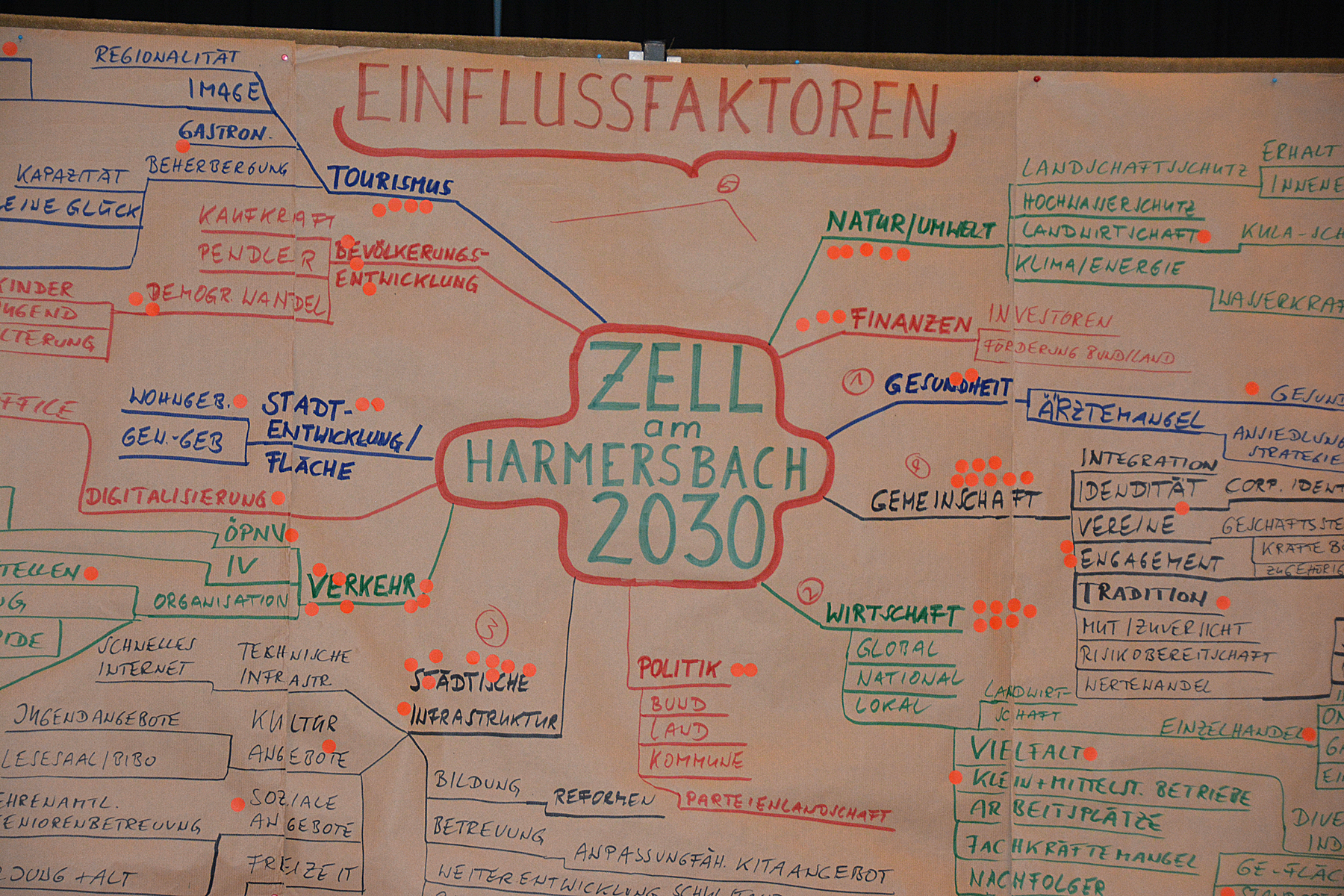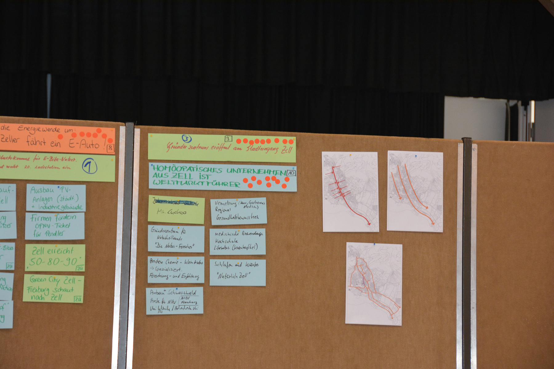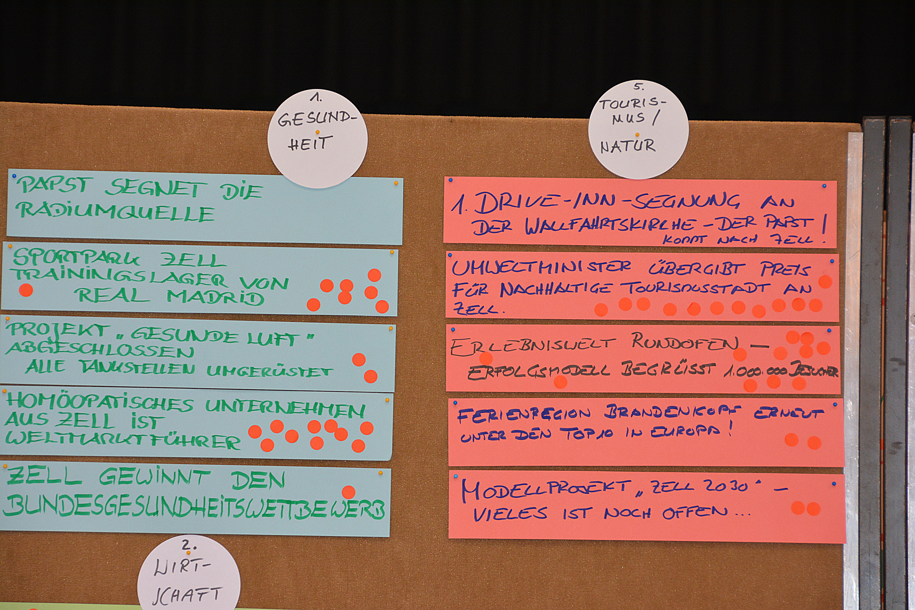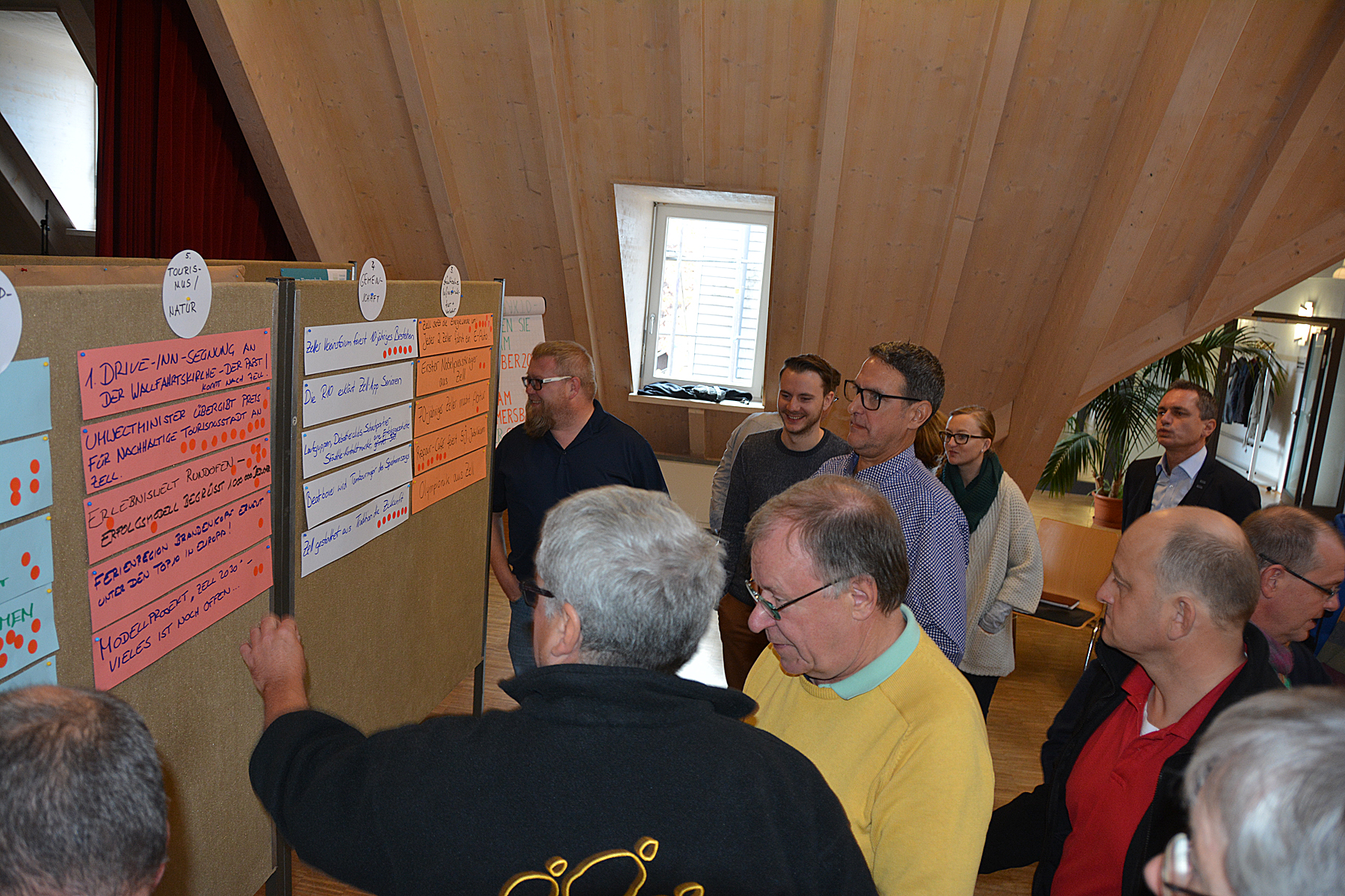 Aus der Vielzahl von Nennungen mussten die Teilnehmer dann mit jeweils fünf Klebepunkten darüber abstimmen, welche Ideen sie als besonders Zukunftsrelevant für Zell erachten. Daraus entwickelten sich fünf Themenschwerpunkte, zu denen im zweiten Teil der Szenariowerkstatt zunächst Überschriften und dann auch Berichte ausgearbeitet wurden, wie sie im Jahr 2030 in der Presse stehen könnten.