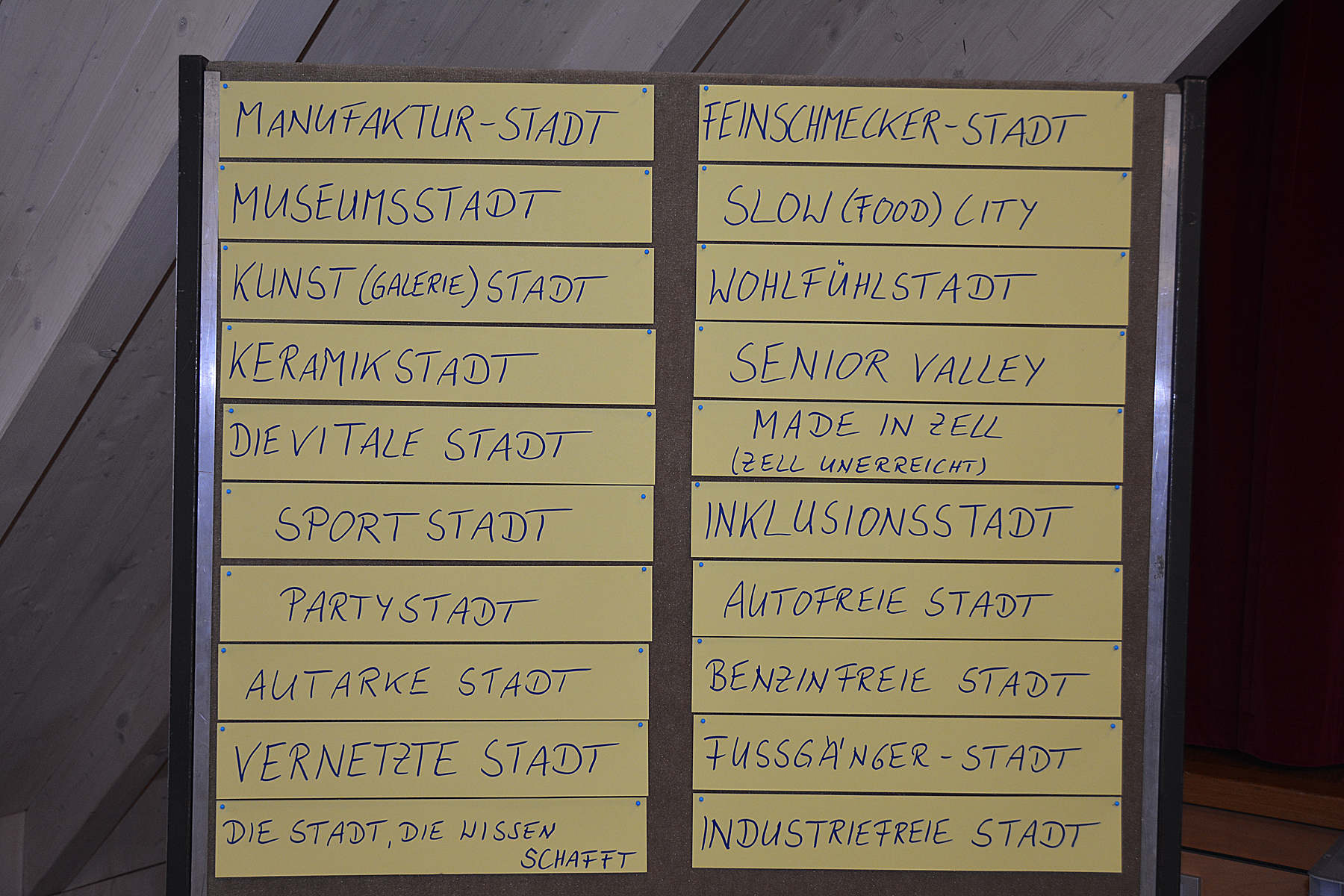 »An welchen Stellschrauben kann man drehen?«, forderte Professor Dehne die Teilnehmer dazu auf, darüber nachzudenken, welche Schwerpunkte sich daraus für Zell ergeben. Dabei wurden eine Fülle von Ideen auf die große Plakatwand notiert. Ein Augenmerk wurde auf den Erhalt und die Schaffung von Arbeitsplätzen gelegt. Für den Zeller Einzelhandel könnte sich der Vertrieb über das Internet als »Ama-Zell« oder »Zell-lando« entwickeln. Beim Tourismus oder als Gesundheitsstadt könnte Zell vor allem mit seiner Natur punkten. Unter dem Motto »Das kleine Glück« könnten Gastgeber ein einheitliches Zimmer- und Speiseangebot mit regionalen Produkten vermarkten. Die Schaffung eines Senioren- und Jugendzentrums oder der Ausbau von Zell als Sportstadt wurde genannt. In der Vereinswelt könnte mit einer Geschäftsstelle die übergreifende Zusammenarbeit neu formiert werden.