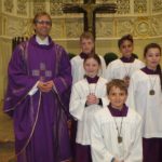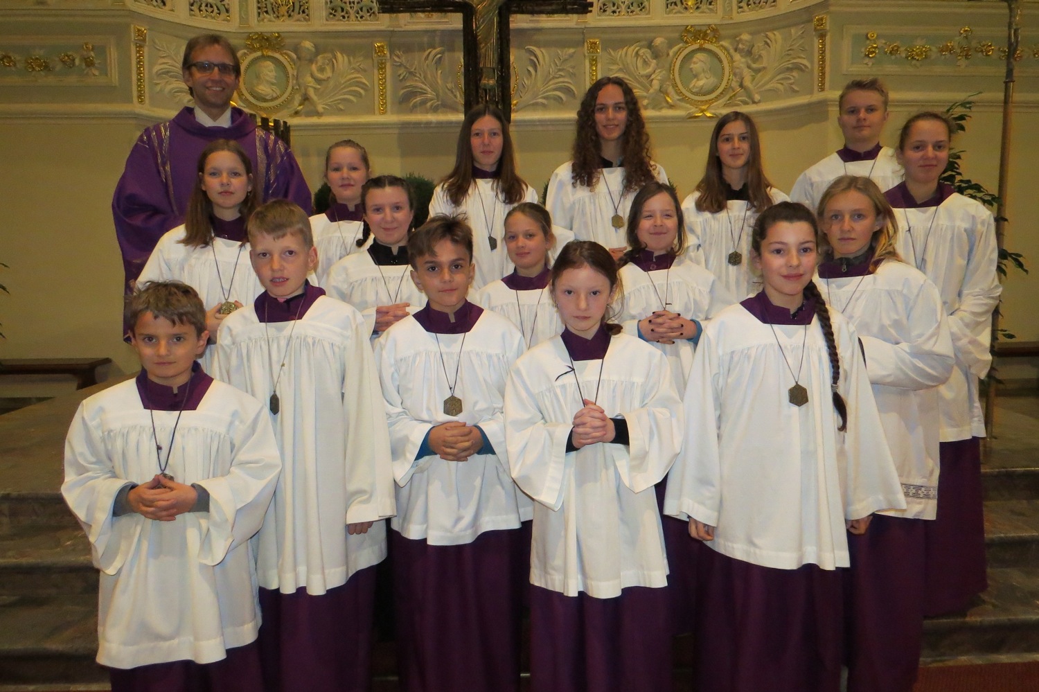 Die neuen Ministranten erhielten ihre Gewänder und die Plaketten. Pfarrer War­neck sprach ein Segensgebet über die Kinder. Danach gingen sie in die Sakristei und zogen die Ministrantenkleider zum ersten Mal an. Bei der Vorbereitung der Eucharistiefeier konnten sie schon behilflich sein und die Gaben zum Altar bringen.