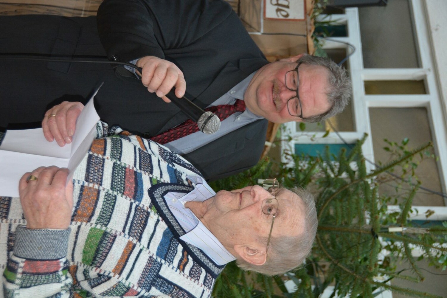 Ein wichtiger Bestandteil der jährlichen Weihnachtsfeier sind die Ehrungen langjähriger Mitarbeiter, die Pfarrer Gerner und Bürgermeister Pfundstein gemeinsam vornahmen. Die beachtliche Zahl der Jubilare, so Pfarrer Gerner, sei Ausdruck für das gute Klima, das insgesamt im Haus herrscht.