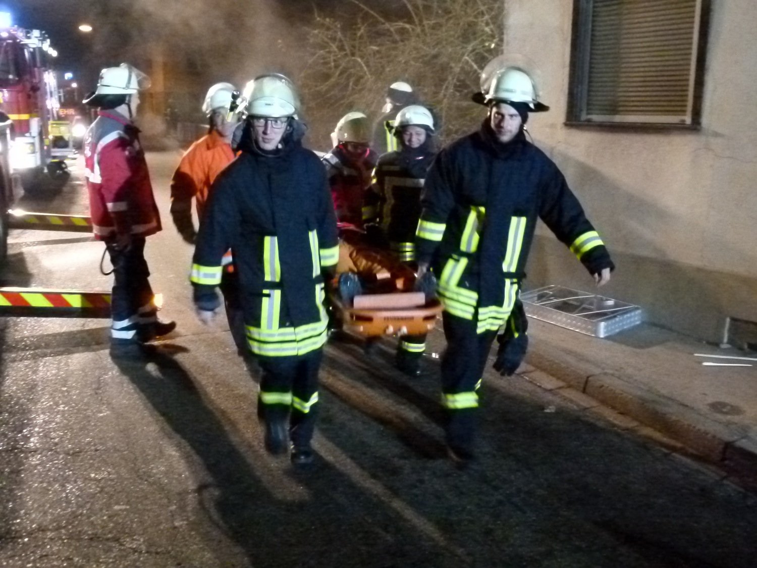 Die Einsatzkräfte versuchten, mit einer Steckleiter diese Person zu retten. Da das Opfer das Gebäude aber nicht über die Leiter verlassen wollte, wurde zuerst das Treppenhaus mit einem Belüftungsgerät rauchfrei gemacht. Beim Retten dieser Person wurde im Treppenhaus auch die bewusstlose Person gefunden und ins Freie gebracht, wo die Person dem DRK übergeben wurde. Nachdem alle Verletzten gerettet und vom DRK versorgt wurden, begannen Kräfte der Feuerwehr mit Brandbekämpfung. Hierzu drang ein Trupp unter Atemschutz durch die Garage in den Keller vor. Das Feuer konnte rasch gelöscht werden.