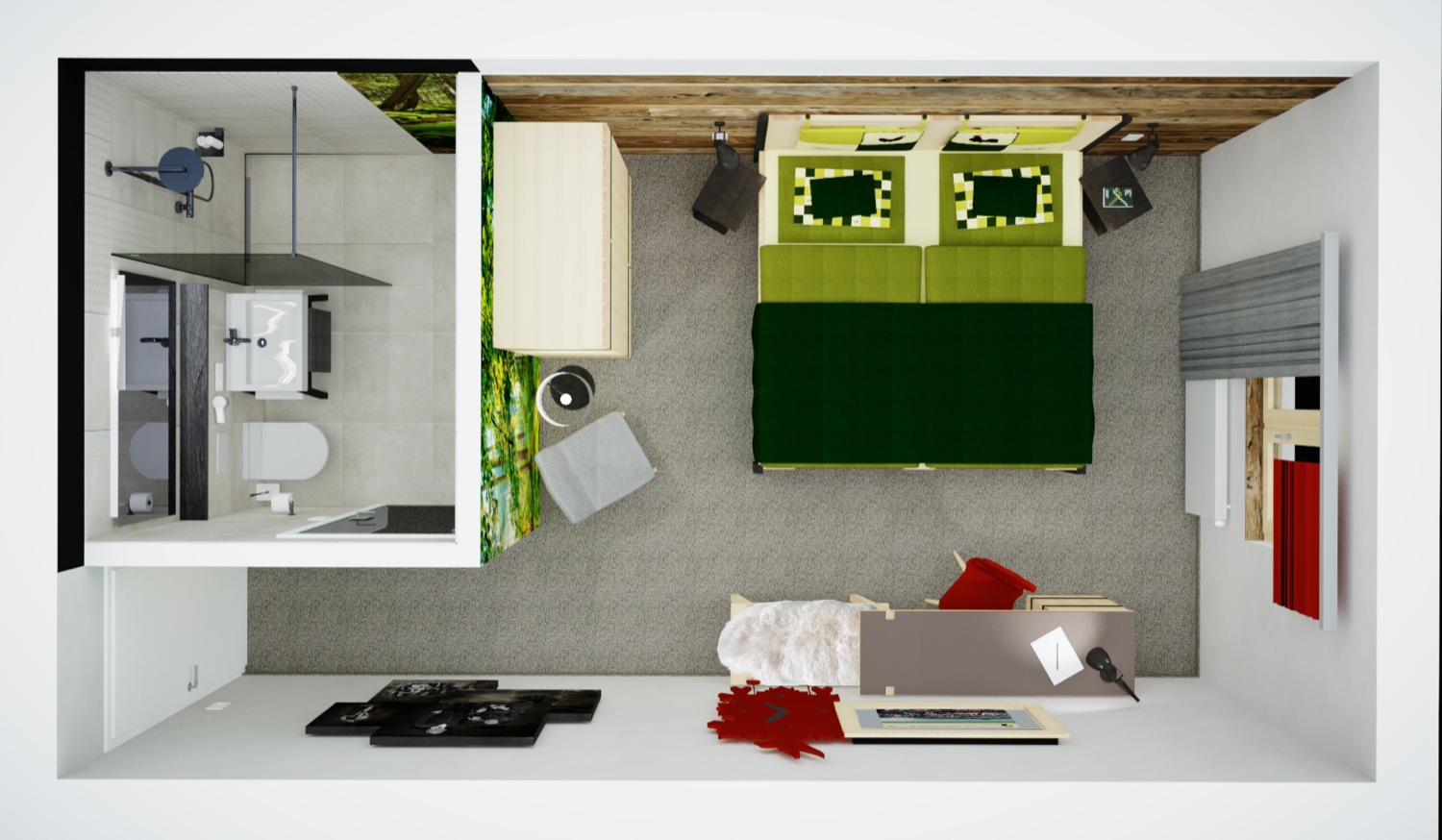 Schwarzwald-Erlebnis wurde in die passende Materialauswahl umgesetzt. Der Teppich im Flur hat die gleiche Farbe wie die Waldwege, die Rückwand des Bettes duftet nach Nadelholz, farbenfrohe Handtücher sind wie die bunten Wiesenblumen, die Fliesen nehmen Bezug auf die Steine des Waldes. Stefan Kornmeier: »Die Gästezimmer erzählen eine Geschichte, sind Schwarzwald pur.«