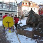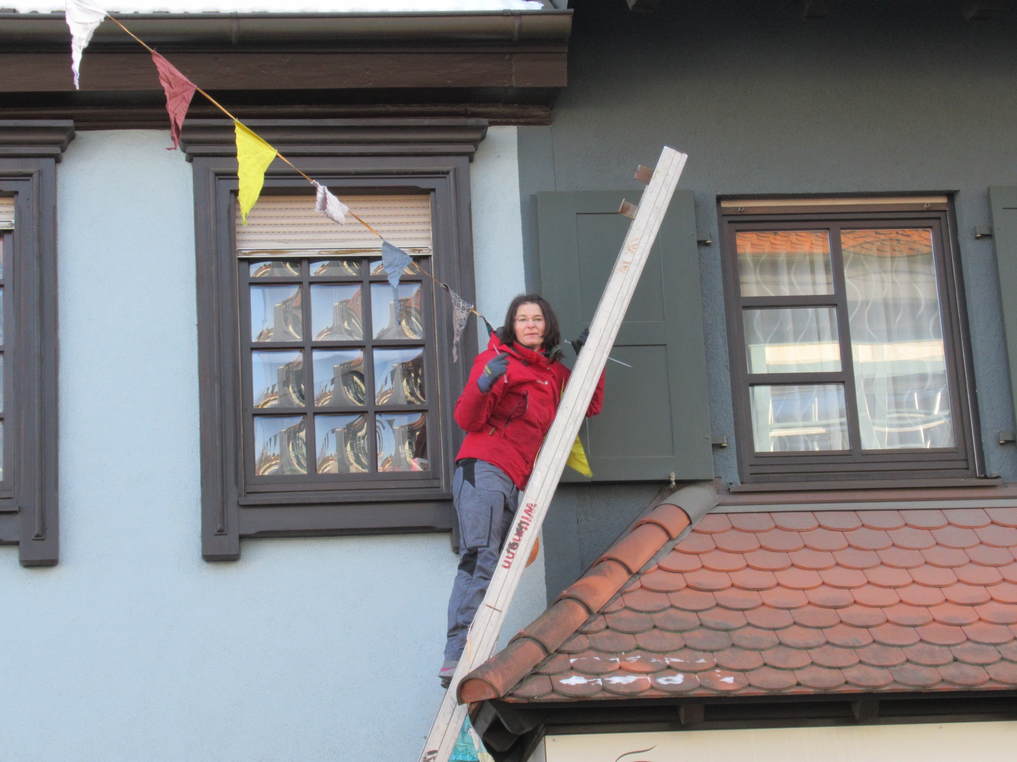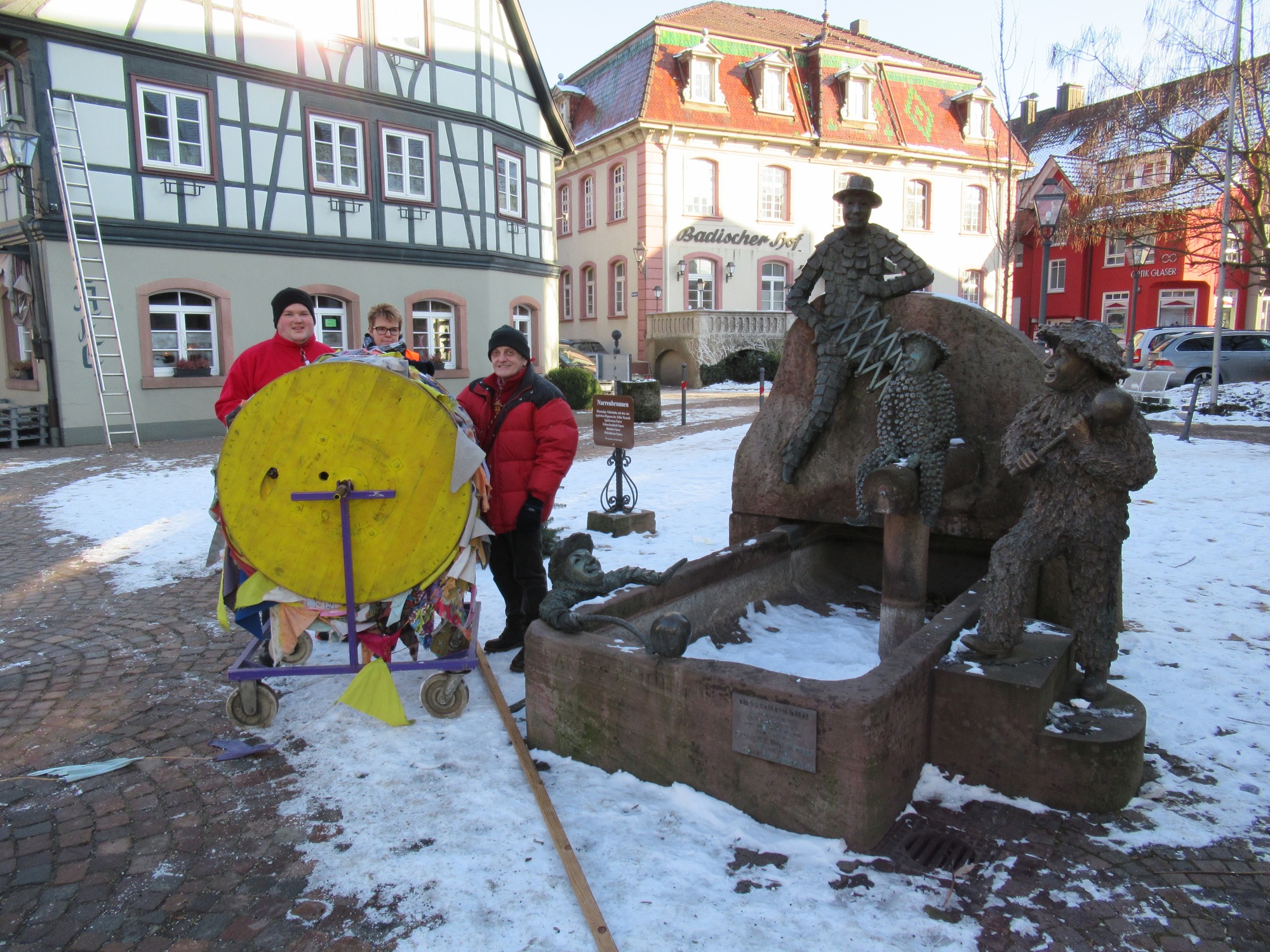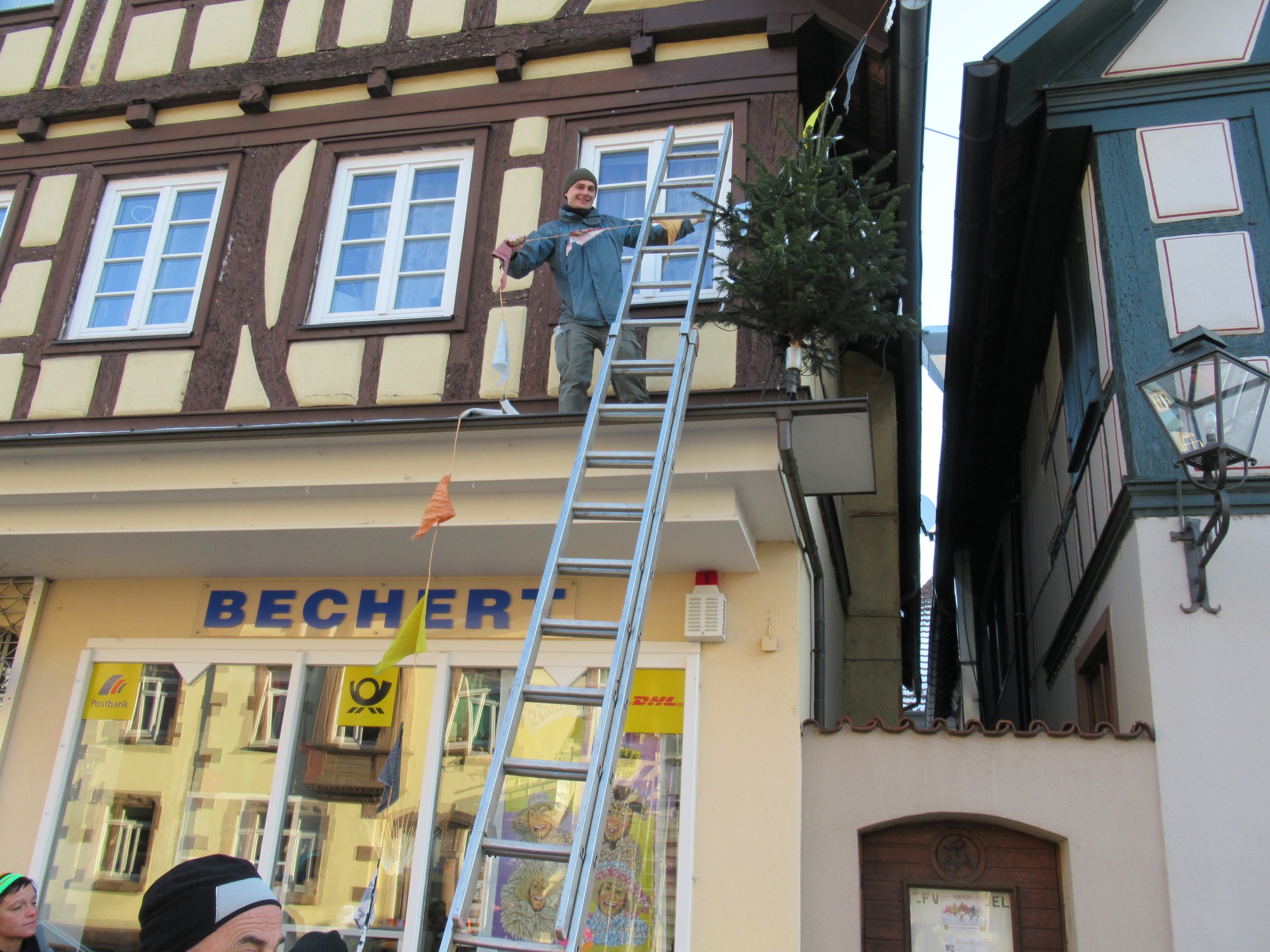 Angefangen hatte der erste Trupp bei der Volksbank. Dabei musste des Öfteren die Hauptstraße für die Autofahrer gesperrt werden. Erfreulich dabei, dass die sonst gestressten Autofahrer keinerlei Einwände hatten, und das zeigte eindeutig, dass bei ihnen das Fasendblut ins Wallen kommt. Beim Narrenbrunnen wurde eine kleine Verschnaufpause eingelegt, und schon ging es weiter. Als nächstes war die Kirchstraße an der Reihe und währenddessen war der zweite Trupp von der Oberstadt bis zum Kultur- und Vereinszentrum zum Anbringen der Fasendwimpel im Einsatz.