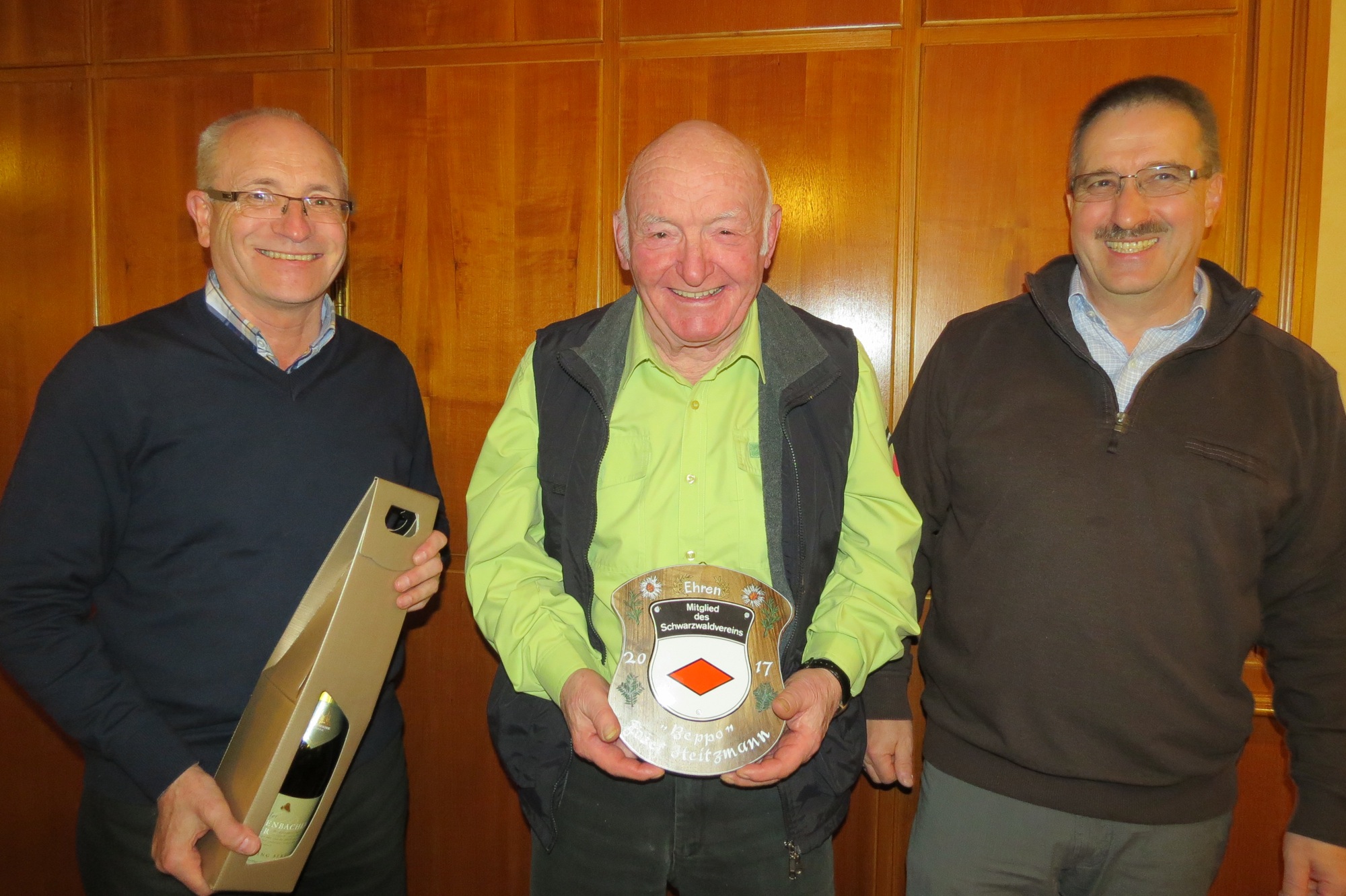 Eine besondere Ehrung wurde Josef »Beppo« Heitzmann zuteil. Für seine langjährigen Verdienste als Wegewart wurde ihm die Ehrenmitgliedschaft verliehen. Seit 21 Jahren pflegt er mit großem persönlichen Einsatz die 79 km Wanderwege. »Er kennt jeden Weg und jedes Schild. Oft ist er mit seinem Putzzeug im Wald unterwegs und reinigt die Schilder«, lobte ihn Brosamer. Reparaturen der Schilder erledigt er im Bauhof der Stadt oder im Werkraum der Schule. Außerdem kümmert er sich um die vielen Ruhebänke im Wald, erneuert ihre Bretter und sorgt für einen neuen Anstrich. Für seine besonderen Verdienste übergab ihm Brosamer ein Schild mit der Ernennung zum Ehrenmitglied des Schwarzwaldvereins.