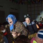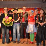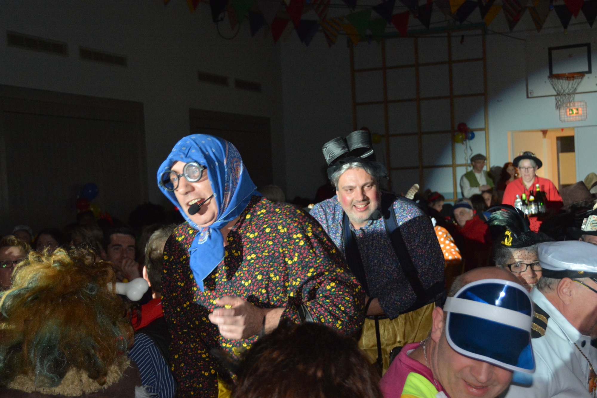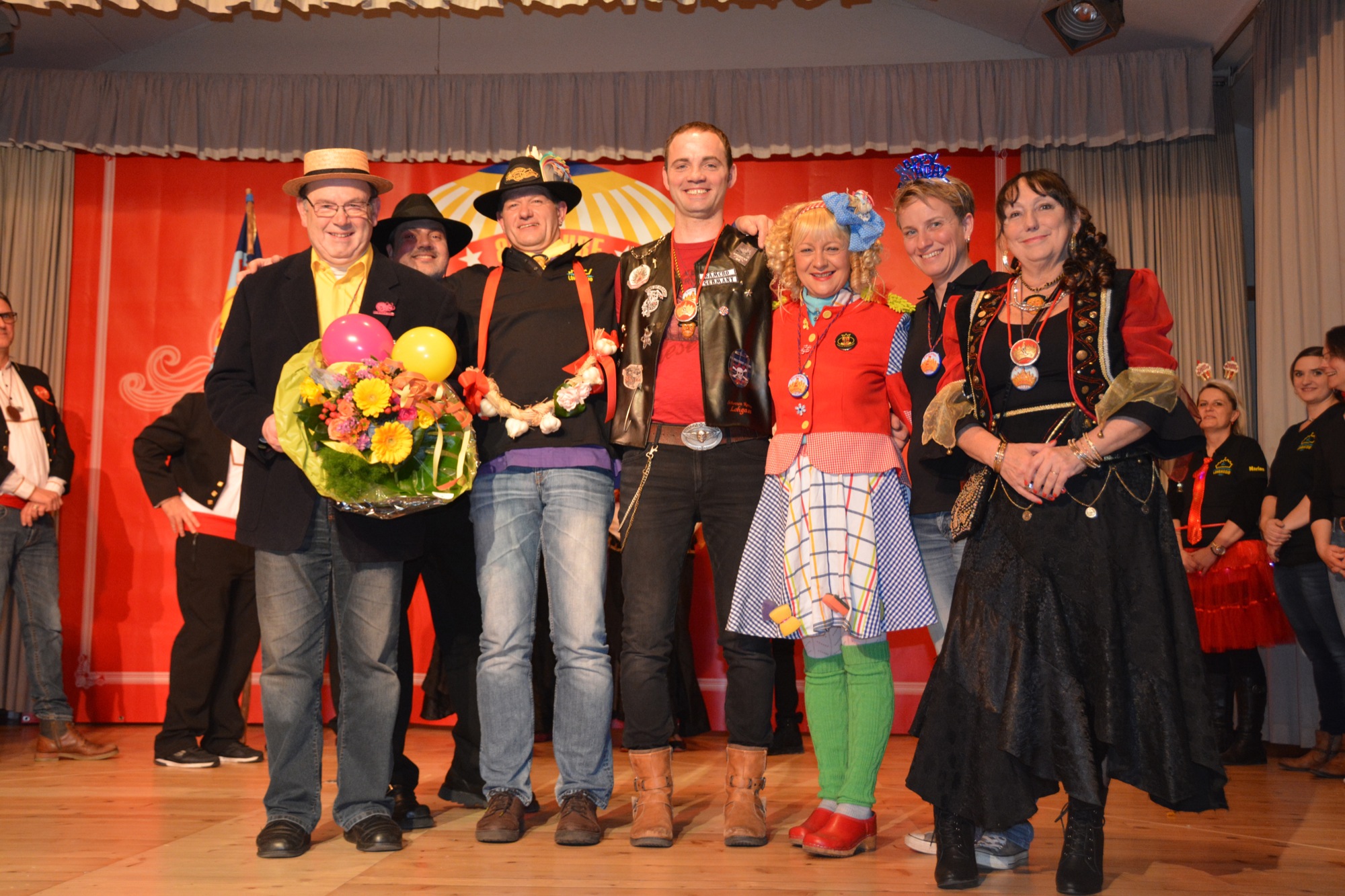 Am liebsten natürlich vor einem vollen Saal, wo die zwei zu spät gekommenen Bernadette und Alexandra (Alex und Bernd Harter) kein freies Plätzchen mehr fanden. Labernd und feixend bahnten sich die beiden Trachtenträgerinnen mit Nickelbrille und Rolltor den Weg durchs Publikum und sangen zwischendurch Narrenrat Sam Spicker ein »Happy Borschdei tou you« – wo gleich der ganze Saal mit einstimmte. Dem »Burgermeischder« wollten die beiden Bäuerinnen trotz der großen Platznot aber dann doch nicht auf den Schoß sitzen.