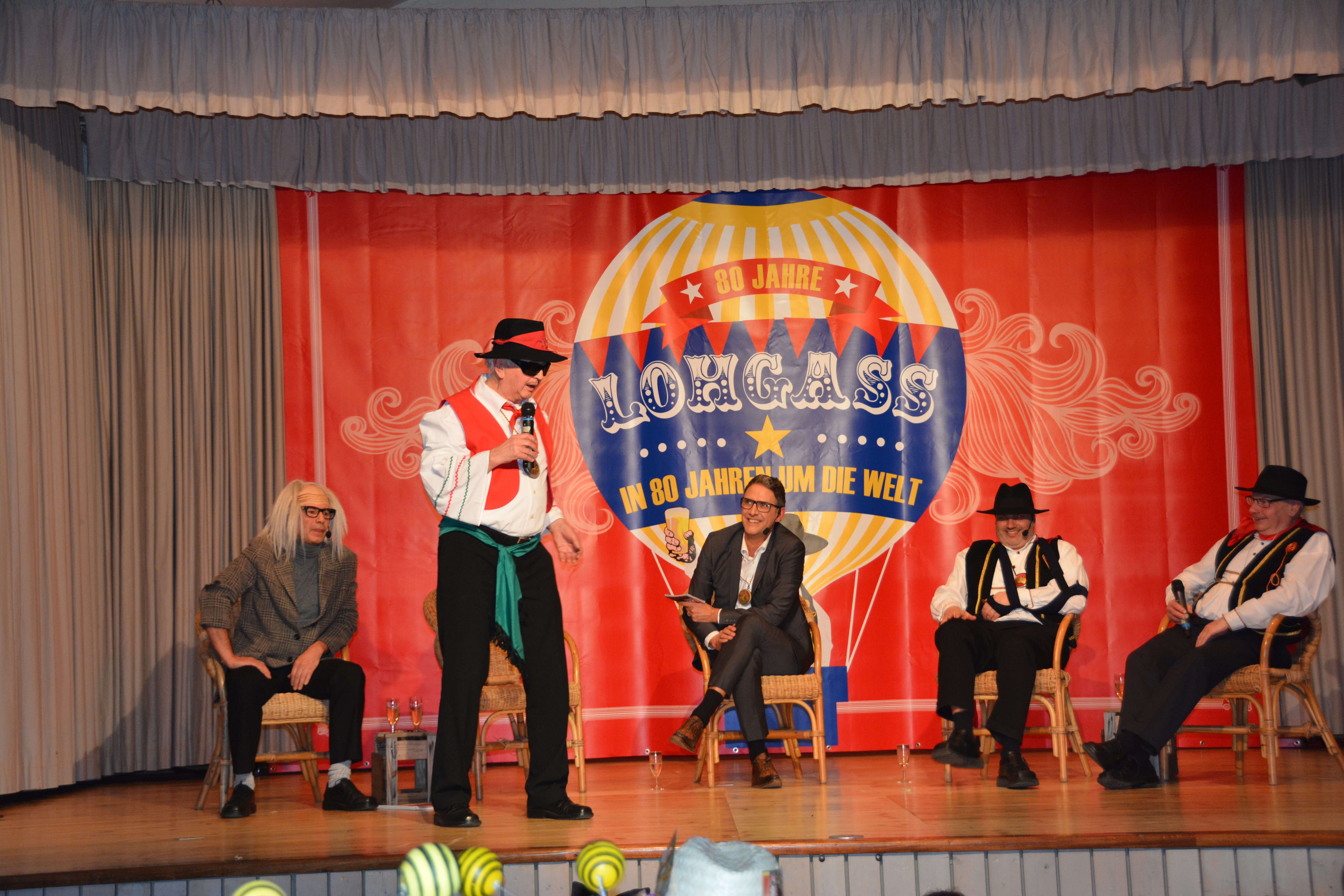»Einmal Zigeuner – immer Zigeuner«, rief Talkmaster »Lonz« alias Daniel Lehmann seinem fürstlichen »Zigeunermenü« zu und klärte auf: »Fasend gibt es hier, Bulldog drobe beim Ritter.« »80 Jahre Lohgass, das ist ein Bestseller«, schwärmte Fasendprofessor Elender und Fürst Arno berichtete von seinen größten Erlebnissen unter seiner Regentschaft: »Als wir ein neues Kostüm bekamen. Vorher hatte jeder Lumpen an. Der zweite Clou war der Umzug vom Kleebad in die Turnhalle. Wir waren eine tolle Truppe.« Derweil outete sich Großfürst Peter als singende »männliche Hausfrau« und schmetterte: »Das bisschen Haushalt…« Er sei stolz, dass zwei Harter-Fürsten vor ihm »den Karren aus dem Dreck gezogen haben«, lobte Fürst Alex und kam sogleich ins Schwärmen: »Am Fasendsonntag ziehen 113 Lohgasszigeuner mit auf die Straßenfasend!«