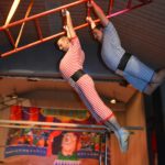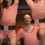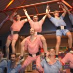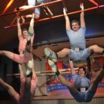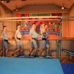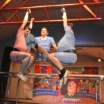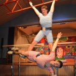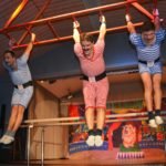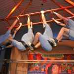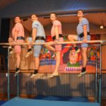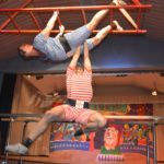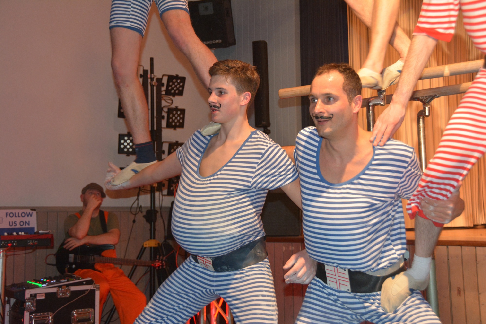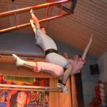 »Schwer« – »stark« – »männlich«: das waren die Attribute für die spektakuläre Luftnummer der Leistungsturner an der schwebenden Leiter. In ihrem gestreiften Turnanzug und mit dicken Bauch passte ihr äußeres Erscheinungsbild so gar nicht zu den Saltos und Schwebefiguren, die sie über den Köpfen des Publikums und direkt unter der Hallendecke präsentieren. Dabei bauten sie sich manches Luftschloss, bildeten Menschenschaukeln und ließen sogar die Glocken läuten. Klamauk und turnerisches Können ergänzten sich zu einer zirkusreifen Show, von der das begeisterte Publikum lautstark eine Zugabe forderte.