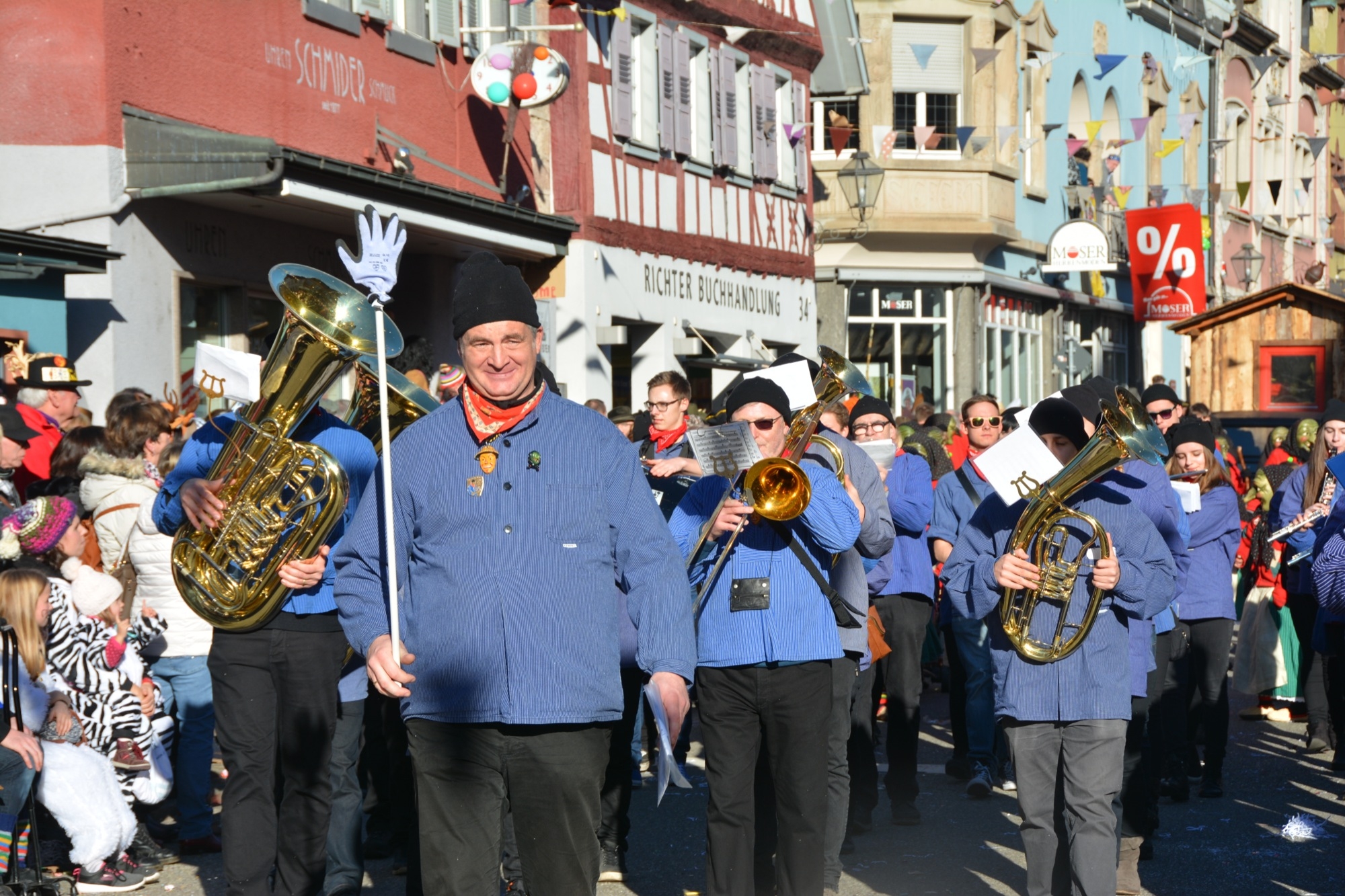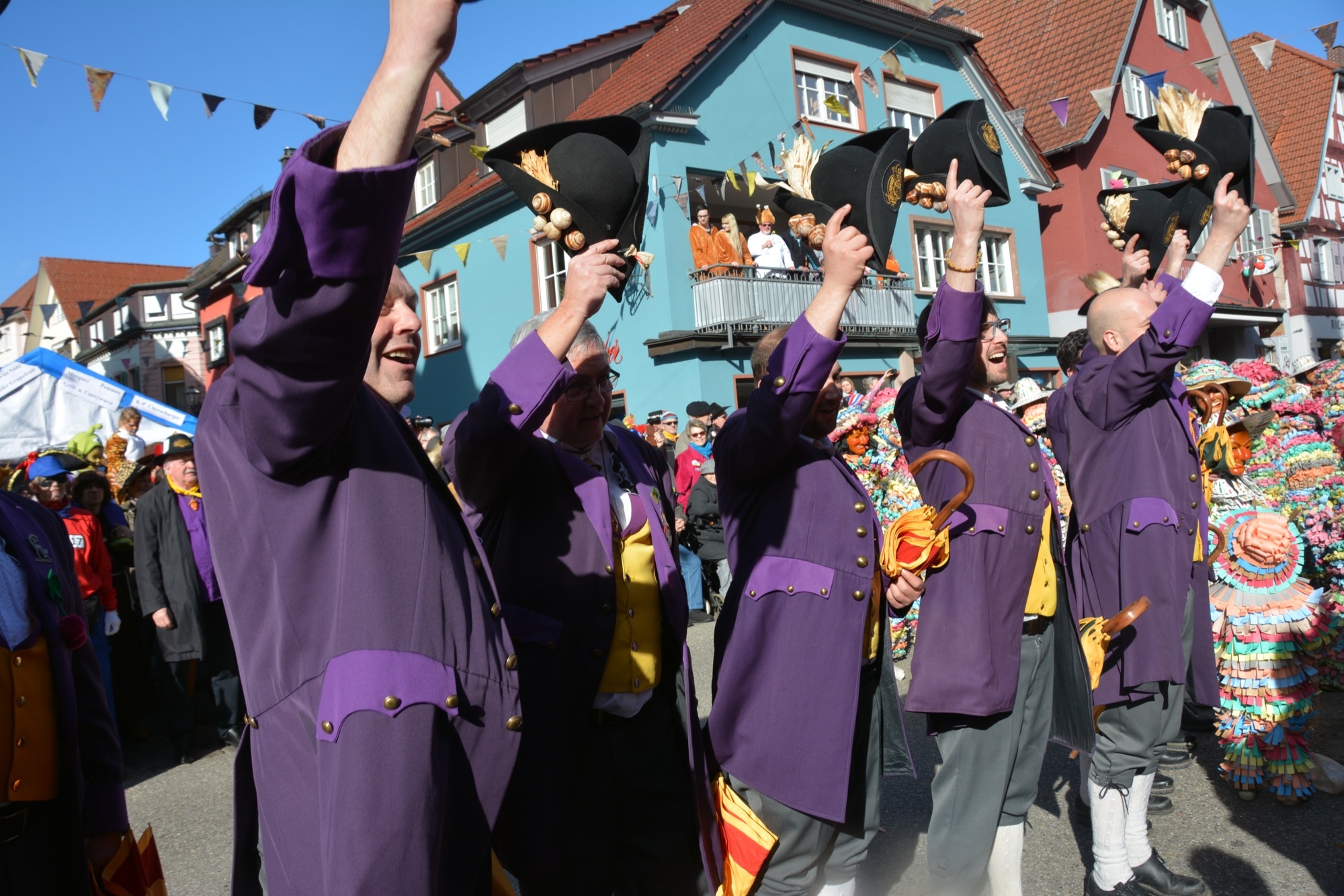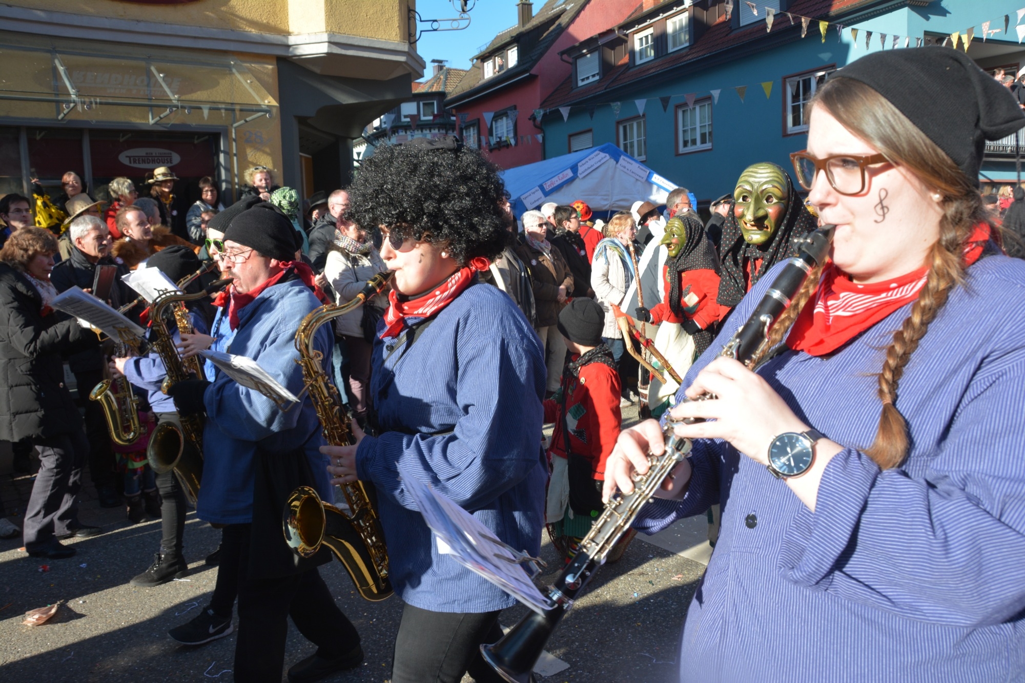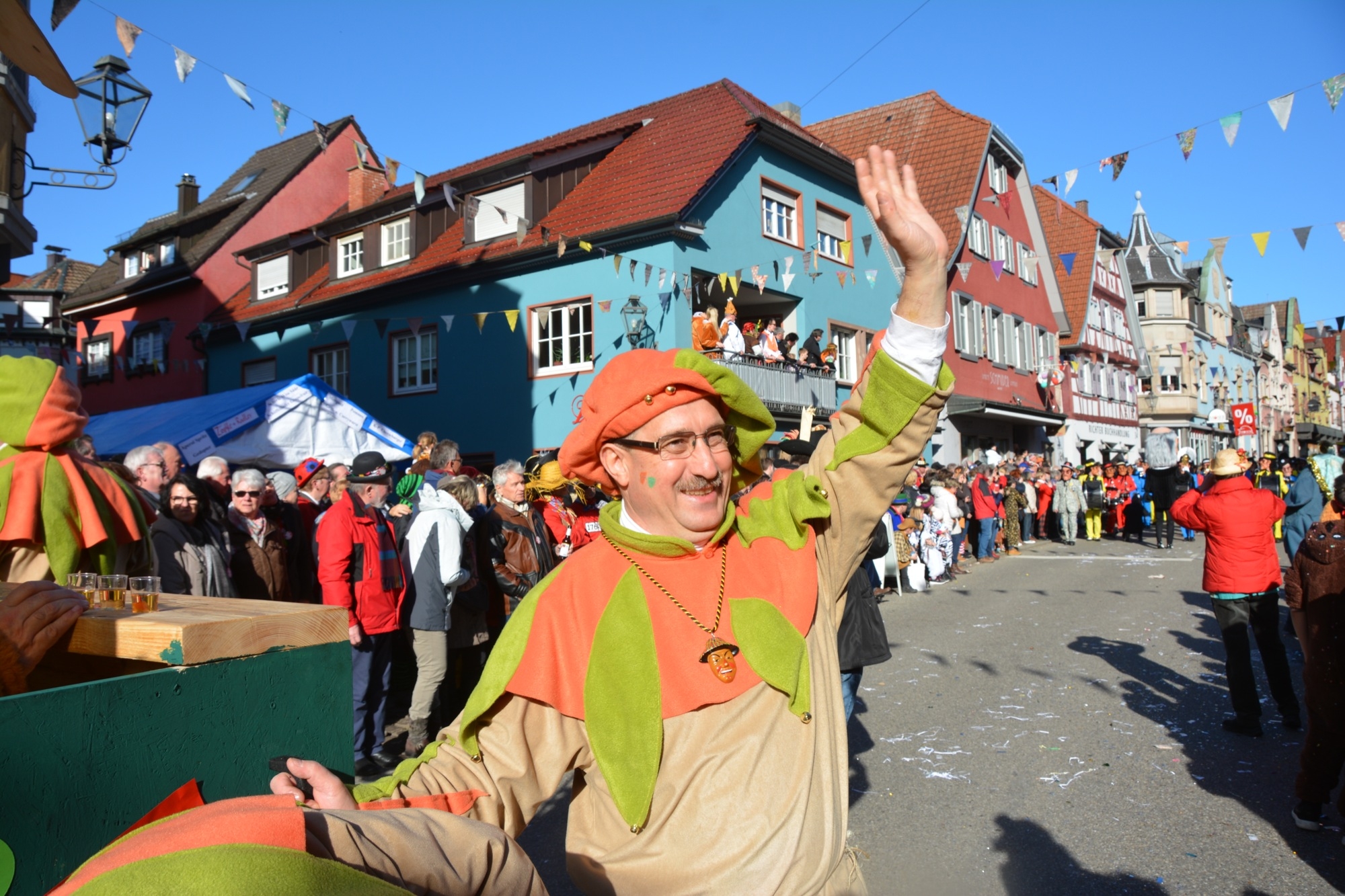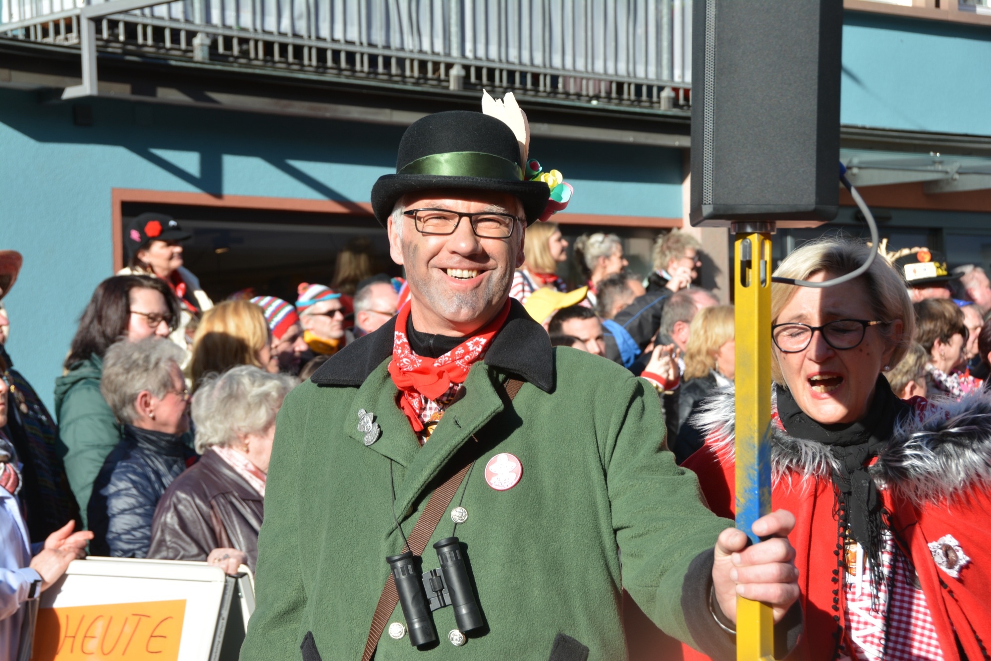Die Zeit, bis der Zug starten konnte, vertrieben anschließend den Zuschauern in Rathausnähe die Moderatoren Berthold Damm und Manfred Lehmann mit lustigem Geplauder, prominente Gäste und eine erste musikalischen Kostprobe der Basler Grachsymphoniker. Ein besonderes Willkommen galt der Freien Narrenzunft Wolfach, die nach fünf Jahren wieder am Zeller Umzug teilnahm, und der Bundestagsabgeordneten Kordula Kovac, ebenfalls aus Wolfach. Der Zeller Bürgermeister Pfundstein begrüßte das Narrenvolk mit »hoorig« und ließ es sich nicht nehmen, ein besonderes Paar aus Wiesbaden zu begrüßen, das er nicht nur letztes Jahr trauen durfte, sondern das auch – nach vielen Jahren der Urlaubstreue – endlich einmal die Zeller Fasend kennenlernen wollte.