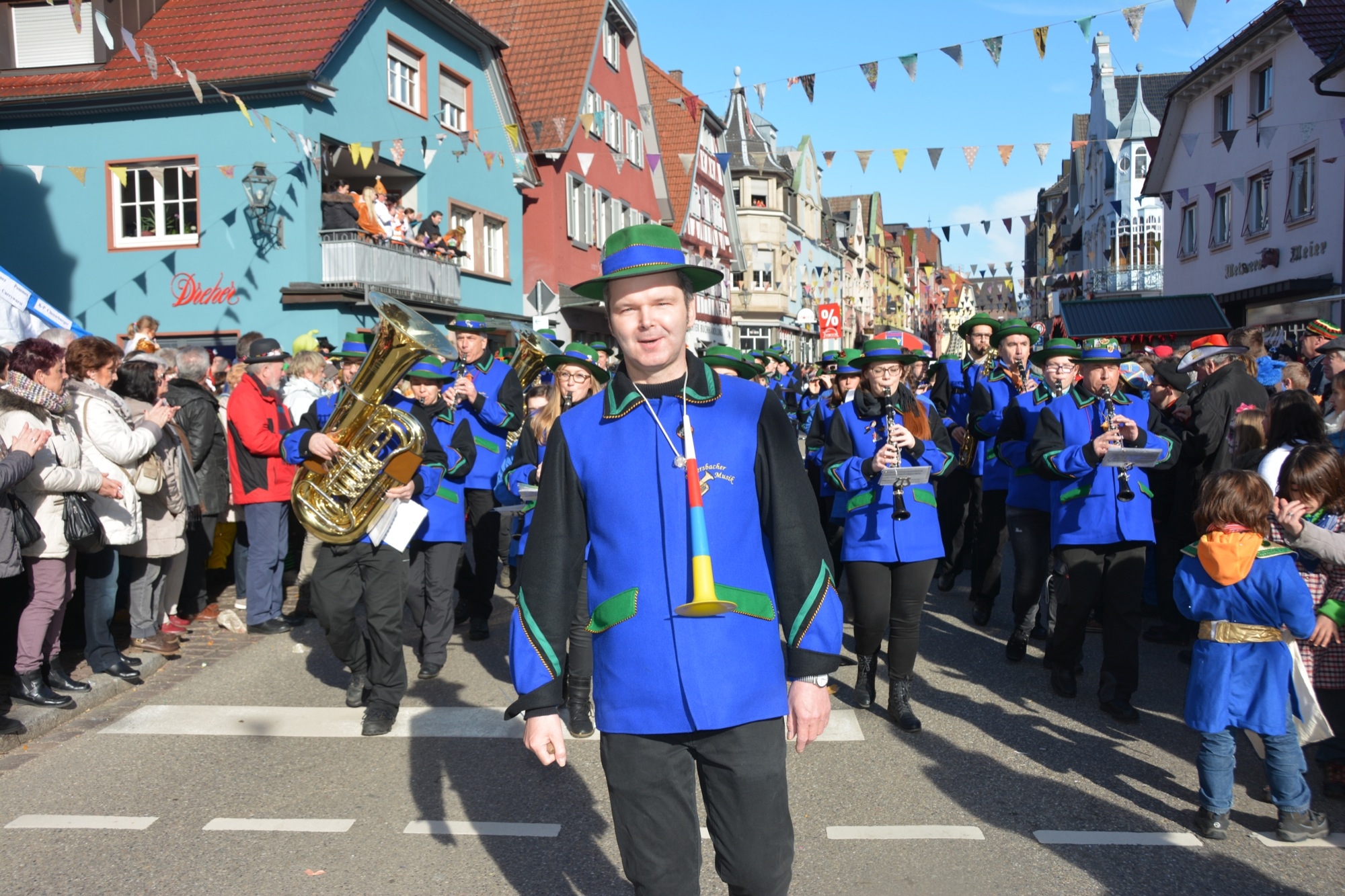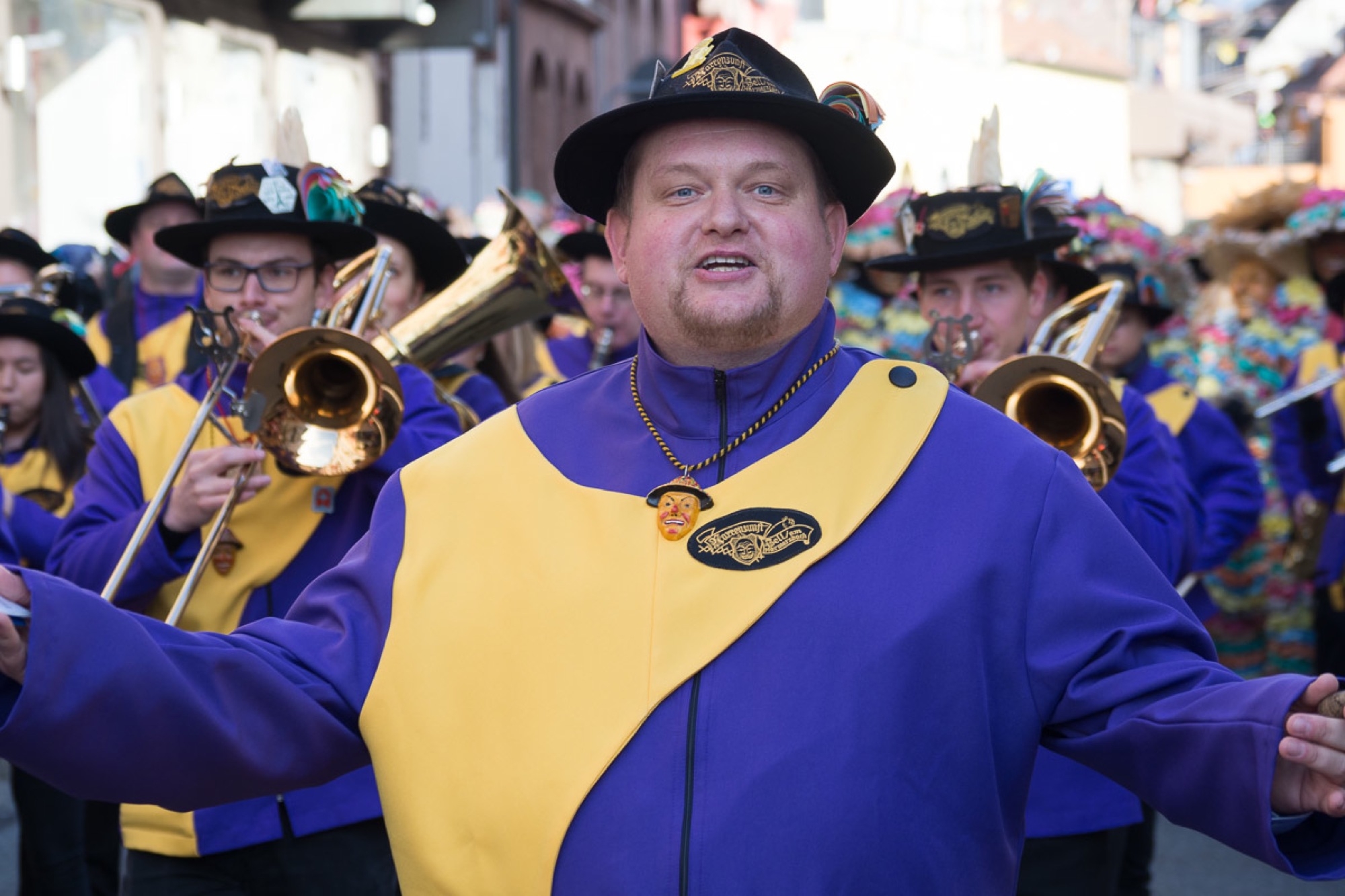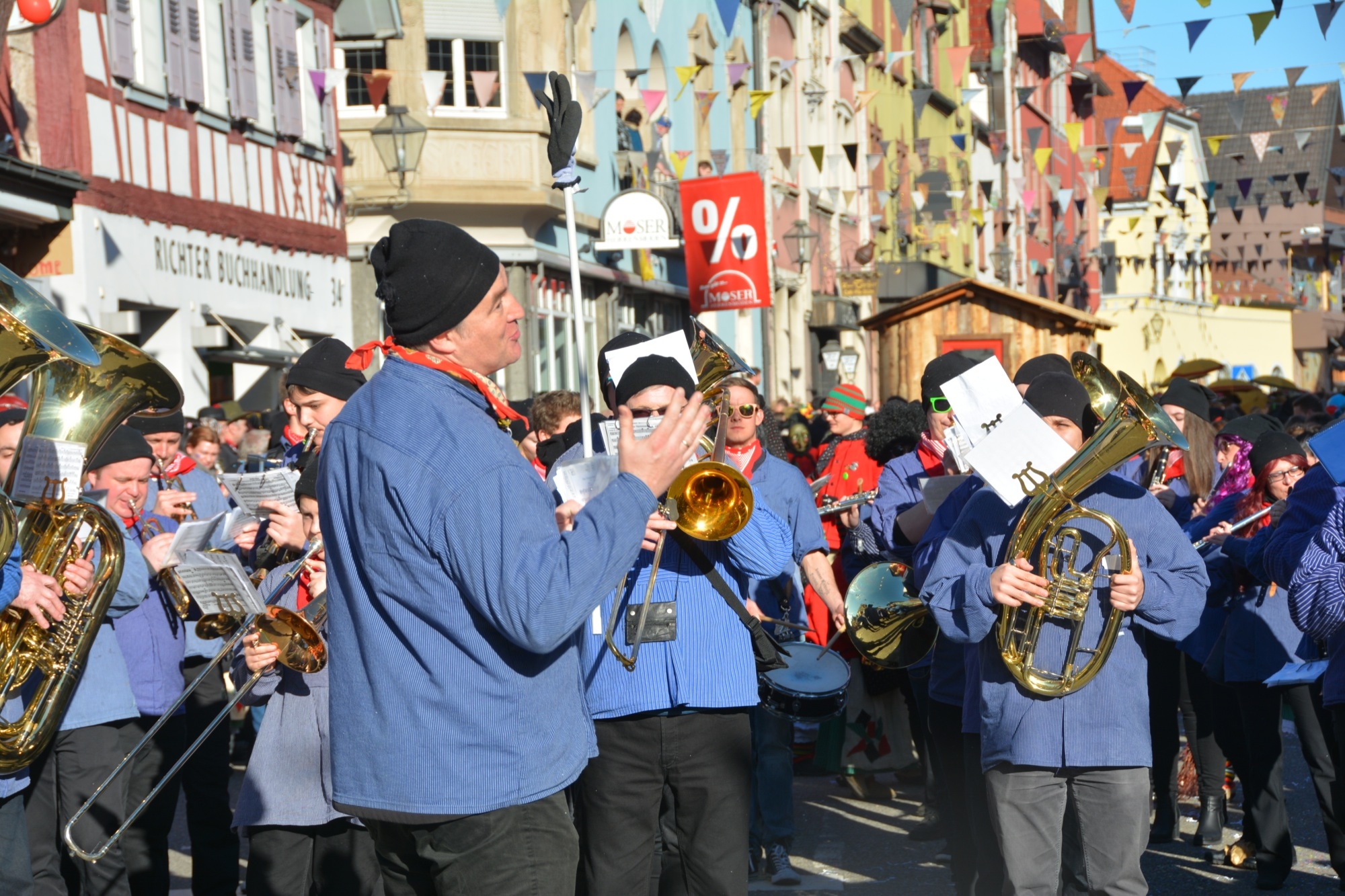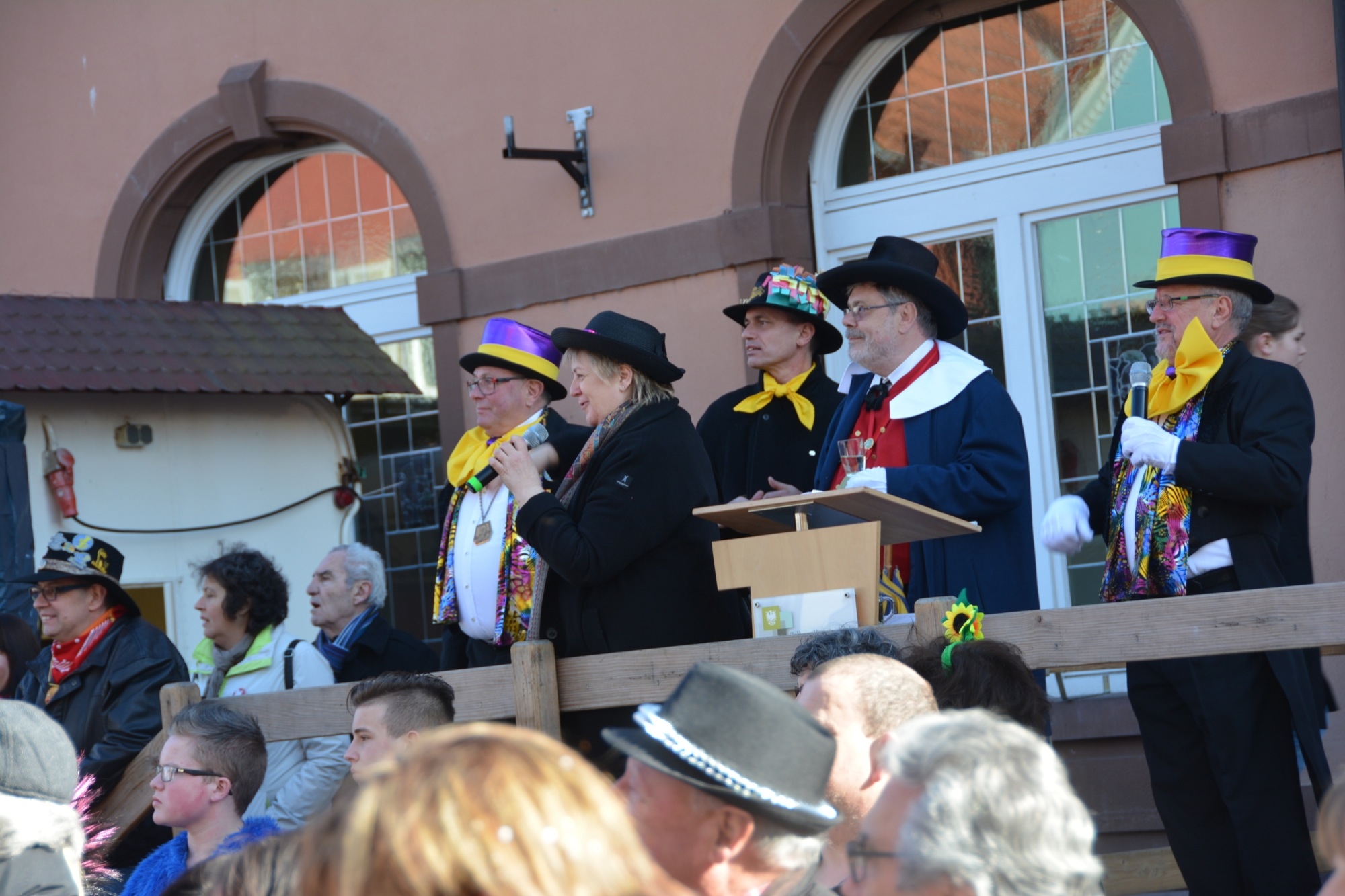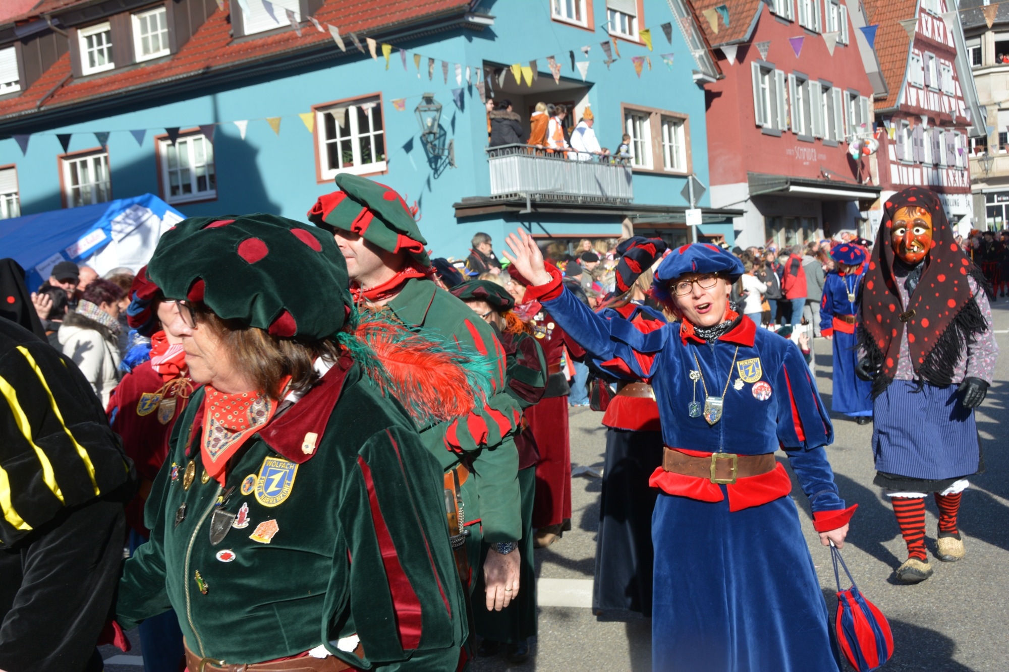 Die Zeit, bis der Zug starten konnte, vertrieben anschließend den Zuschauern in Rathausnähe die Moderatoren Berthold Damm und Manfred Lehmann mit lustigem Geplauder, prominente Gäste und eine erste musikalischen Kostprobe der Basler Grachsymphoniker. Ein besonderes Willkommen galt der Freien Narrenzunft Wolfach, die nach fünf Jahren wieder am Zeller Umzug teilnahm, und der Bundestagsabgeordneten Kordula Kovac, ebenfalls aus Wolfach. Der Zeller Bürgermeister Pfundstein begrüßte das Narrenvolk mit »hoorig« und ließ es sich nicht nehmen, ein besonderes Paar aus Wiesbaden zu begrüßen, das er nicht nur letztes Jahr trauen durfte, sondern das auch – nach vielen Jahren der Urlaubstreue – endlich einmal die Zeller Fasend kennenlernen wollte.