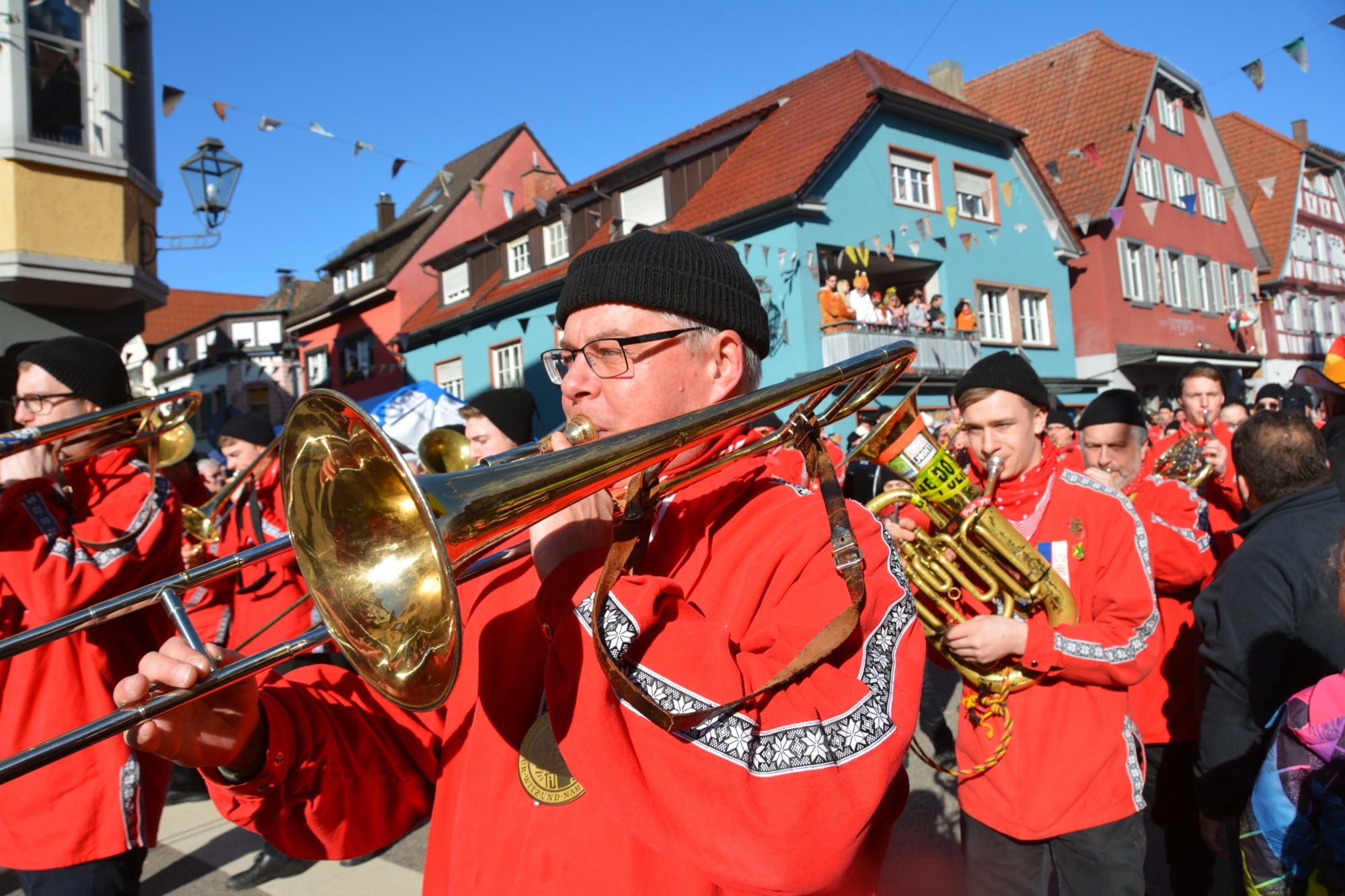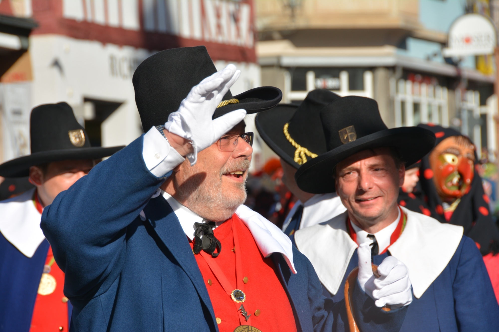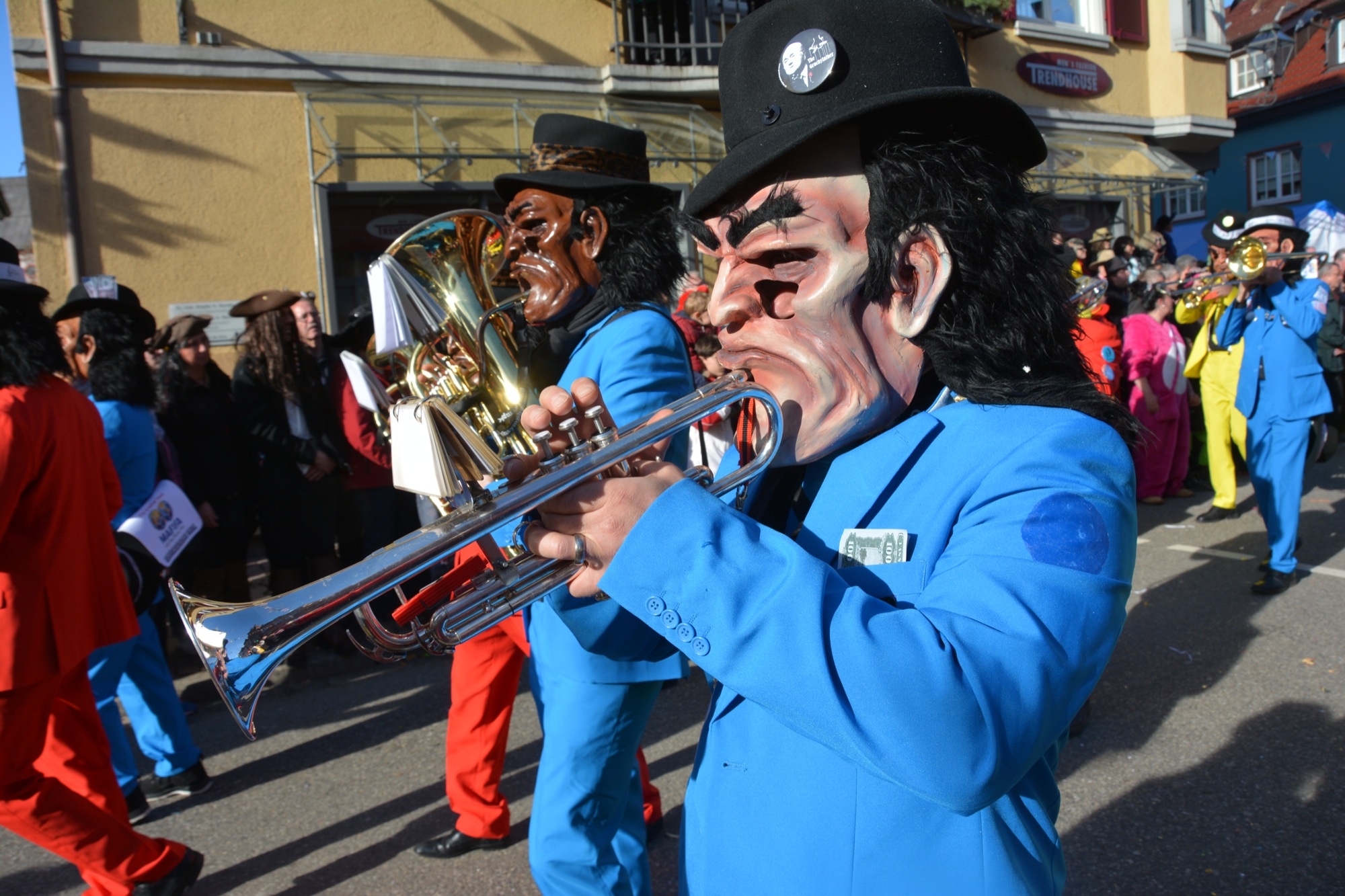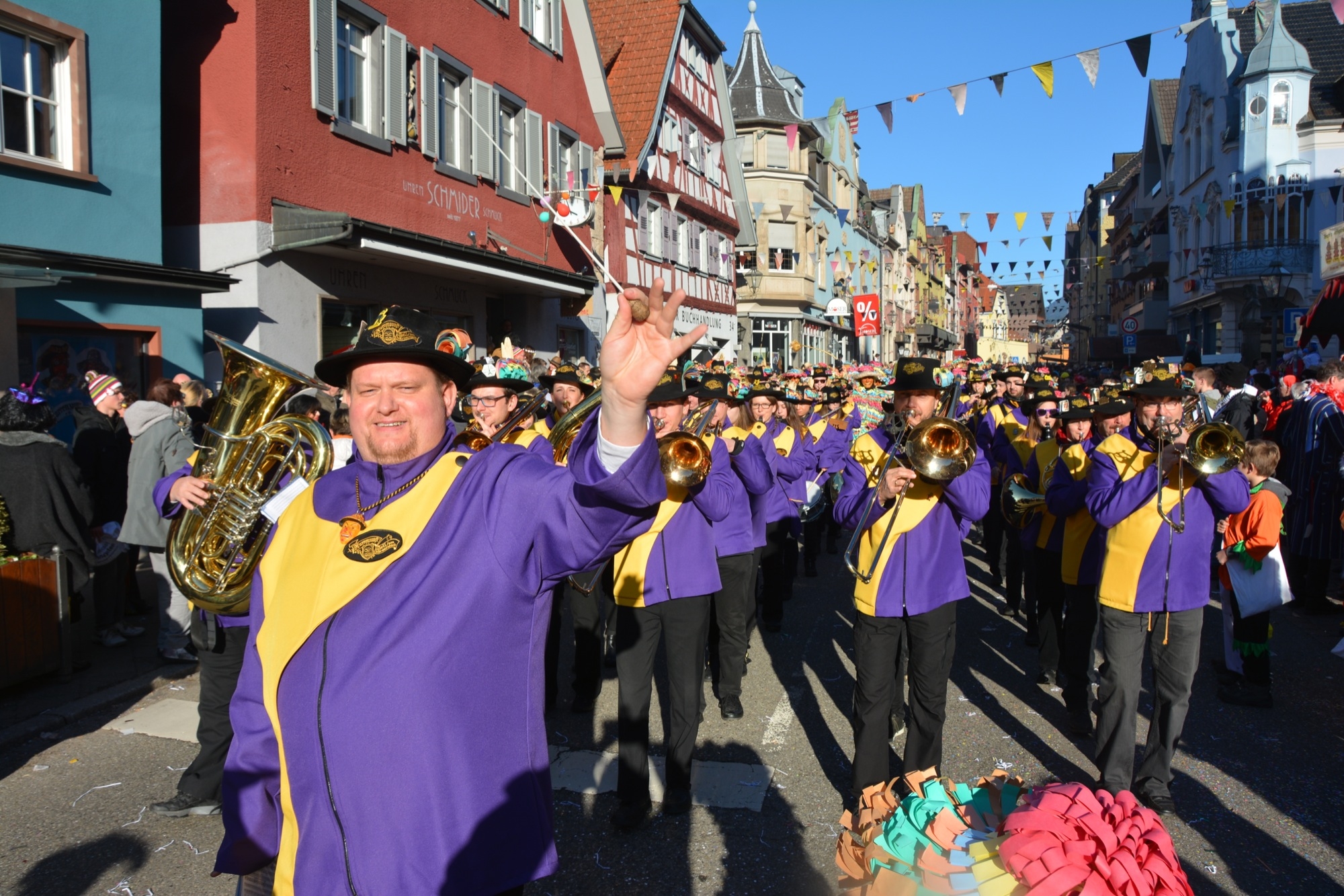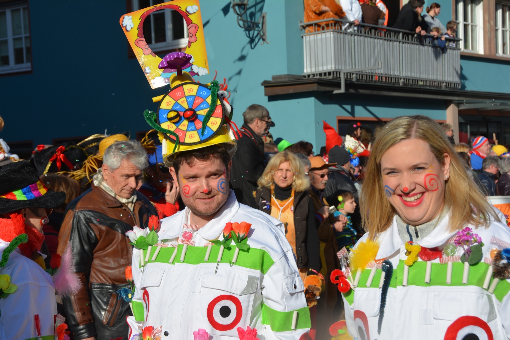 Die Zeit, bis der Zug starten konnte, vertrieben anschließend den Zuschauern in Rathausnähe die Moderatoren Berthold Damm und Manfred Lehmann mit lustigem Geplauder, prominente Gäste und eine erste musikalischen Kostprobe der Basler Grachsymphoniker. Ein besonderes Willkommen galt der Freien Narrenzunft Wolfach, die nach fünf Jahren wieder am Zeller Umzug teilnahm, und der Bundestagsabgeordneten Kordula Kovac, ebenfalls aus Wolfach. Der Zeller Bürgermeister Pfundstein begrüßte das Narrenvolk mit »hoorig« und ließ es sich nicht nehmen, ein besonderes Paar aus Wiesbaden zu begrüßen, das er nicht nur letztes Jahr trauen durfte, sondern das auch – nach vielen Jahren der Urlaubstreue – endlich einmal die Zeller Fasend kennenlernen wollte.