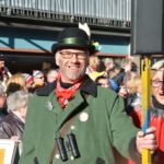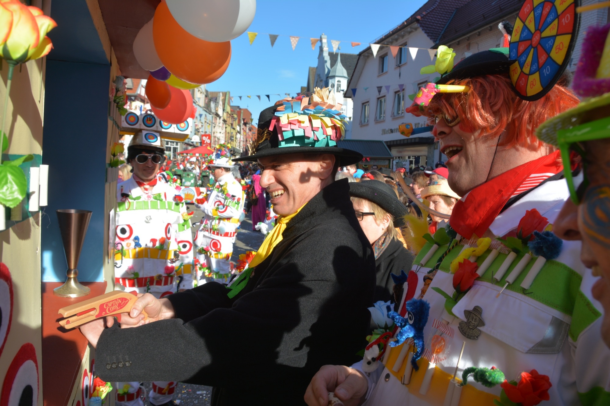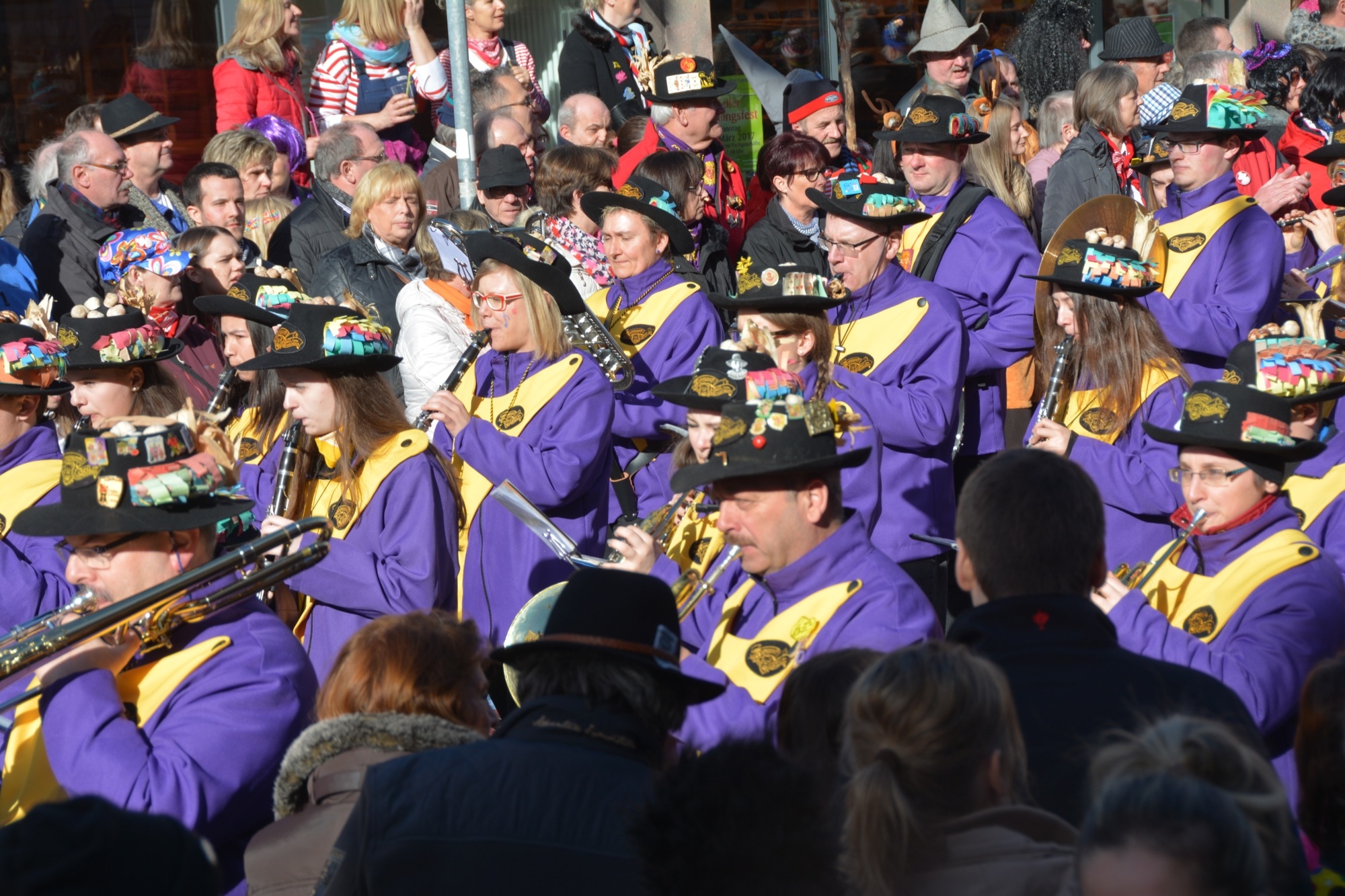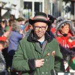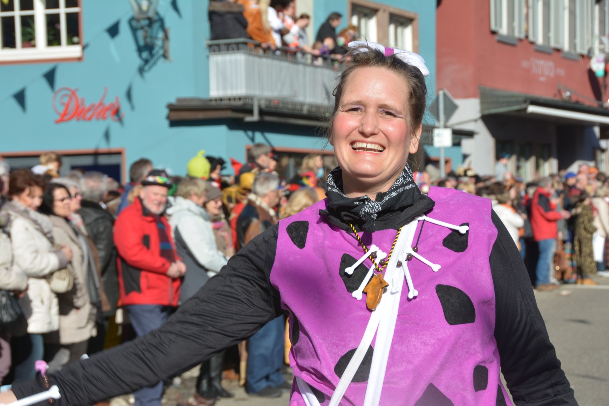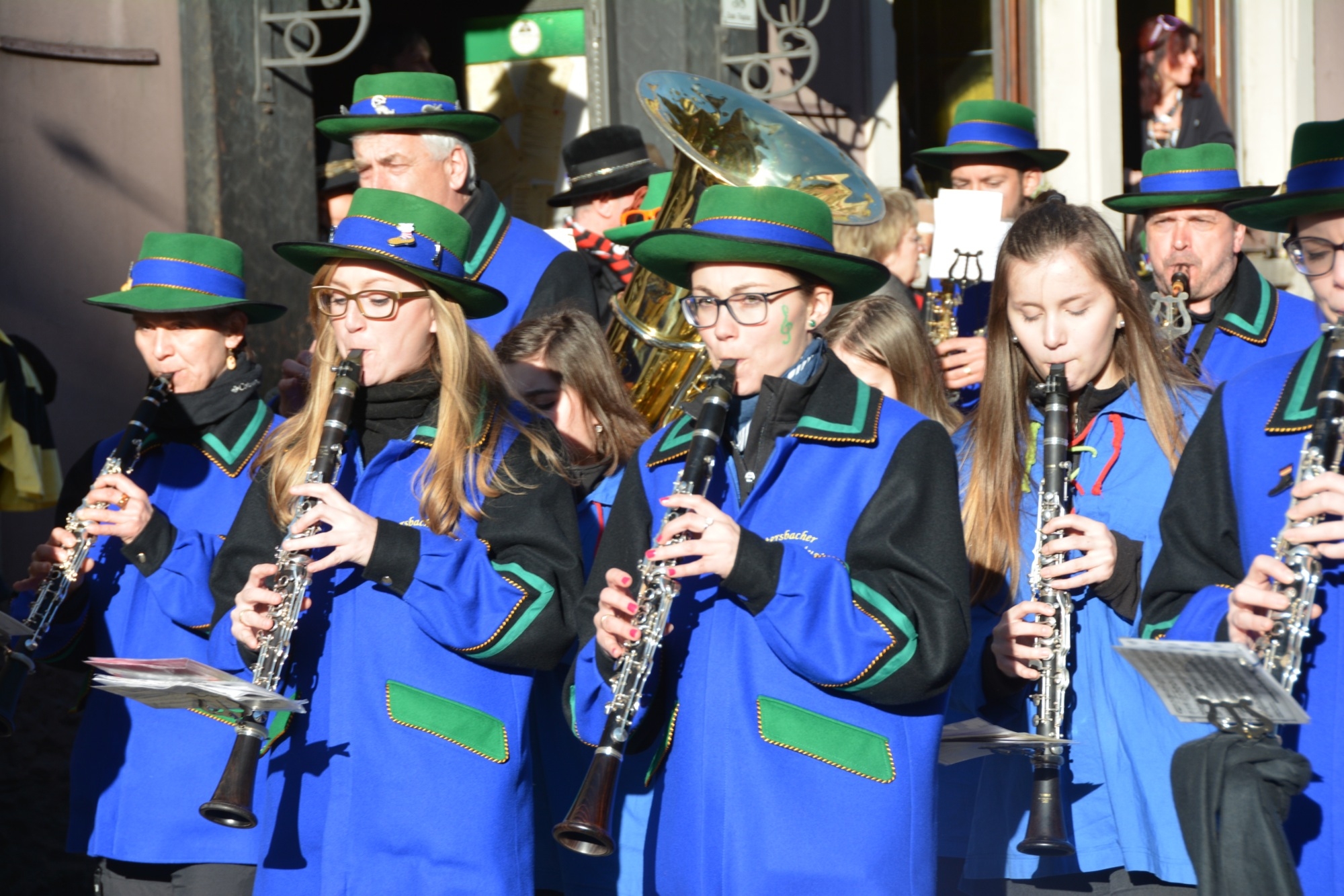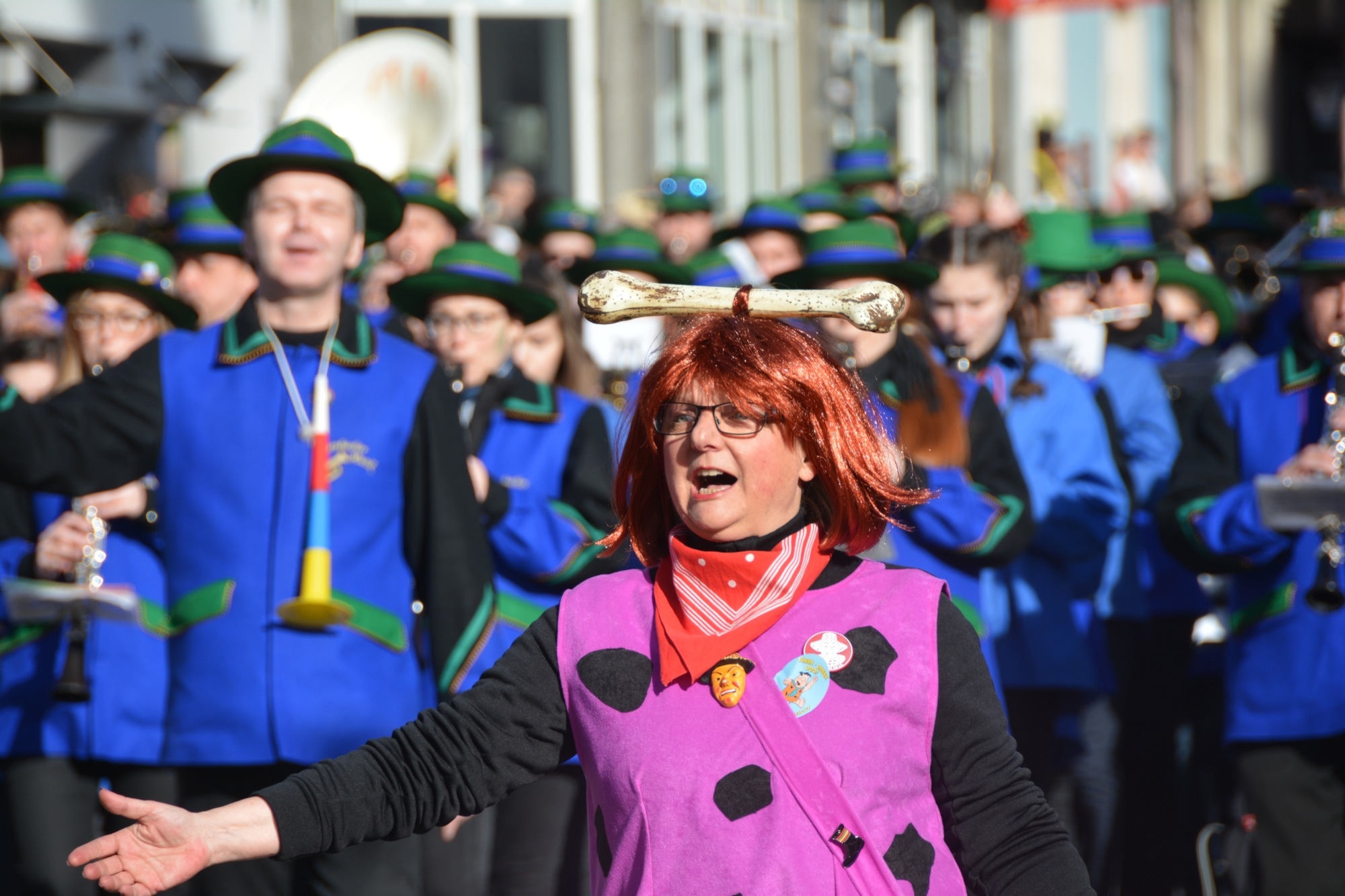 Die Zeit, bis der Zug starten konnte, vertrieben anschließend den Zuschauern in Rathausnähe die Moderatoren Berthold Damm und Manfred Lehmann mit lustigem Geplauder, prominente Gäste und eine erste musikalischen Kostprobe der Basler Grachsymphoniker. Ein besonderes Willkommen galt der Freien Narrenzunft Wolfach, die nach fünf Jahren wieder am Zeller Umzug teilnahm, und der Bundestagsabgeordneten Kordula Kovac, ebenfalls aus Wolfach. Der Zeller Bürgermeister Pfundstein begrüßte das Narrenvolk mit »hoorig« und ließ es sich nicht nehmen, ein besonderes Paar aus Wiesbaden zu begrüßen, das er nicht nur letztes Jahr trauen durfte, sondern das auch – nach vielen Jahren der Urlaubstreue – endlich einmal die Zeller Fasend kennenlernen wollte.