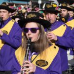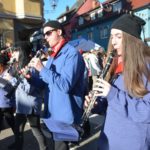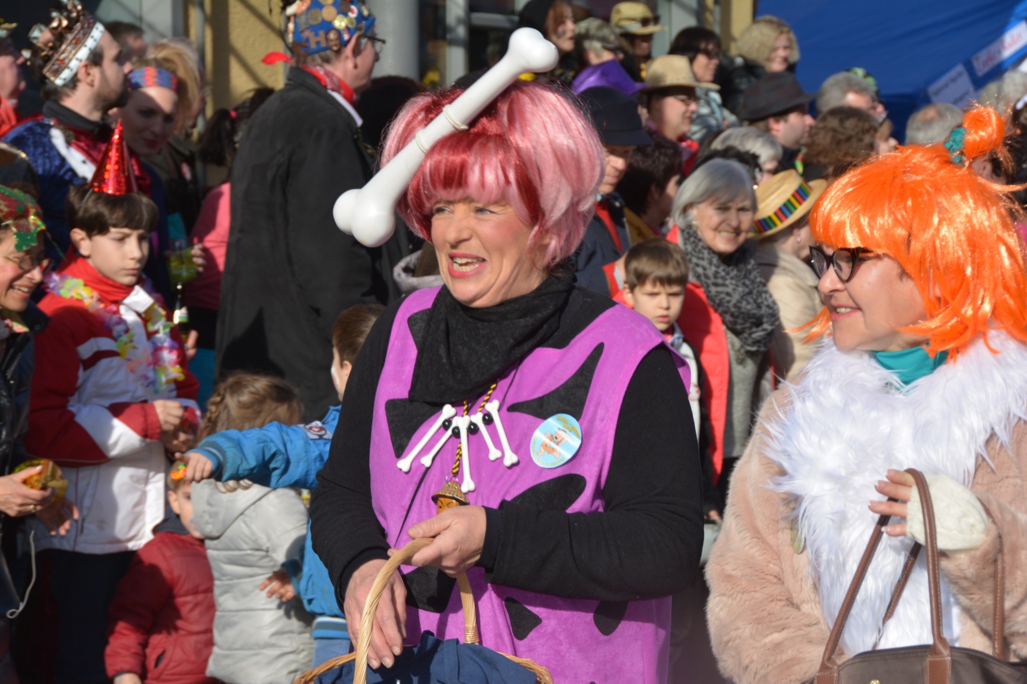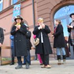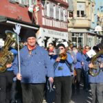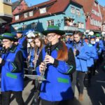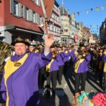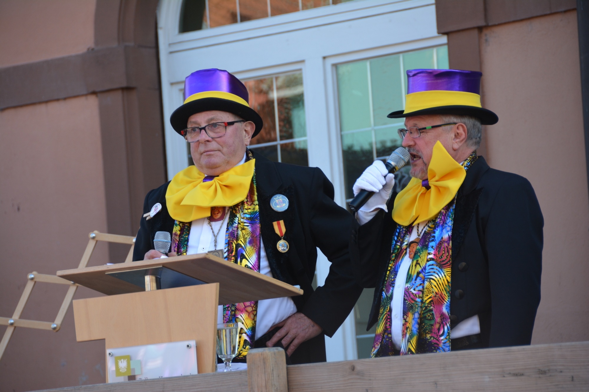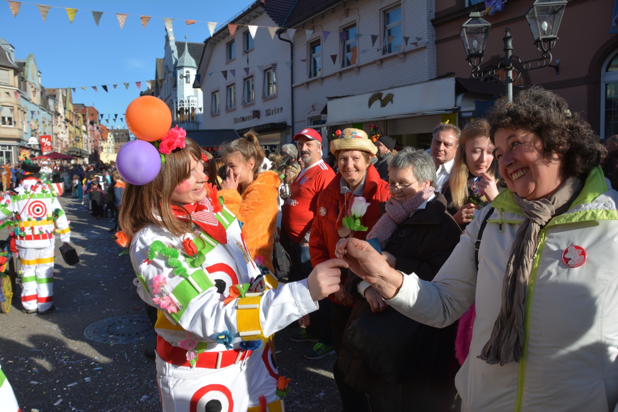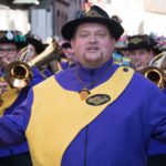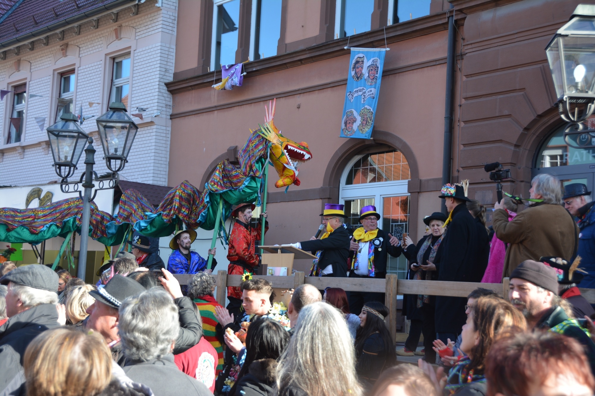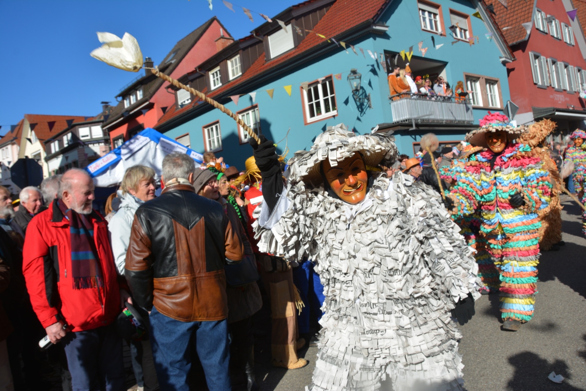 Die Zeit, bis der Zug starten konnte, vertrieben anschließend den Zuschauern in Rathausnähe die Moderatoren Berthold Damm und Manfred Lehmann mit lustigem Geplauder, prominente Gäste und eine erste musikalischen Kostprobe der Basler Grachsymphoniker. Ein besonderes Willkommen galt der Freien Narrenzunft Wolfach, die nach fünf Jahren wieder am Zeller Umzug teilnahm, und der Bundestagsabgeordneten Kordula Kovac, ebenfalls aus Wolfach. Der Zeller Bürgermeister Pfundstein begrüßte das Narrenvolk mit »hoorig« und ließ es sich nicht nehmen, ein besonderes Paar aus Wiesbaden zu begrüßen, das er nicht nur letztes Jahr trauen durfte, sondern das auch – nach vielen Jahren der Urlaubstreue – endlich einmal die Zeller Fasend kennenlernen wollte.