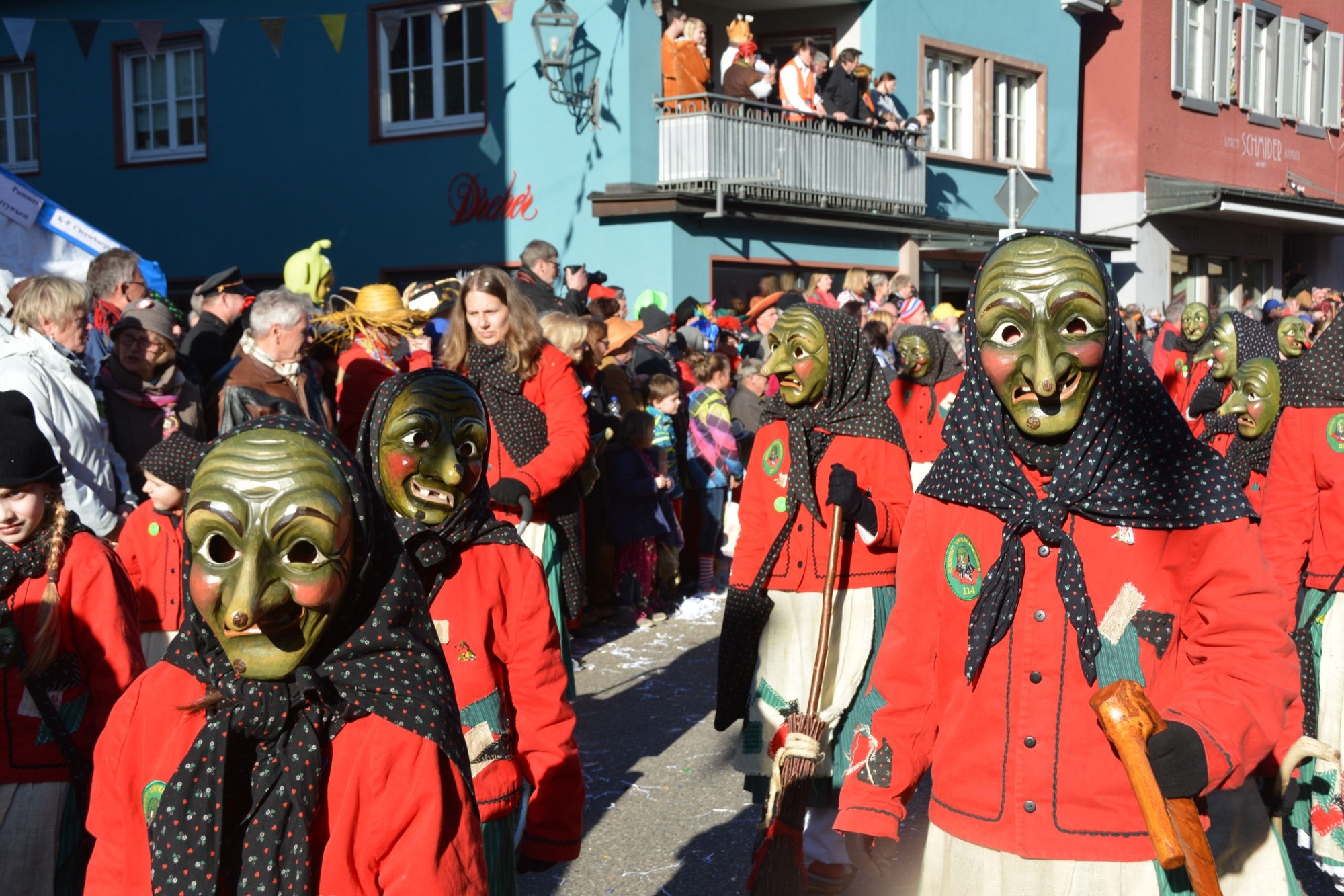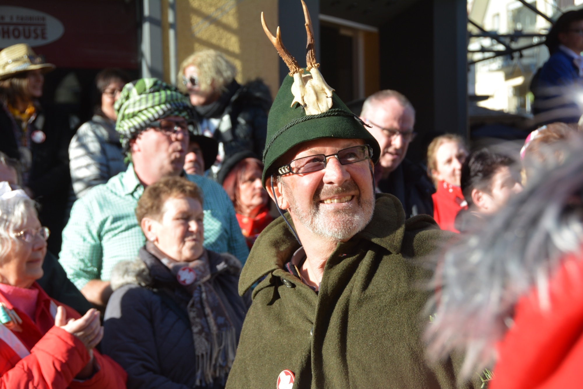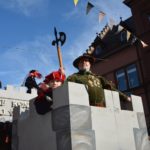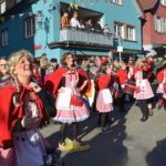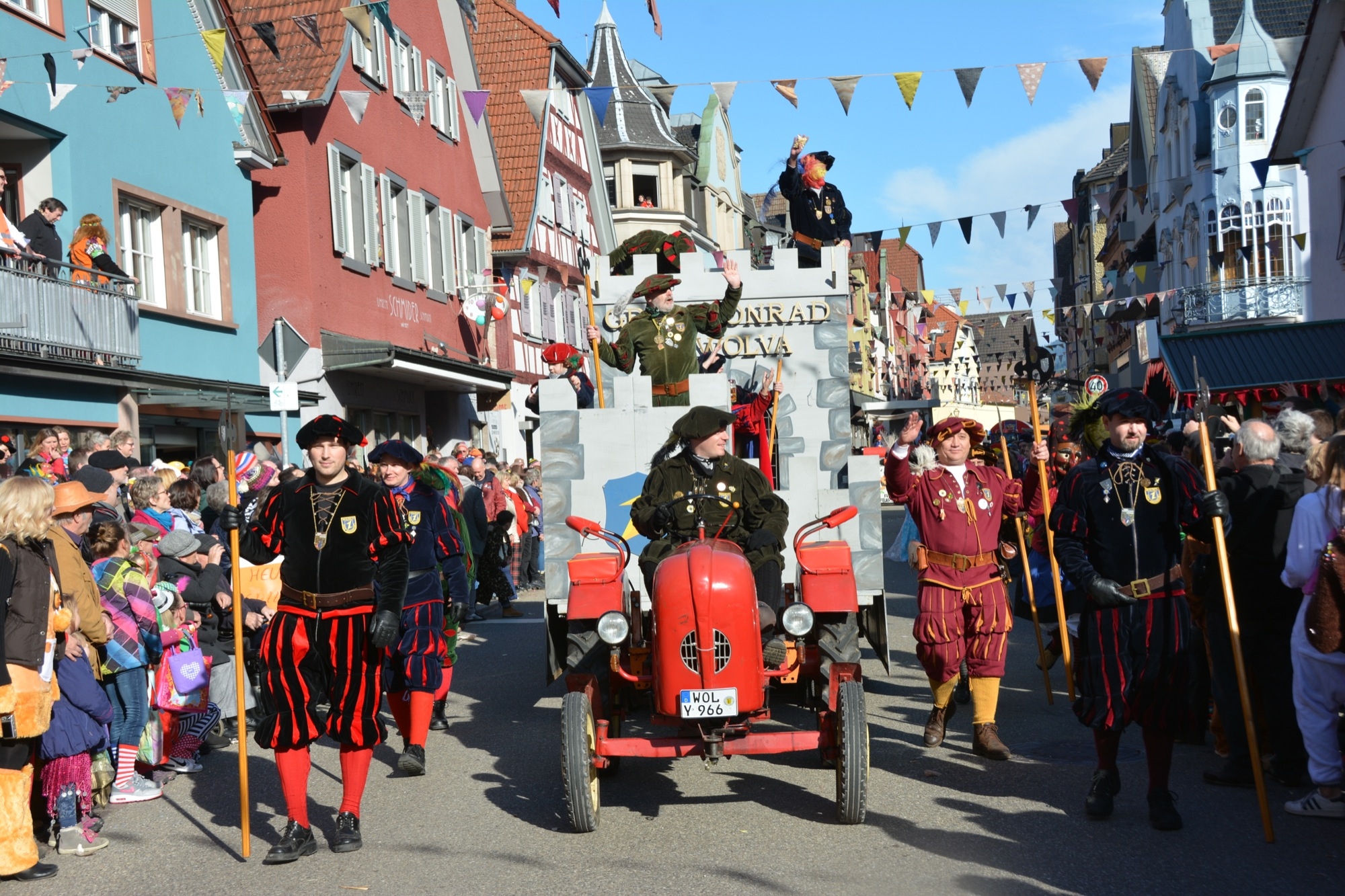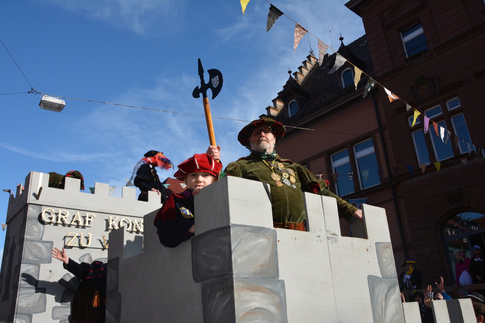 Den Anfang machte wie immer die Narrenzunft Zell am Harmersbach in eindrucksvoller Stärke. Ein toller Auftritt, wie hunderte Bändele minutenlang ihre Saublodere schwangen und die Spielkarten-Narros die Zuschauer mit ihrer Schere neckten! Dazu spielte die Stadtkapelle die Evergreens der Zeller Fasend. Es schloss sich die Freie Narrenzunft Wolfach an mit ihren Schellen-, Rösle- und Mehlwurmhansel, Nussschalenhansel und wie sie alle heißen. Sie ist mit den Zellern seit vielen Jahren freundschaftlich verbunden. Ebenfalls fester Bestandteil der Wolfacher Narretei: die Alde Rungunkeln – die, wie mehrmals betont wurde, keine Hexen darstellten, sondern alte Frauen. In Fall der Zeller Fasend 2017 waren es zugegebenermaßen recht fitte alte Weiber, denn sie schlichen kreuz und quer durchs Publikum, um die Zuschauer zu erschrecken. Eine Rungunkel kletterte mühelos auf den »Logenbalkon« über dem »Trendhaus«, um den Zuschauern dort einen unerwarteten Besuch abzustatten. Der Spielmannszug mit Landsknechten und Burgfrauen führte anschließend den in ein rotes Samtgewand gehüllten »Graf Konrad zu Wolfach« ein, dessen Kommen nicht zuletzt durch lautes Kanonenkrachen unüberhörbar war.
