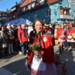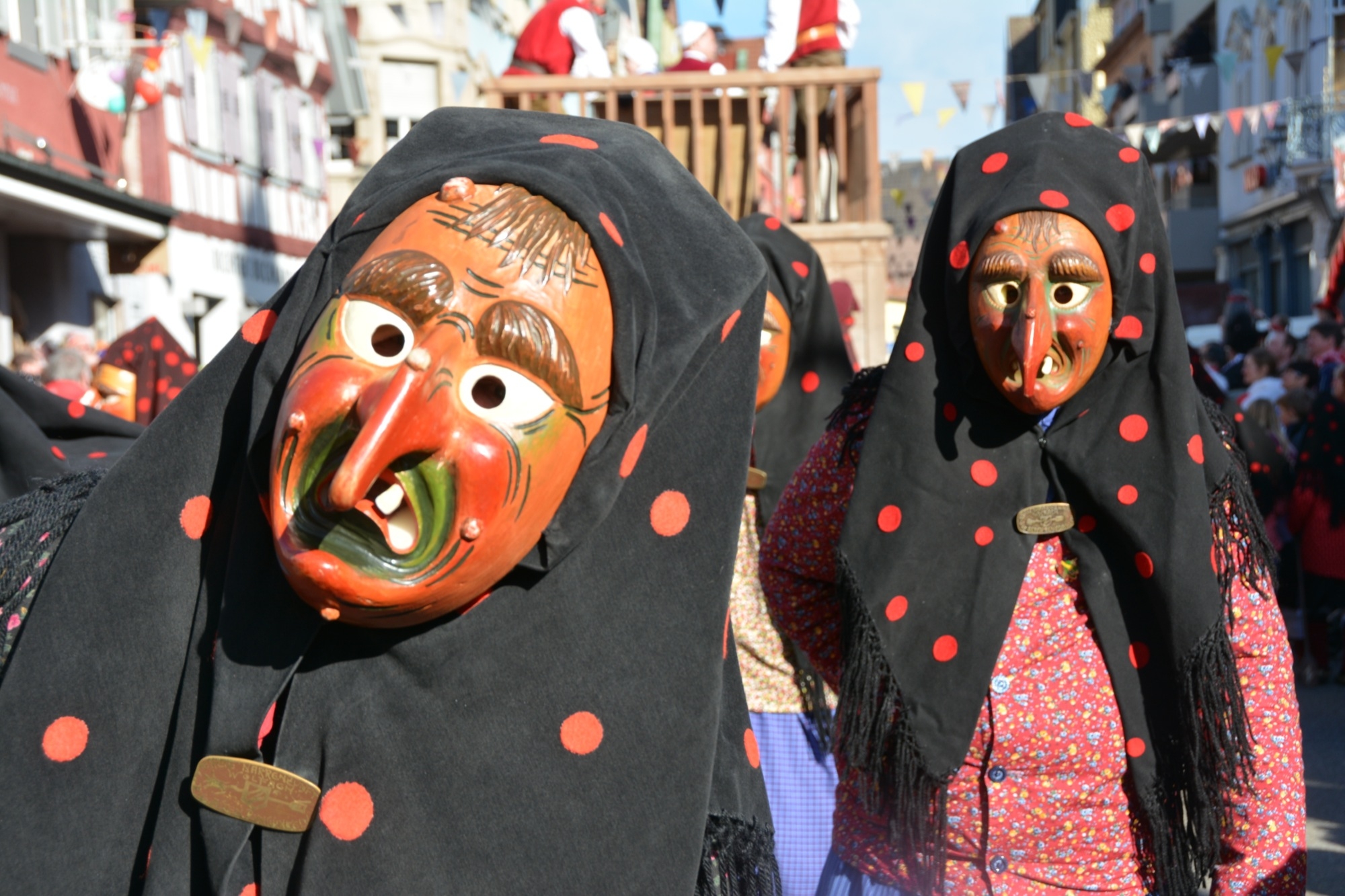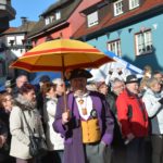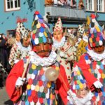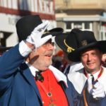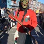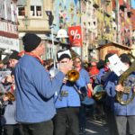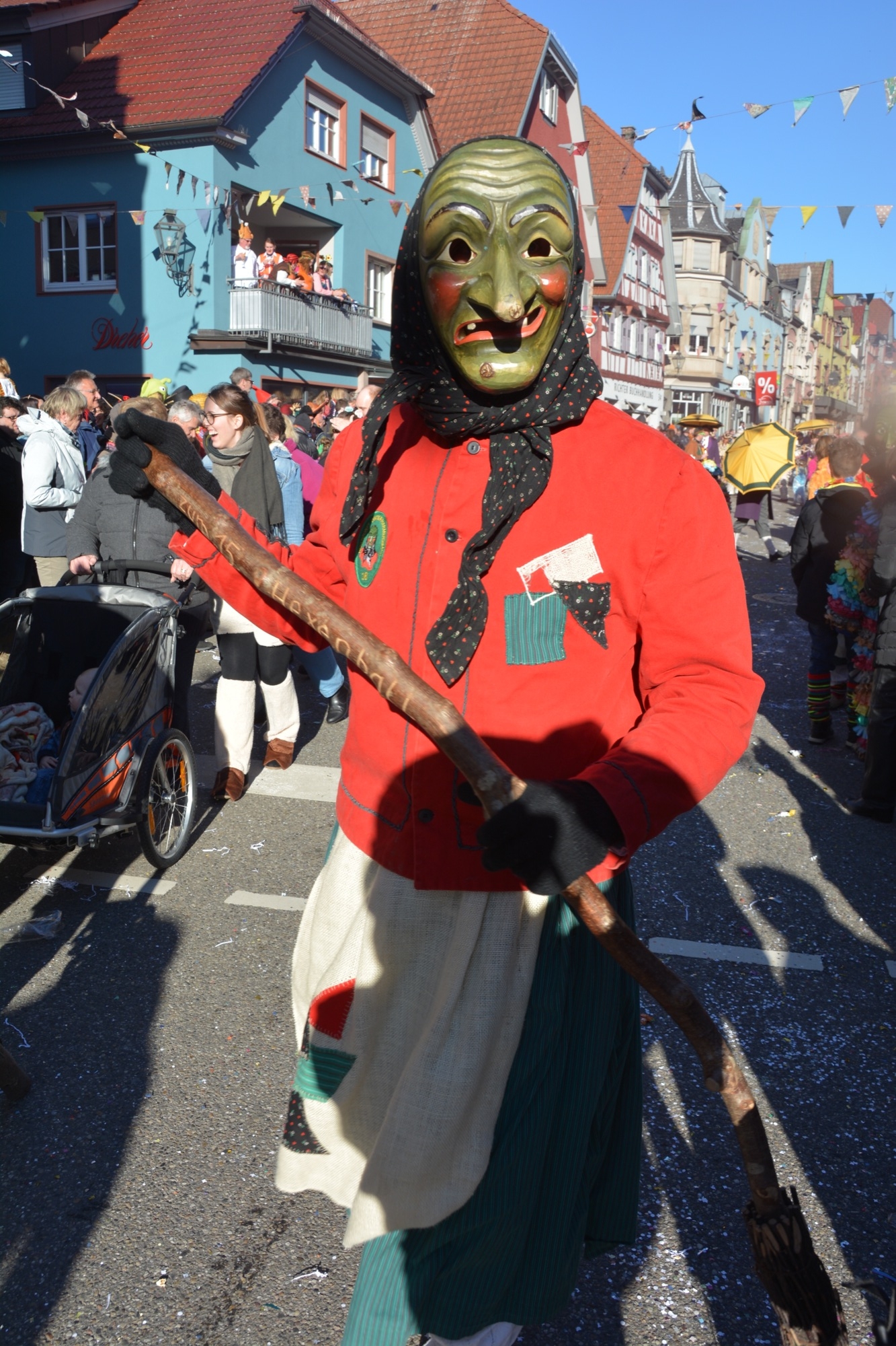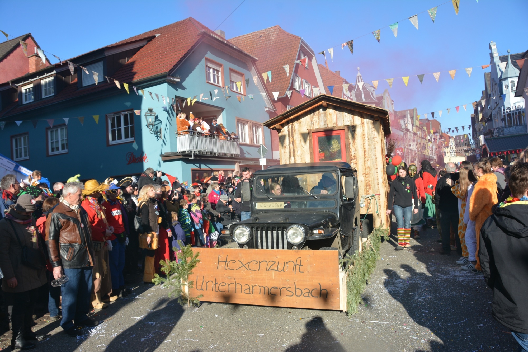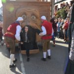 Den Anfang machte wie immer die Narrenzunft Zell am Harmersbach in eindrucksvoller Stärke. Ein toller Auftritt, wie hunderte Bändele minutenlang ihre Saublodere schwangen und die Spielkarten-Narros die Zuschauer mit ihrer Schere neckten! Dazu spielte die Stadtkapelle die Evergreens der Zeller Fasend. Es schloss sich die Freie Narrenzunft Wolfach an mit ihren Schellen-, Rösle- und Mehlwurmhansel, Nussschalenhansel und wie sie alle heißen. Sie ist mit den Zellern seit vielen Jahren freundschaftlich verbunden. Ebenfalls fester Bestandteil der Wolfacher Narretei: die Alde Rungunkeln – die, wie mehrmals betont wurde, keine Hexen darstellten, sondern alte Frauen. In Fall der Zeller Fasend 2017 waren es zugegebenermaßen recht fitte alte Weiber, denn sie schlichen kreuz und quer durchs Publikum, um die Zuschauer zu erschrecken. Eine Rungunkel kletterte mühelos auf den »Logenbalkon« über dem »Trendhaus«, um den Zuschauern dort einen unerwarteten Besuch abzustatten. Der Spielmannszug mit Landsknechten und Burgfrauen führte anschließend den in ein rotes Samtgewand gehüllten »Graf Konrad zu Wolfach« ein, dessen Kommen nicht zuletzt durch lautes Kanonenkrachen unüberhörbar war.