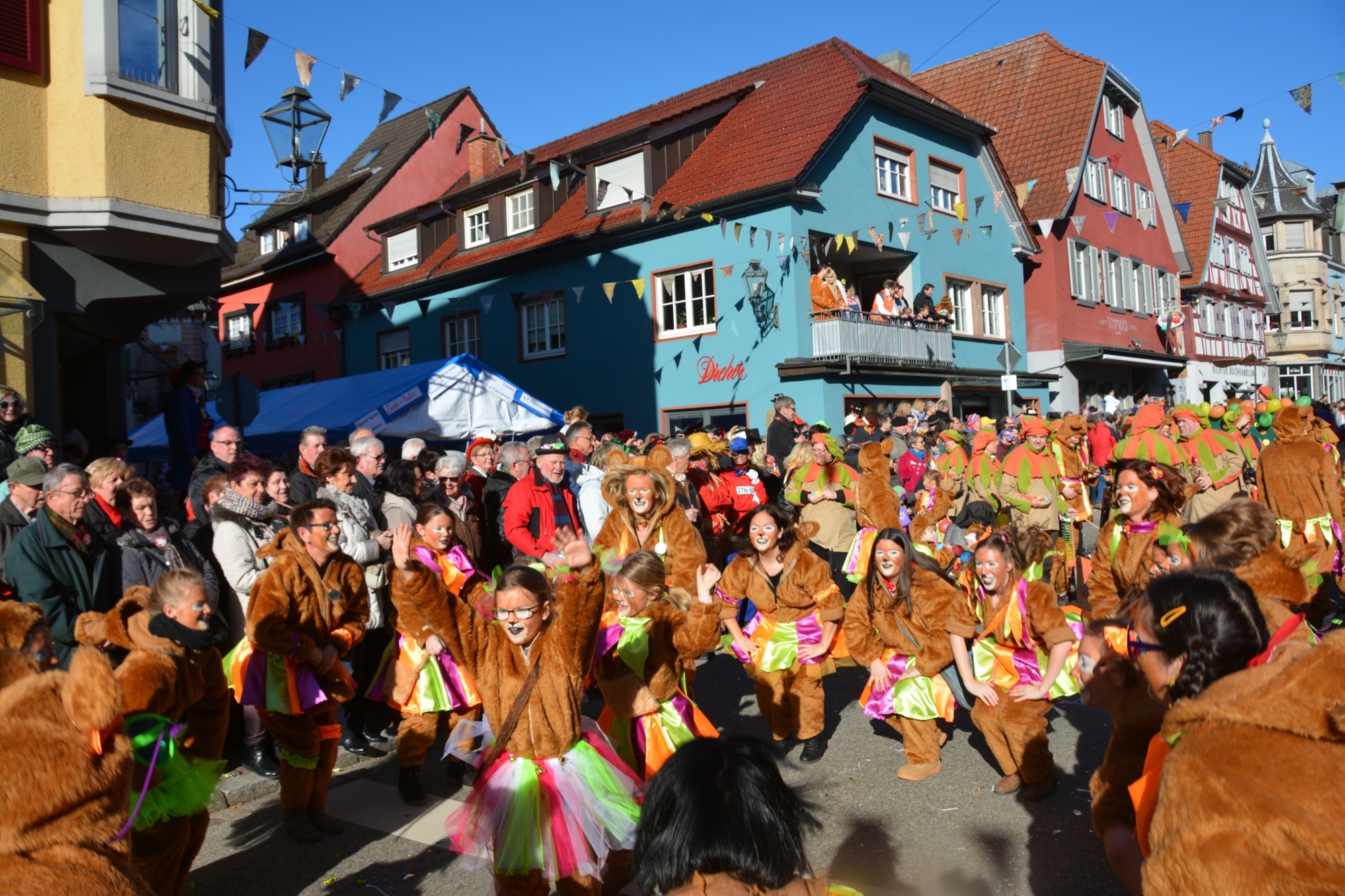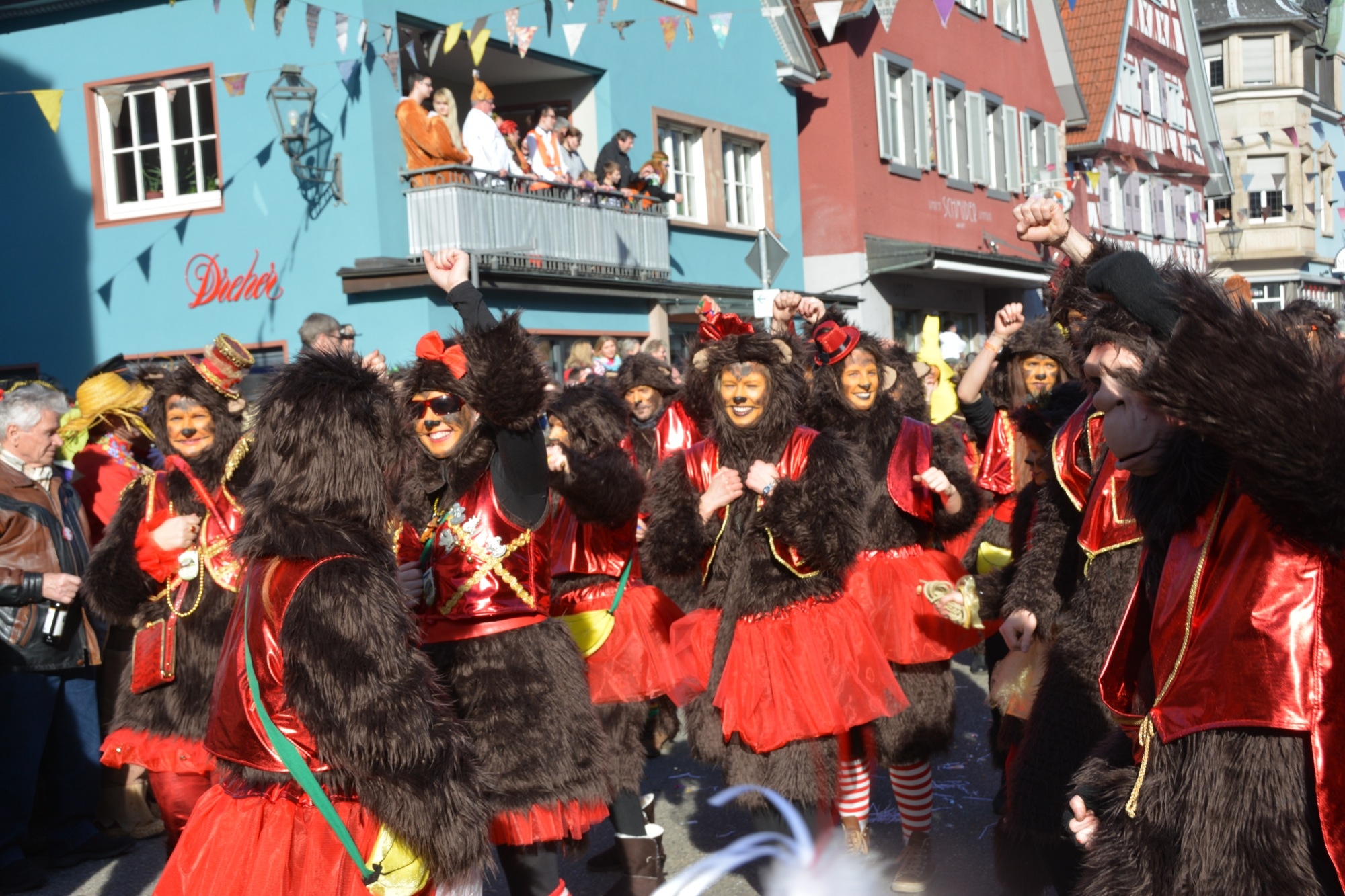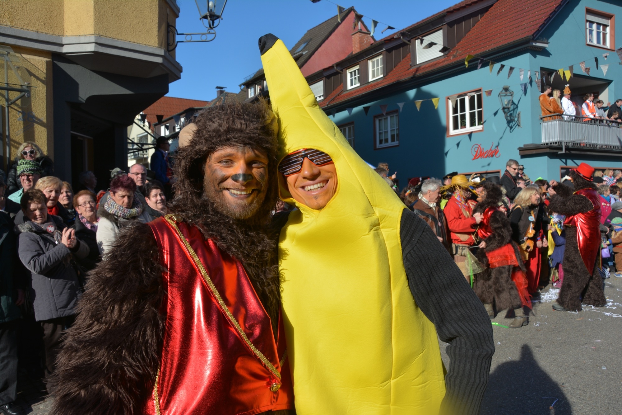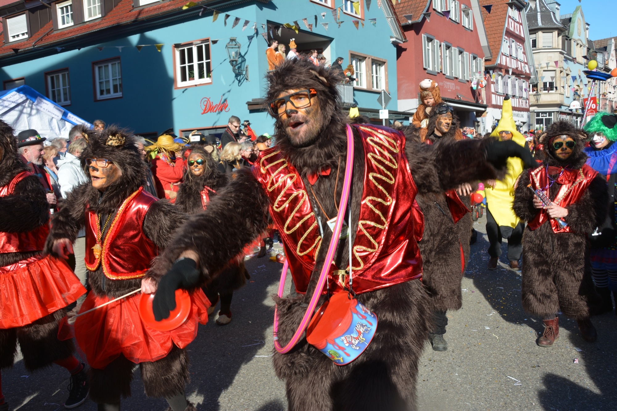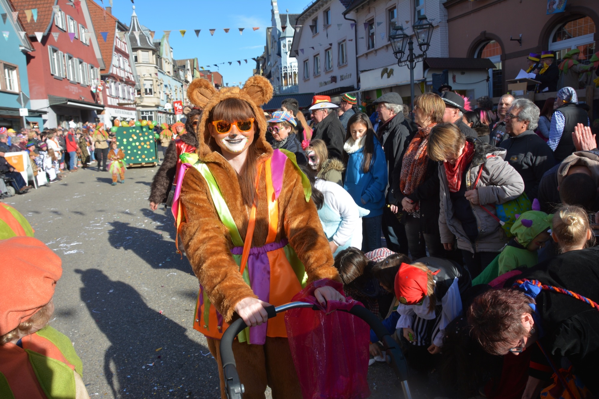 Der »Bruch« lud zum Affenzirkus ein. Als Affen und Bananen verkleidet tanzten durch die Straße, die »Bruch«-Kinder waren zum Teil auf Skate- und Hoverboards unterwegs. Überhaupt: Tiere waren das große Thema in diesem Umzug, denn auch das »Städtle« setzte das Motto tierisch um. Der Slogan »Im Städtle läuft de Bär om Gaukler hinterher« war Programm. Bei dieser Gruppe gab es tanzende Bären und Gaukler zu bestaunen.