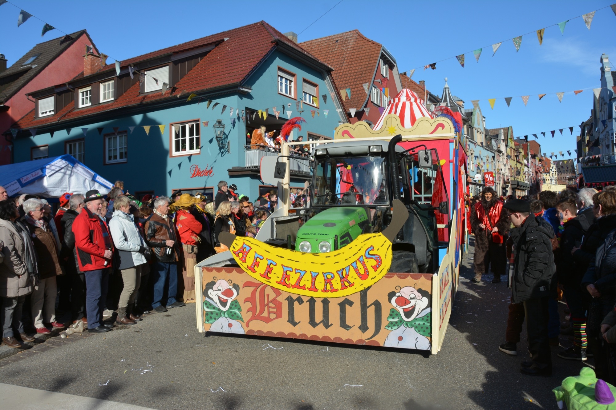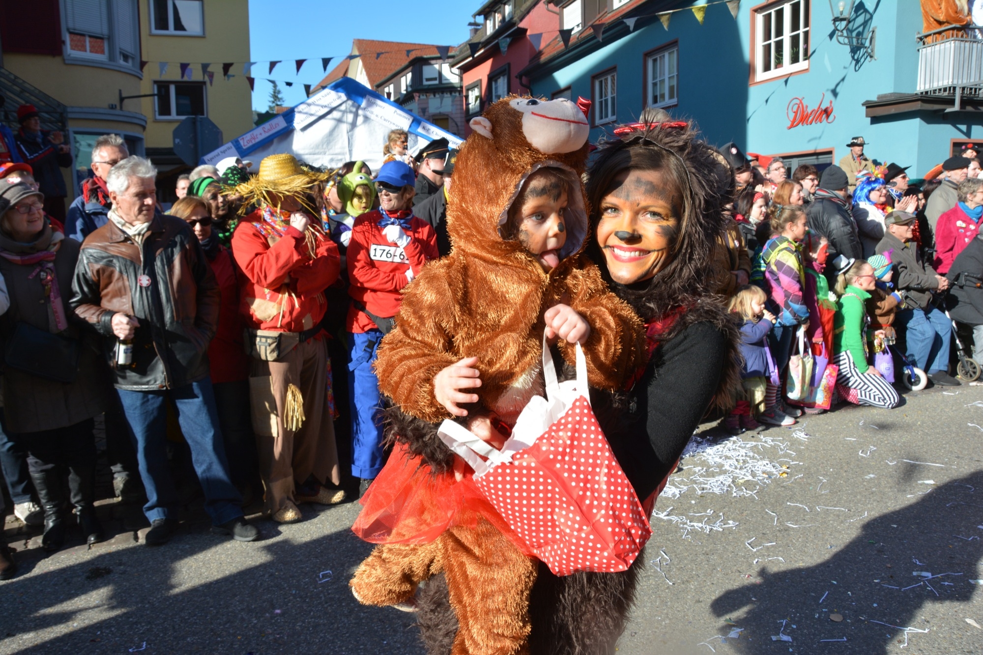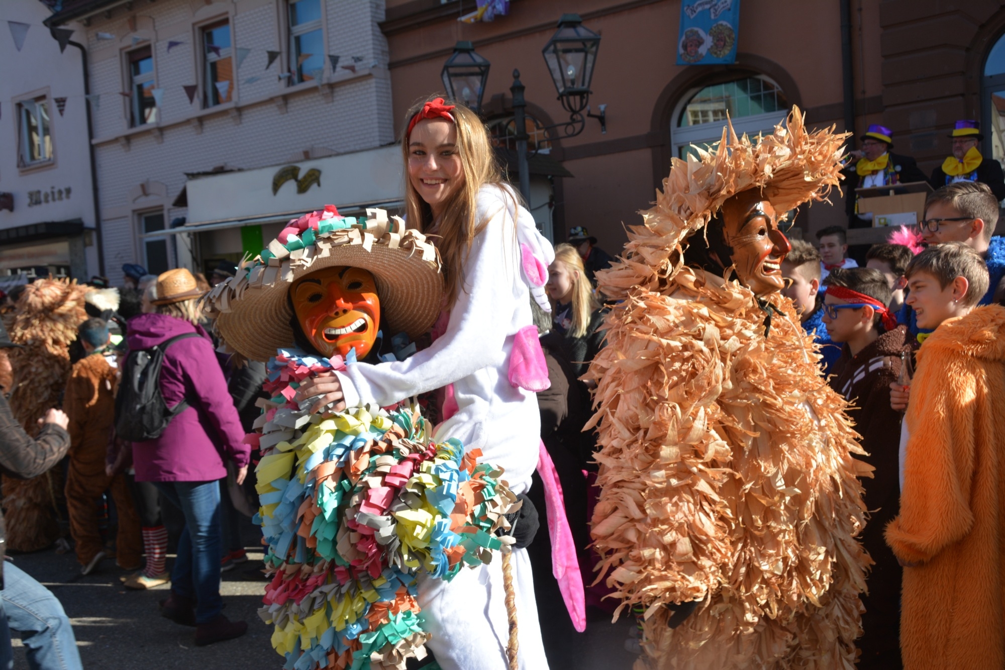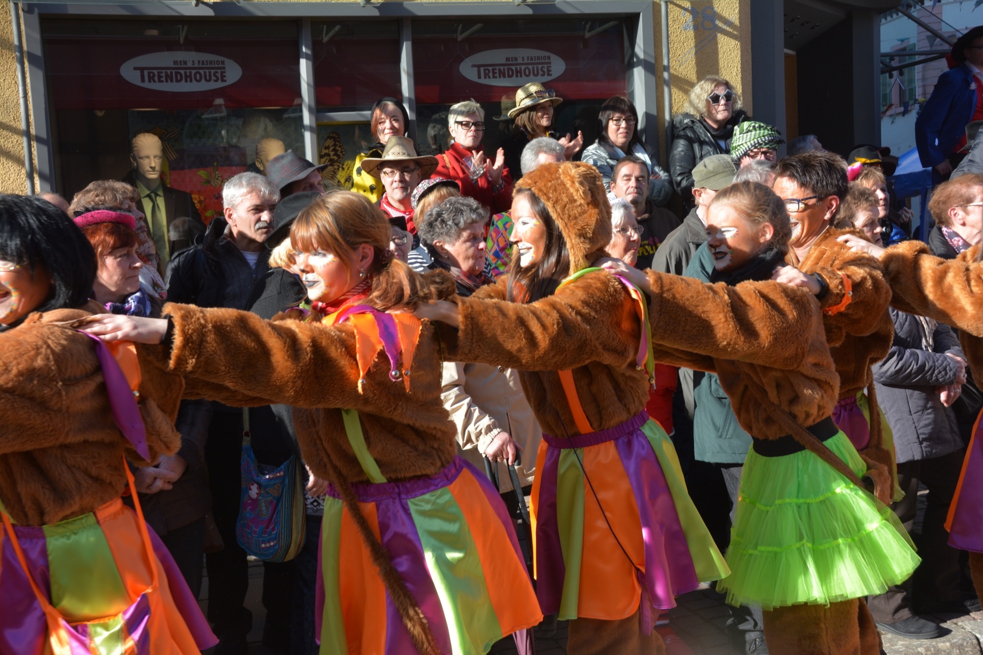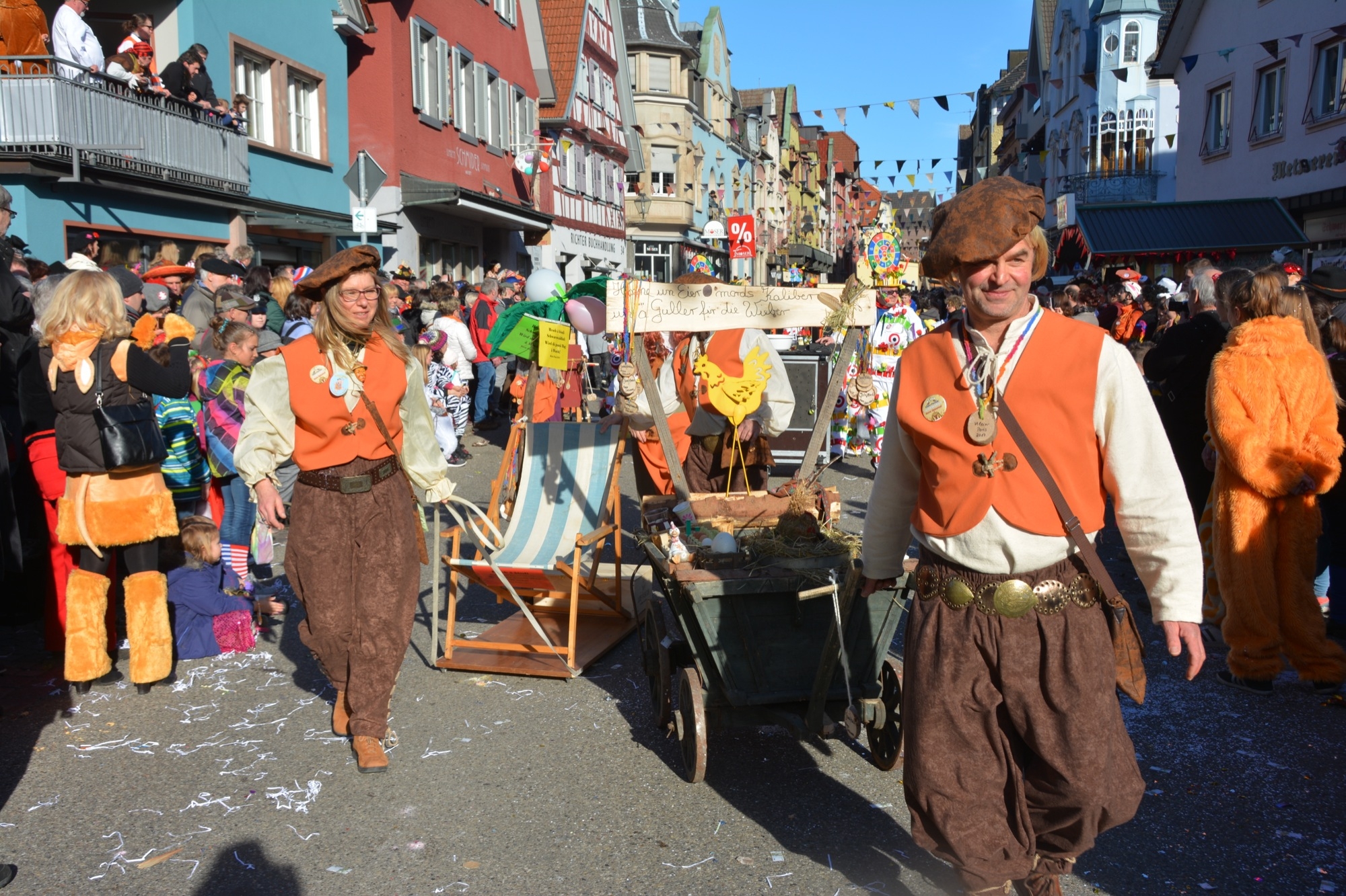Der »Bruch« lud zum Affenzirkus ein. Als Affen und Bananen verkleidet tanzten durch die Straße, die »Bruch«-Kinder waren zum Teil auf Skate- und Hoverboards unterwegs. Überhaupt: Tiere waren das große Thema in diesem Umzug, denn auch das »Städtle« setzte das Motto tierisch um. Der Slogan »Im Städtle läuft de Bär om Gaukler hinterher« war Programm. Bei dieser Gruppe gab es tanzende Bären und Gaukler zu bestaunen.