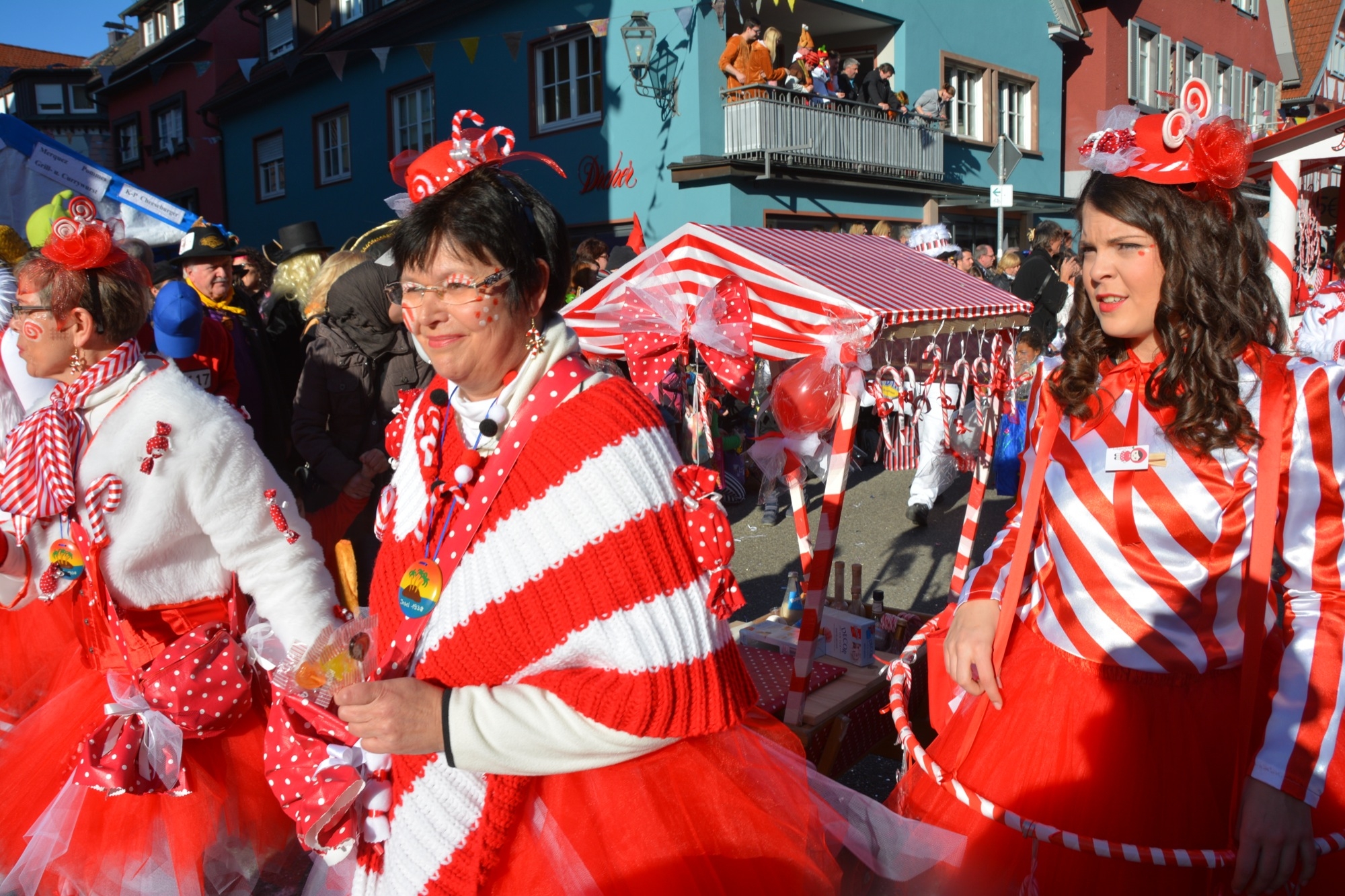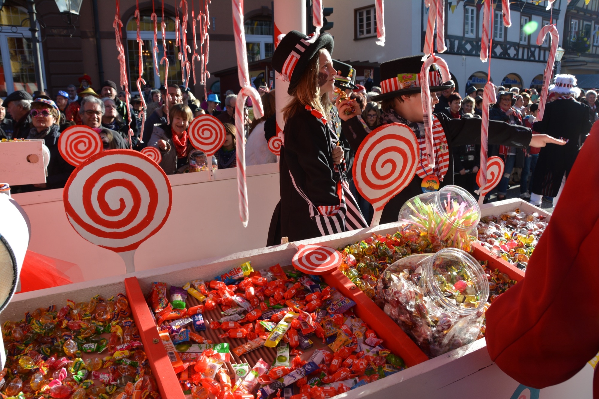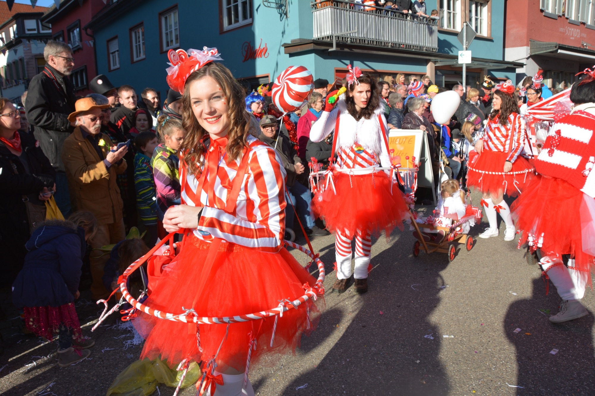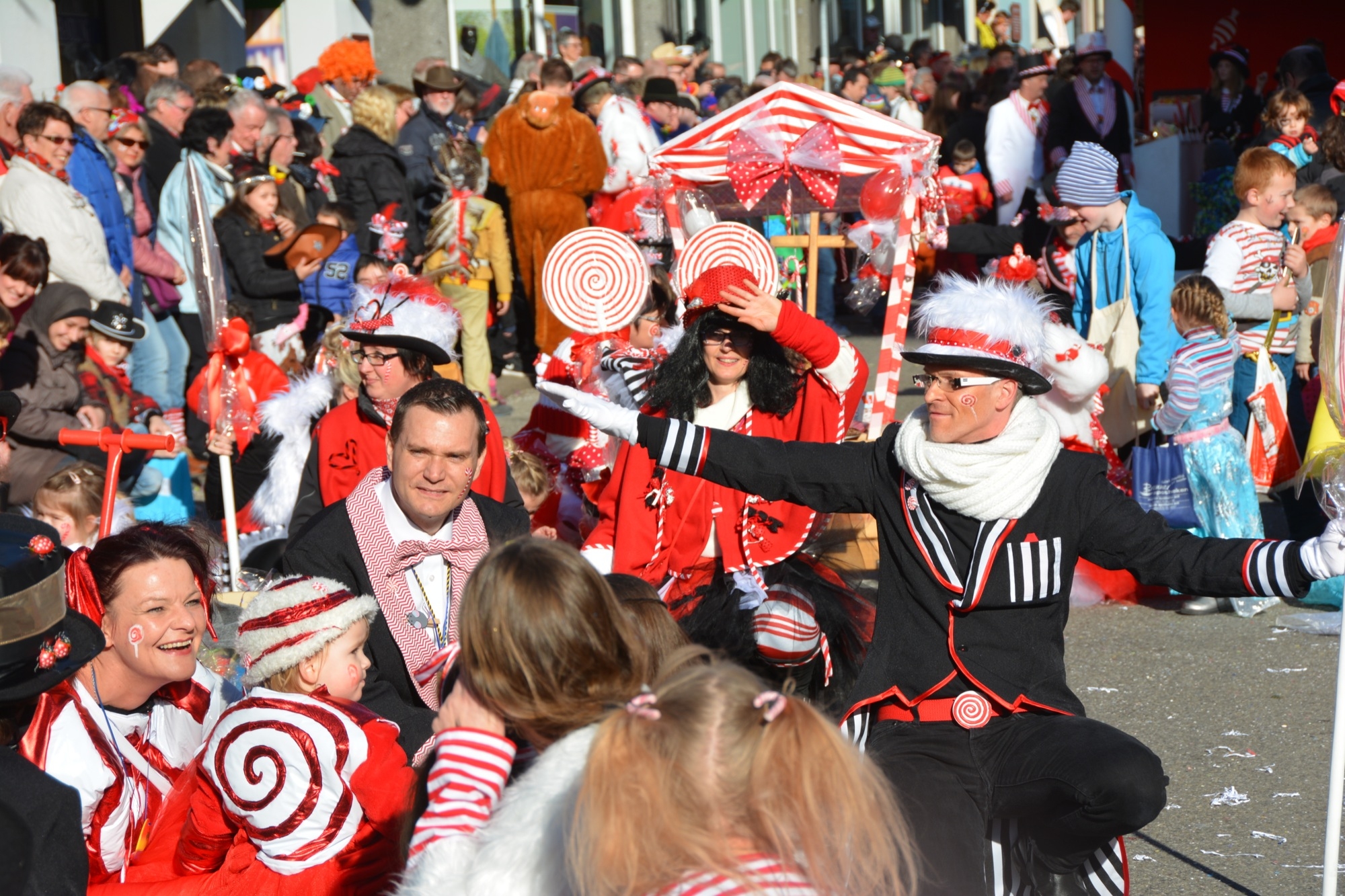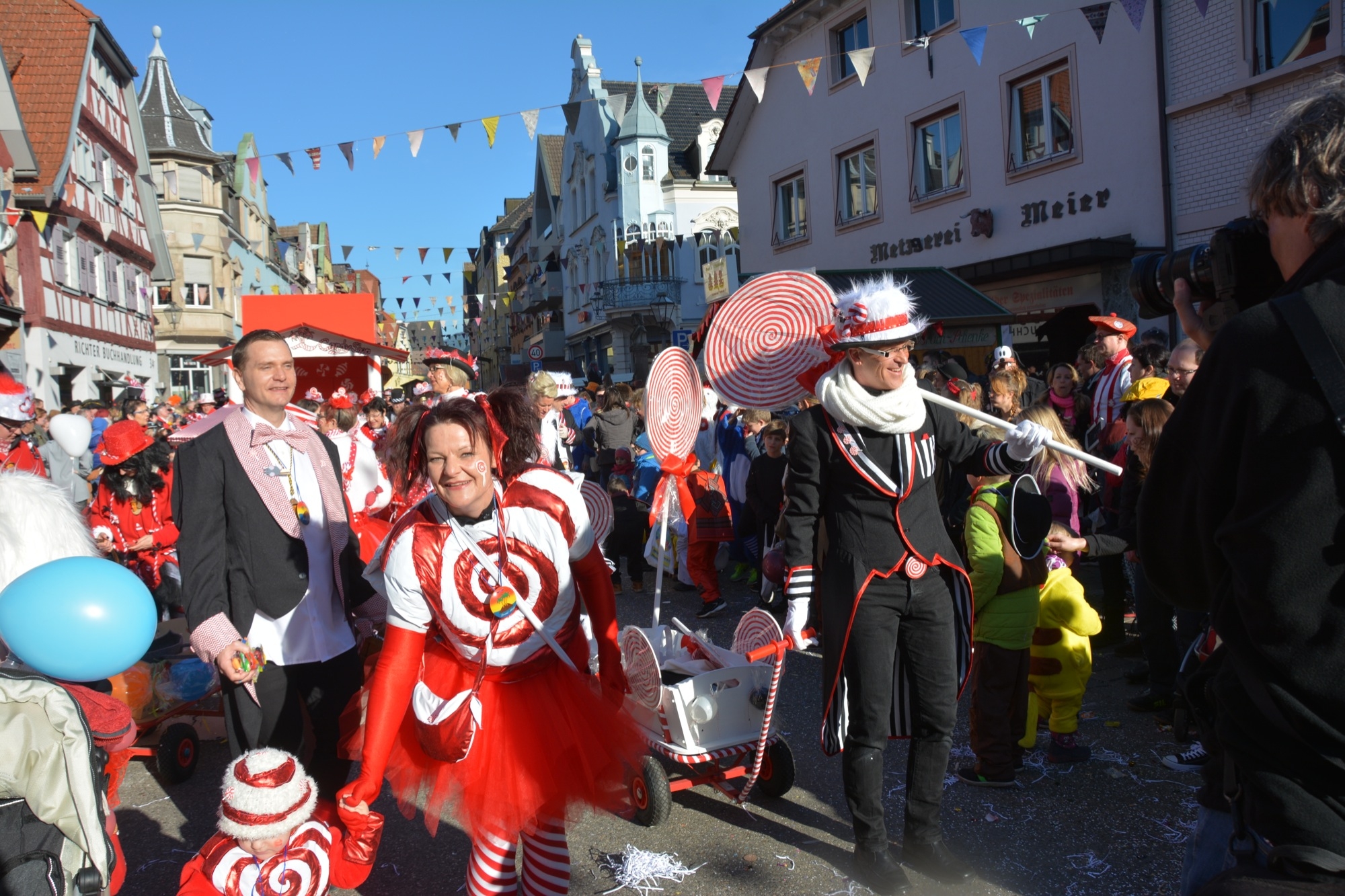 Als im Vorfeld das Thema der »Lohgass« bekannt wurde, gab es Verwirrung. Ihr Thema lautete »Rotkäppchen«. Wie die Gruppe das Märchen wohl auf Zirkus trimmen wollte? Der Dreh: Die Grundidee des Märchens wurde in eine Geschichte eingebettet, bei der ein Zirkus eine Rolle spielte. »80 Jahre Zigeunerkarusell. Rotkäppchen gastiert in Zell« hieß es schließlich, was die Moderatoren kommentieren ließ »Mancher Zirkus ist wie ein Märchen«. Kurz vor Schluss war es dann Zeit für etwas Süßes. Bei »Zuckerstange und Lollipop, hier kommt der Insel Candyshop« war die Umsetzung bereits im Motto enthalten: Es regnete Bonbons, die Outfits waren in Rot und Weiß gehalten – ganz wie Zuckerstangen. Den musikalischen Abschluss der ersten Runde markierte die Hombacher Musik mit einem kleinen Platzkonzert vor der Rathaus-Tribüne. Ihnen folgten die Eckwaldhexen, die mit ihrem rauchenden Hexenhaus auf Rädern für eingeschränkte Sicht im Veranstaltungsbereich sorgten. Kurz vor vier war dann der erste Durchlauf abgeschlossen und Runde Zwei konnte aus der Grabenstraße startend beginnen.