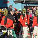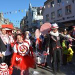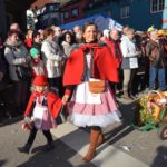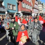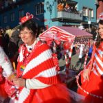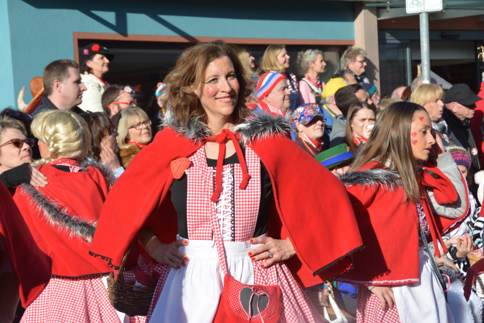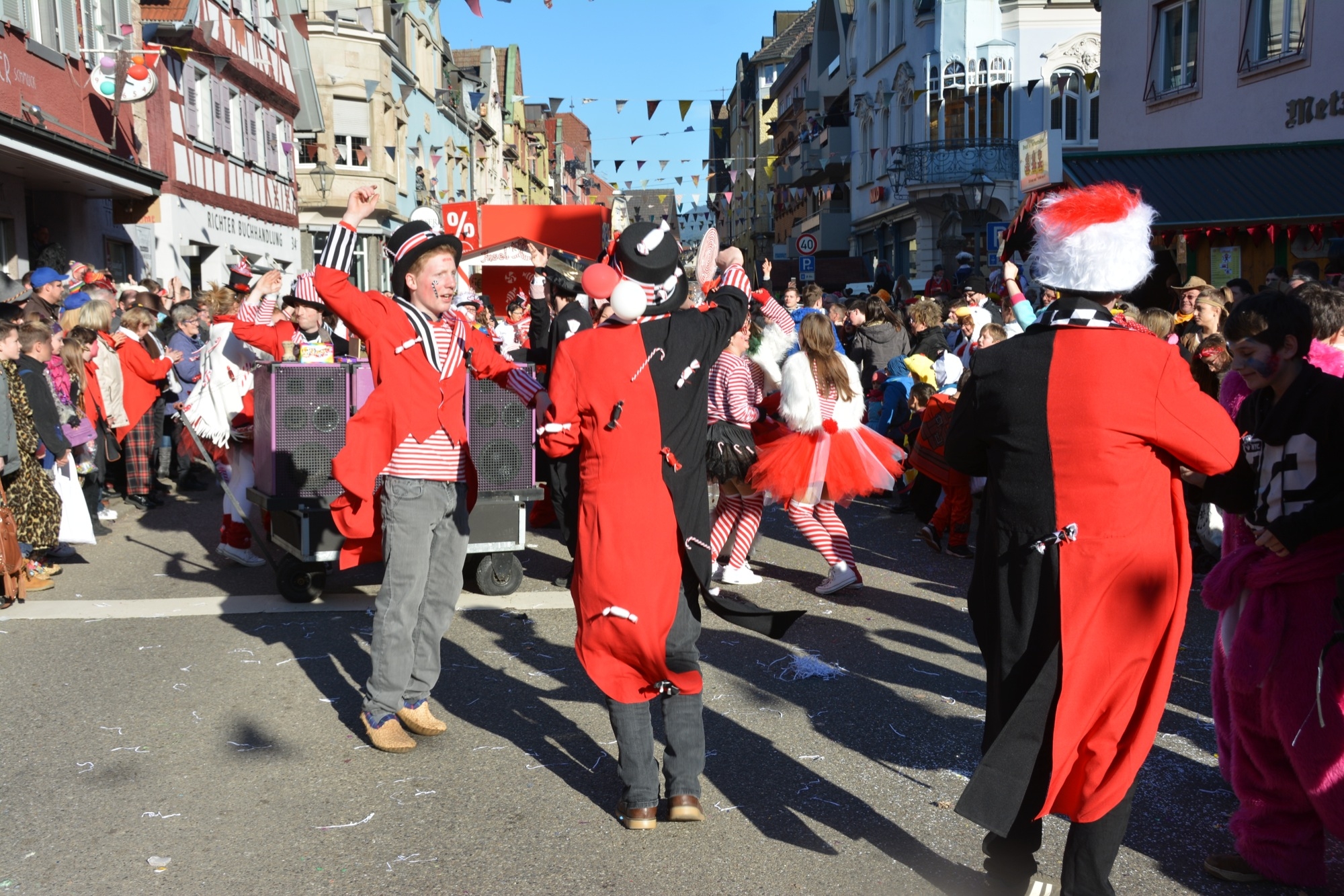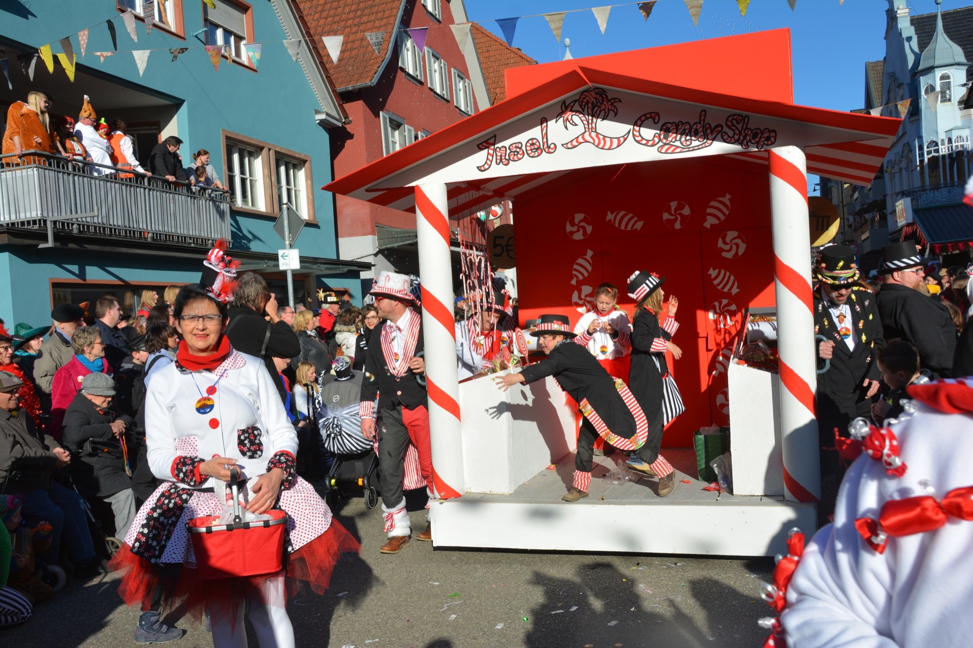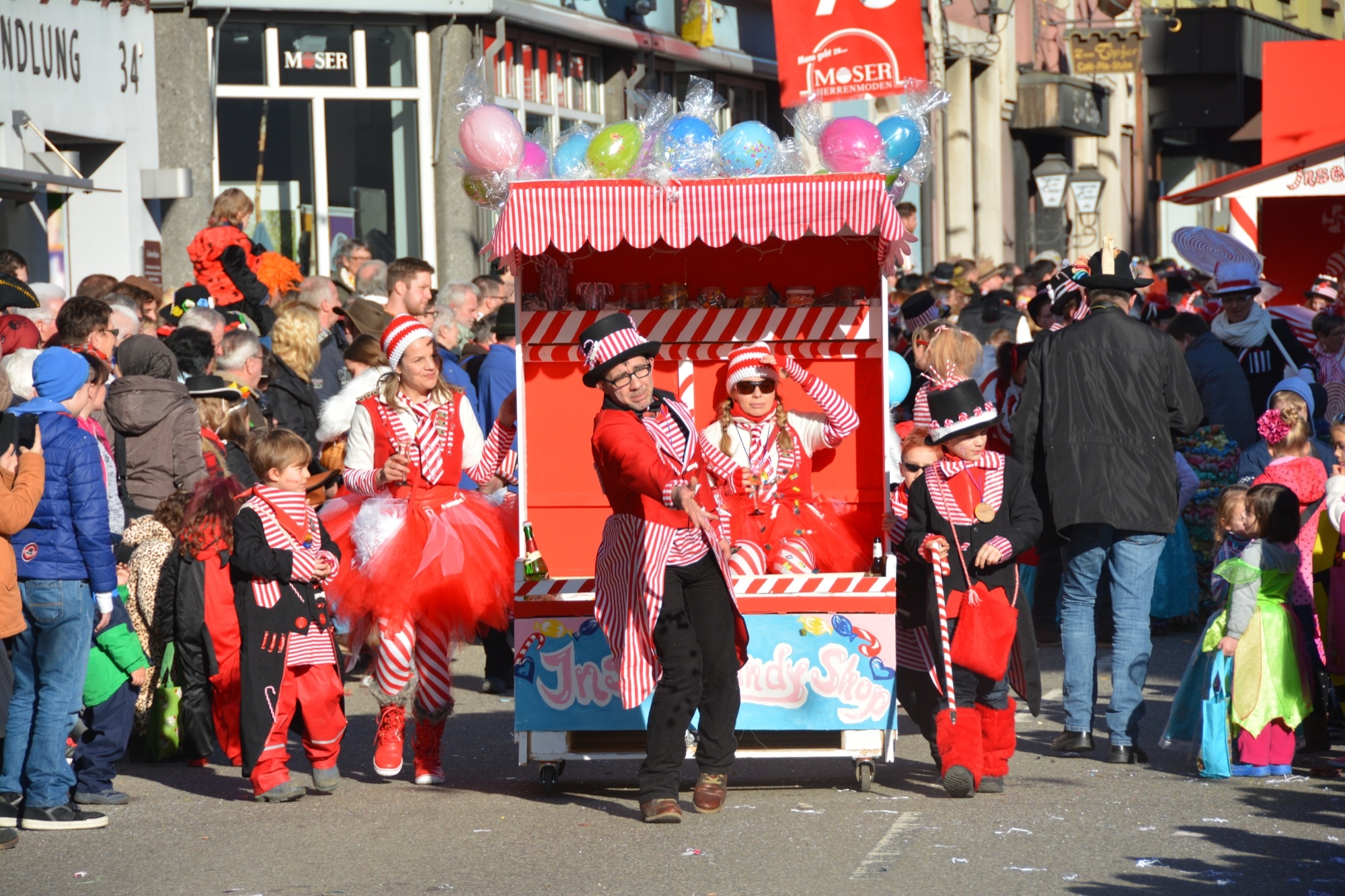 Als im Vorfeld das Thema der »Lohgass« bekannt wurde, gab es Verwirrung. Ihr Thema lautete »Rotkäppchen«. Wie die Gruppe das Märchen wohl auf Zirkus trimmen wollte? Der Dreh: Die Grundidee des Märchens wurde in eine Geschichte eingebettet, bei der ein Zirkus eine Rolle spielte. »80 Jahre Zigeunerkarusell. Rotkäppchen gastiert in Zell« hieß es schließlich, was die Moderatoren kommentieren ließ »Mancher Zirkus ist wie ein Märchen«. Kurz vor Schluss war es dann Zeit für etwas Süßes. Bei »Zuckerstange und Lollipop, hier kommt der Insel Candyshop« war die Umsetzung bereits im Motto enthalten: Es regnete Bonbons, die Outfits waren in Rot und Weiß gehalten – ganz wie Zuckerstangen. Den musikalischen Abschluss der ersten Runde markierte die Hombacher Musik mit einem kleinen Platzkonzert vor der Rathaus-Tribüne. Ihnen folgten die Eckwaldhexen, die mit ihrem rauchenden Hexenhaus auf Rädern für eingeschränkte Sicht im Veranstaltungsbereich sorgten. Kurz vor vier war dann der erste Durchlauf abgeschlossen und Runde Zwei konnte aus der Grabenstraße startend beginnen.