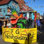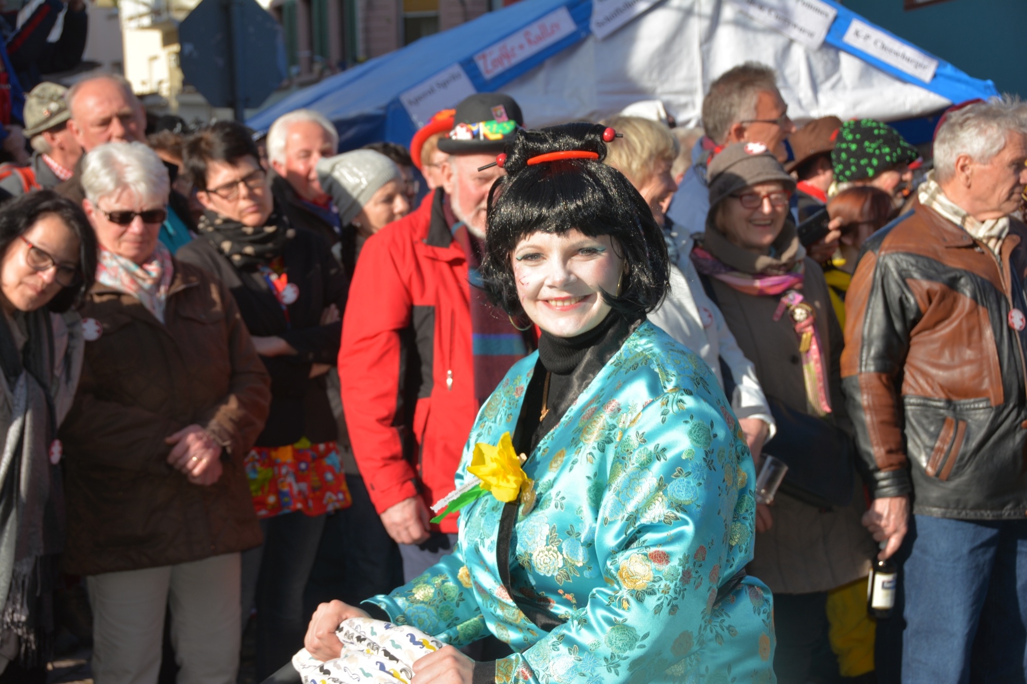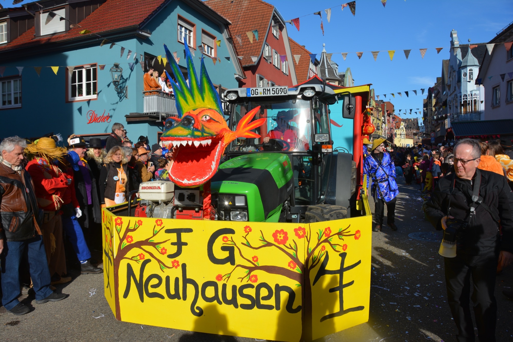 Die Neuhausener inszenierten mit viel Liebe zum Detail »Bunt und grell der chinesische Jahrmarkt gastiert in Zell«. Es gab Glückskekse und Reisschnaps, aus »hoorig, hoorig« wurde »hoolig, hoolig«, und natürlich durfte das Symbol für das Glück und Friede schlechthin, der Drache, in dem Auftritt nicht fehlen. Den Mittelpunkt vom »Klein Pariser Jahrmarkt anno dazumal« bildete eine Schänke, die von Tänderinnen begleitet wurde. Ein Jahrmarktstand versprach »Brustvergrößerung durch Handauflegen«, selbst an einem mobilen Pranger, Marke »annodazumal«, mangelte es nicht. Das »Dörfle« war als Schießbudenfiguren unterwegs. Die Themenwahl gab viel Raum für lustige Kalauer der Moderatoren, wie »Lernen Sie schießen – treffen Sie Freunde«. Bürgermeister Günter Pfundstein und Bundestagsabgeordnete Kordula Kovac mussten am Dosenwurf-Wagen ran, wo es Lutscher und Plastikrosen zu gewinnen gab.