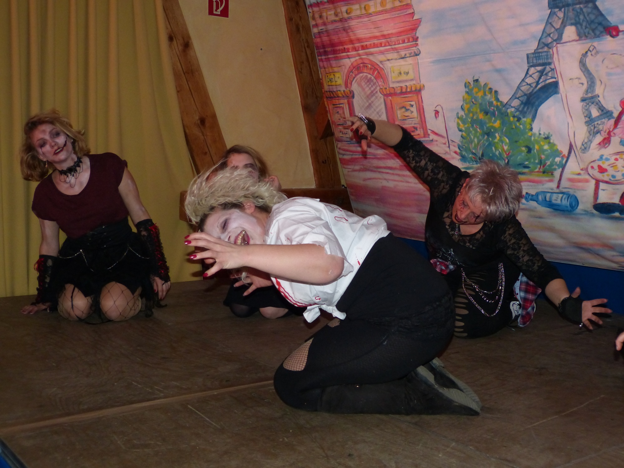 Und dann wurde es dunkel. Unter schwarzen Tüchern kauerten seltsame Gestalten. Ein markerschütternder Schrei – Zombie-Horrorgestalten erwachten tanzend zum Leben, bis ein Donnerschlag sie erneut zu Boden sinken ließ.