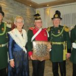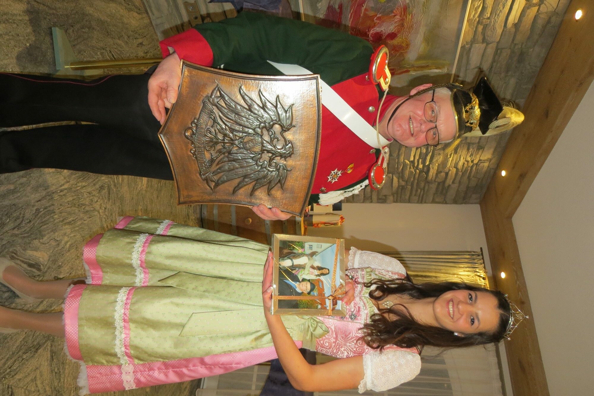Überraschungsgast Carina Stulz, die Gengenbacher Weinprinzessin, war bereits beim Aufmarsch der Bürgerwehr mitgelaufen. Fridolin Schwendemann führt in jedem Jahr die Kutsche mit den Ehrengästen beim Gengenbacher Weinfest und kennt die Weinprinzessin persönlich. Er freute sich sichtlich über ihren Besuch. Zusammen mit der Königinnenmutter Maria Bruder überreichte sie ein Foto, das sie auf seinem Pferd mit ihm zusammen beim letzten Weinfest zeigt.