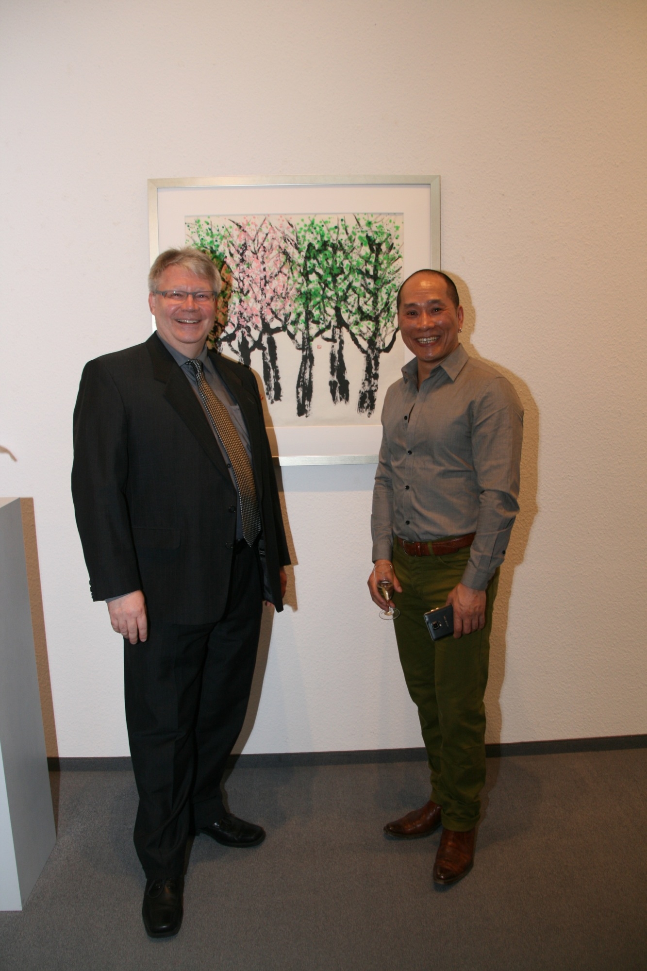 Beide Künstler hatten ihre Werke im Februar auf der Kunstausstellung »art Karlsruhe« gezeigt und dabei große Beachtung gefunden. Der aus China stammende Maler und Objektkünstler Lin stellt jetzt in Zell seine Bilder aus. Sie variieren das Motiv Bäume in Größe und Farbigkeit immer wieder neu. Die Stämme und Äste werden der chinesischen Tradition folgend in Tusche auf Reispapier aufgetragen. Im Kontrast dazu wird das Blüten- und Blattwerk in bunten Acrylfarben hinzugefügt. Die leuchtende Farbigkeit erinnert an die westliche Moderne.