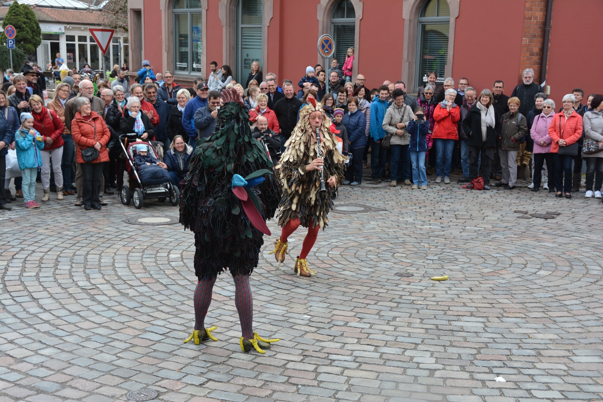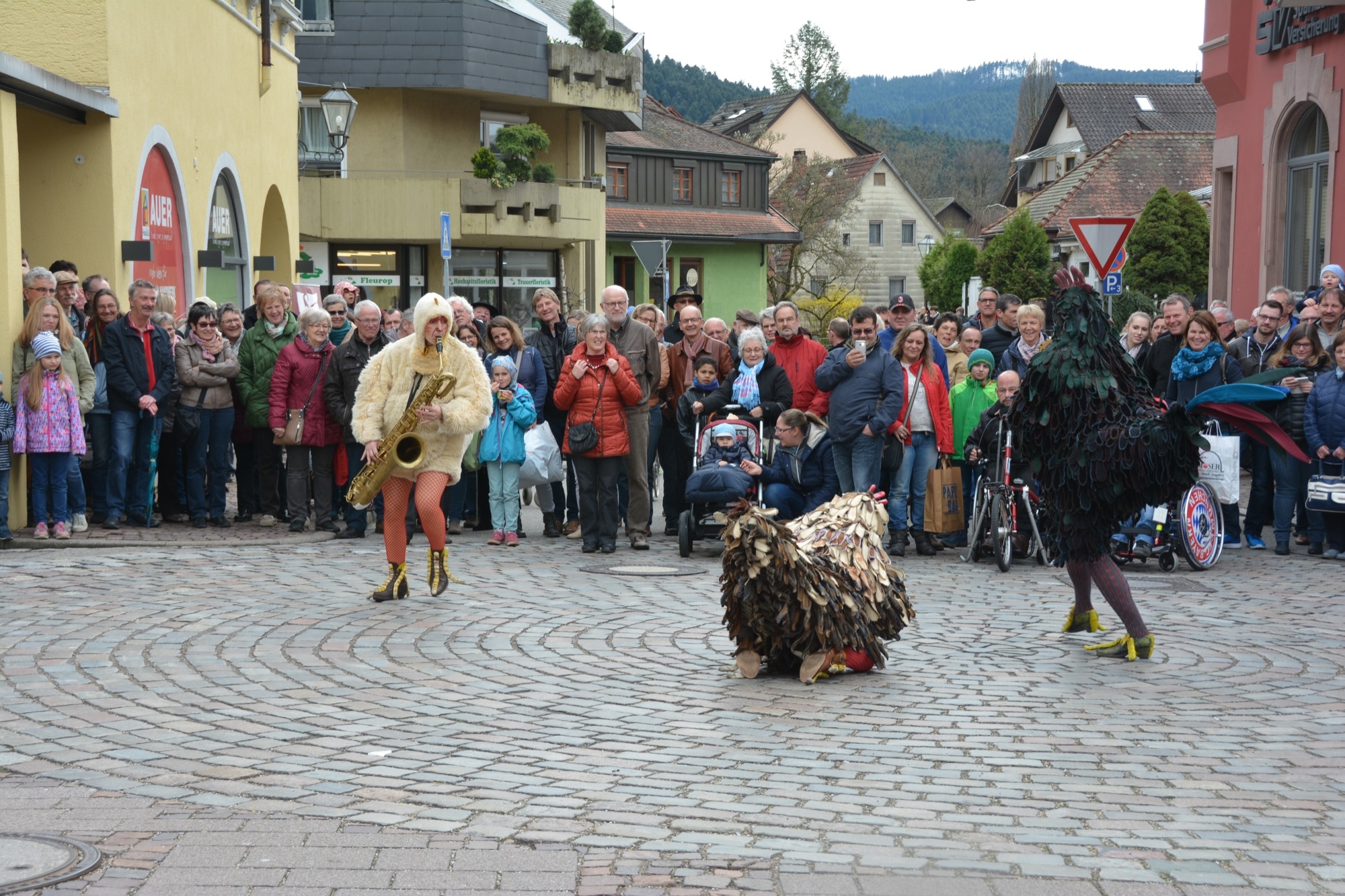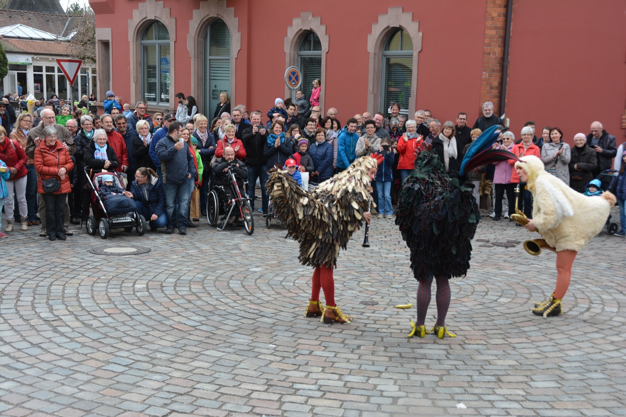 Die Stars beim Frühlingsfest waren aber zweifelsfrei die »Cock Tales«. Der prachtvoll gefiederte, musikalische Hühnerhaufen unterhielt das Publikum auf dem Platz vor der Sparkasse mit seinen tierisch-menschlichen Szenen. Der aufgeplusterte Streitgockel und die zickigen Glucken balgten um ein »seltsames« Ei, das wohl eher eine Banane war, und um das begehrte »goldene Ei«. Selbst das Brötchen eines Mädchens, das auf den Schultern ihres Vaters das lustige Schauspiel beobachtet, war beim Auftritt der »Cock Tales« nicht sicher. Das Trio glänzte bei ihrem Spiel sowohl mit ihrer Gestik und auch mit ihrem musikalischen Können. Mit dem Engagement dieser Schauspieltruppe aus Hannover, durch die Stadt Zell im Rahmen des Kulturprogramms »Zellkultur«, hat das Frühlingsfest eine besonders schöne Note erhalten.