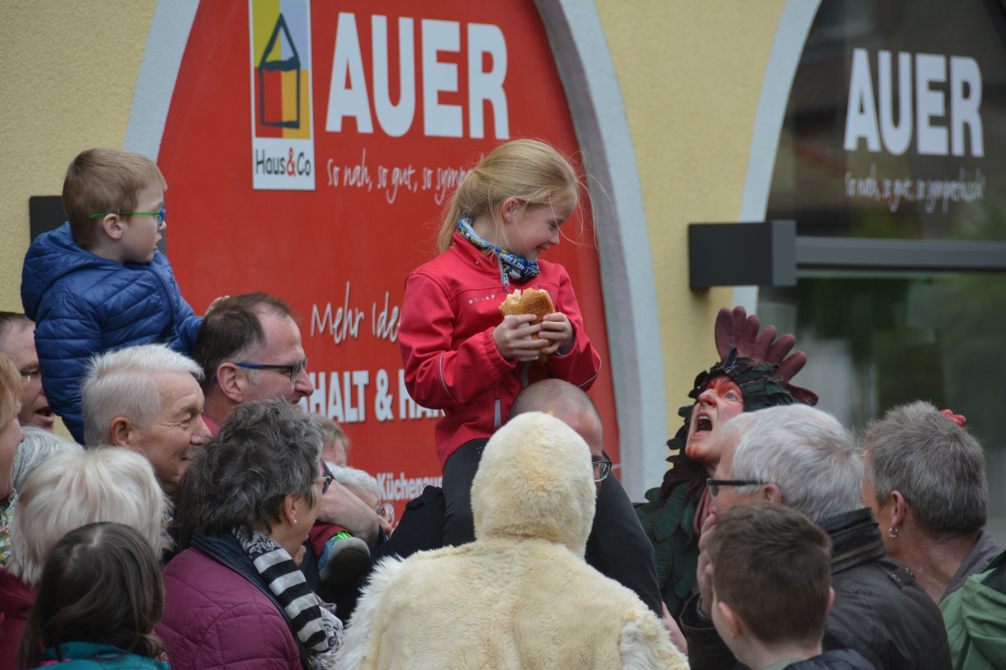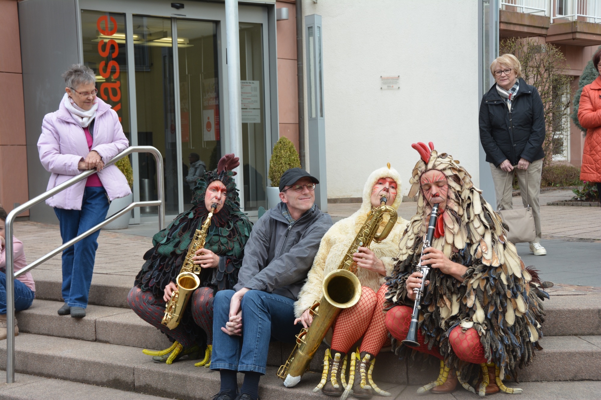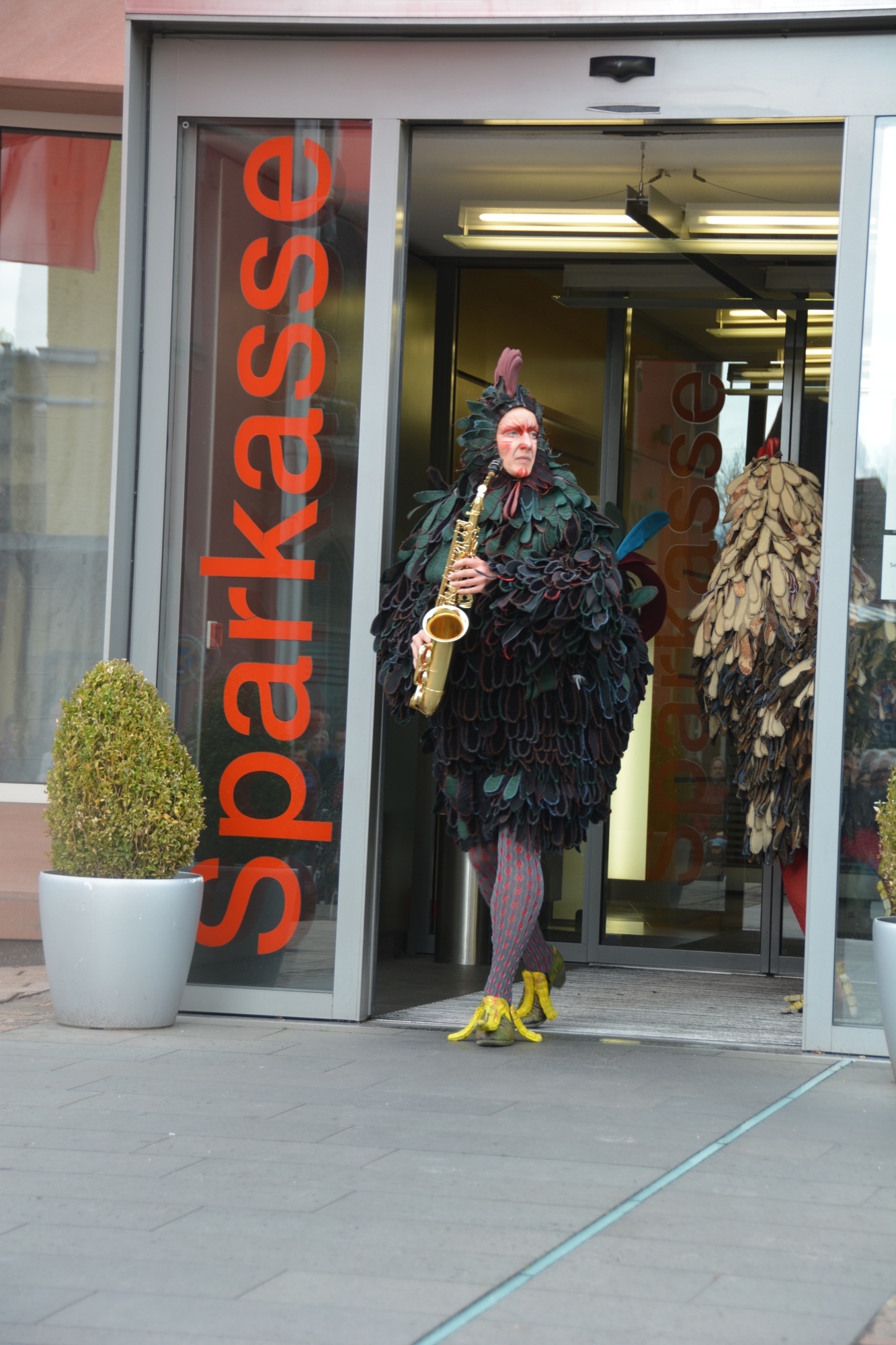 Die Stars beim Frühlingsfest waren aber zweifelsfrei die »Cock Tales«. Der prachtvoll gefiederte, musikalische Hühnerhaufen unterhielt das Publikum auf dem Platz vor der Sparkasse mit seinen tierisch-menschlichen Szenen. Der aufgeplusterte Streitgockel und die zickigen Glucken balgten um ein »seltsames« Ei, das wohl eher eine Banane war, und um das begehrte »goldene Ei«. Selbst das Brötchen eines Mädchens, das auf den Schultern ihres Vaters das lustige Schauspiel beobachtet, war beim Auftritt der »Cock Tales« nicht sicher. Das Trio glänzte bei ihrem Spiel sowohl mit ihrer Gestik und auch mit ihrem musikalischen Können. Mit dem Engagement dieser Schauspieltruppe aus Hannover, durch die Stadt Zell im Rahmen des Kulturprogramms »Zellkultur«, hat das Frühlingsfest eine besonders schöne Note erhalten.