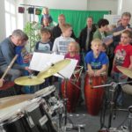 Bei dem Kinderkonzert zu Beginn des Infotages zeigten die Kleinsten, wie spielerisch und kindgerecht der Musikunterricht gestaltet wird. Die Musik- und Tanzgruppe unter Leitung von Uschi Jäckle sang den Rap: »Wenn ich etwas können will, brauche ich…«, bei dem alle Körperteile durch Gesten einbezogen wurden. Dies wurde zu einer lustigen Darbietung, bei dem auch die Gäste gerne mitmachten. Zum Beispiel galt es bei der wichtigen Textzeile »Und mein Herz in der Brust, braucht ganz viel Lust« sich kräftig auf die Brust zu klopfen. Bei der musikalischen Früherziehung ab vier Jahren lernen die Kinder auch den Umgang mit Trommel und Xylophon. Leiterin Uschi Müller spielte ihnen einen kurzen Rhythmus vor und die Kinder machten ihn nach. Damit lernen die Jungen und Mädchen einen fachlich fundierten und gleichzeitig spielerischen Einstieg in das Instrumentenspiel.