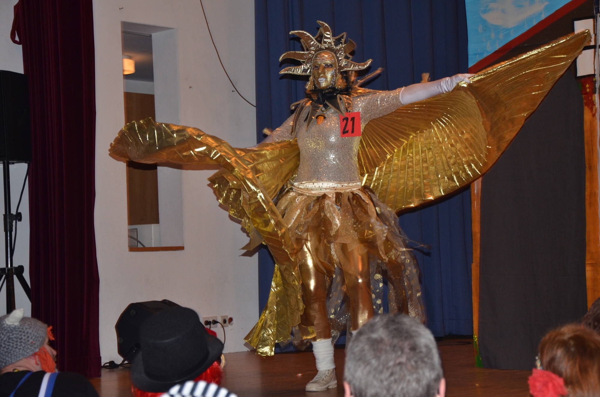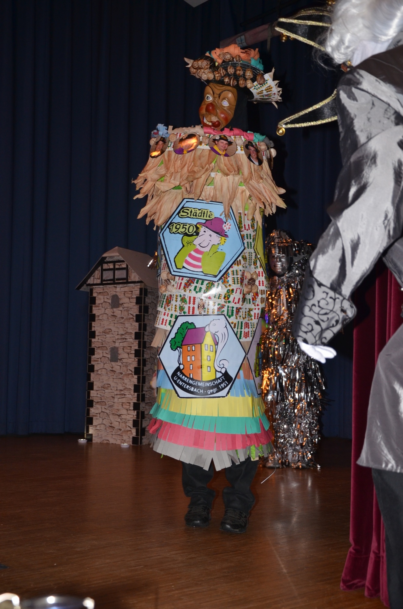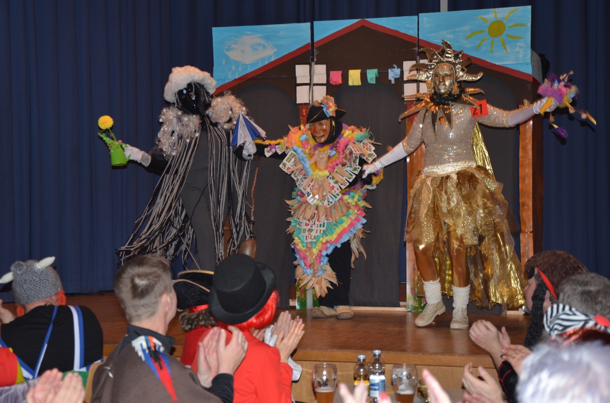 Vogelgezwitscher und Frühlingsmelodien kündigten Sonne und trockenes Wetter an und die hübsche Sonnenwächterin Esther Kalmring stellte sich auf der Fasendsbühne vor das Häusle. Ihr Kostüm aus purem Sonnenschein: auf dem Kopf eine goldene Krone, im Gesicht ein schimmernder Teint, 1000 Pailletten glitzerten vom Oberteil und aus Sonnenstrahlen hatte sie ihren Ballerina Rock gemacht. Goldene Chucks sorgten für ein bisschen Bodenständigkeit.