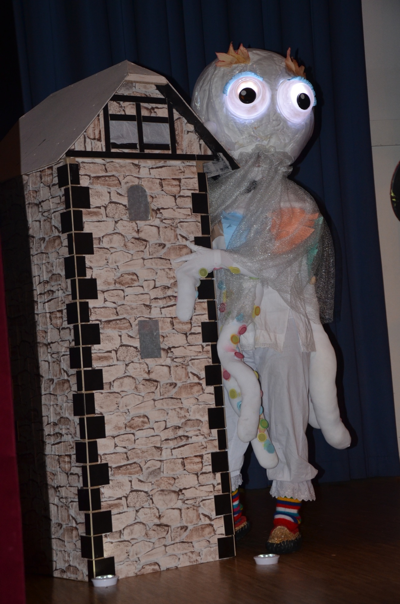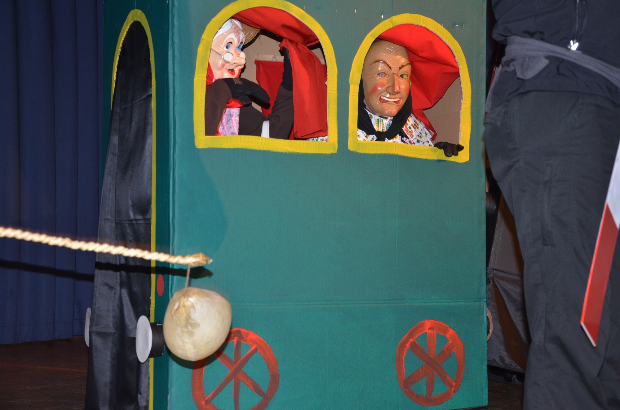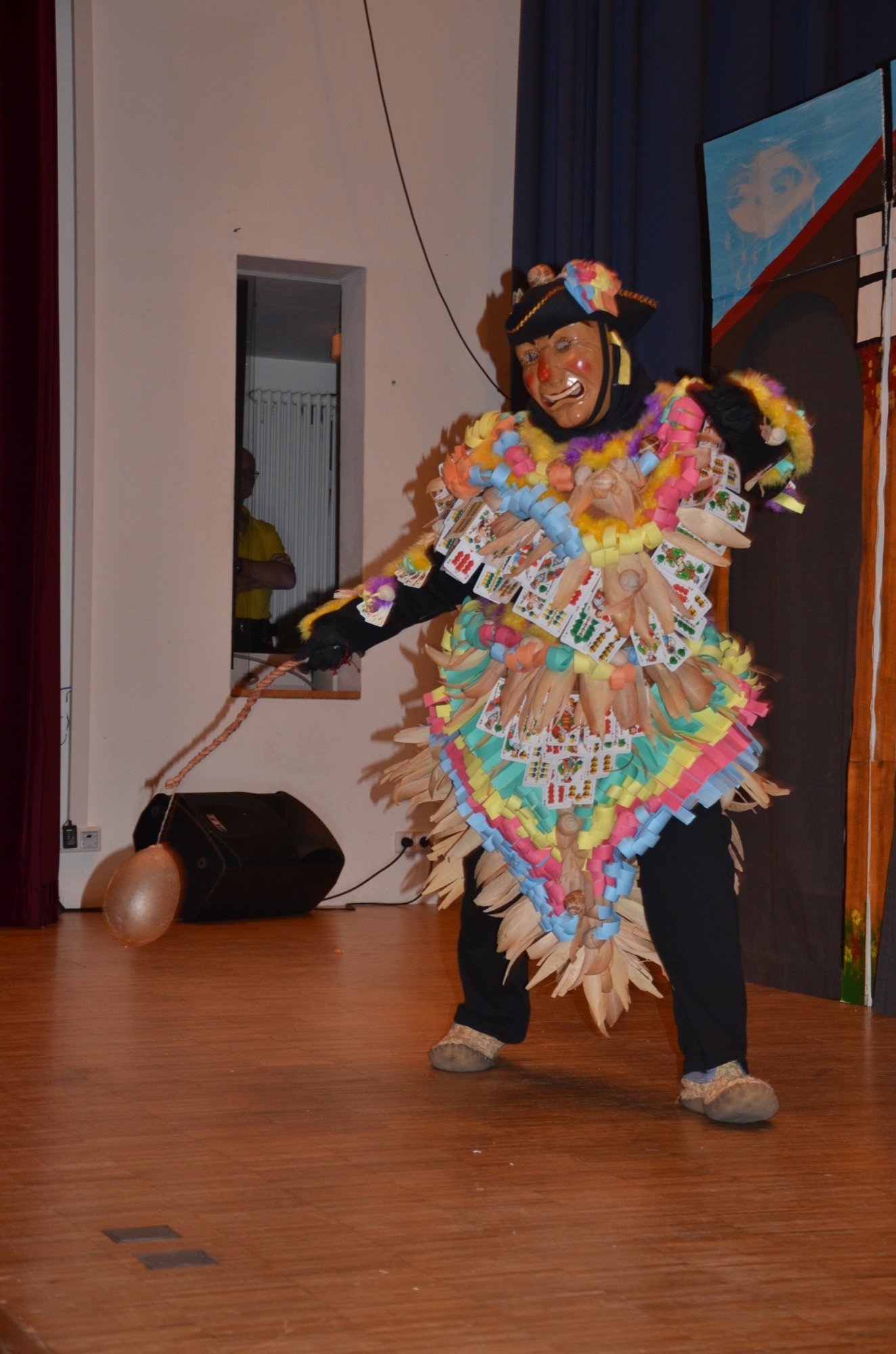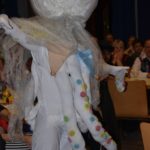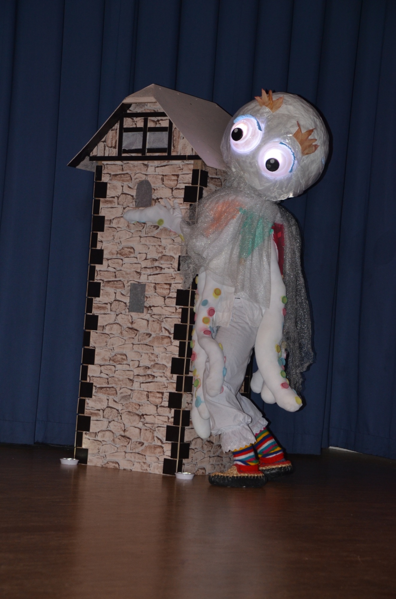 Die Erzählerstimme sprang an den Anfang aller Dinge, als »Gott die Fasend schuf«. Künstler Lugi, von Gott beauftragt, stieg im seiden-grauen Sakko mit weißer Mozartperücke und silberner Krone auf die Bühne und begann sein erstes Werk: Eine Krake mit großem Kopf, weißen Fangarmen und bunten Noppen. Das lustige Tierchen, dessen Augen nur für den Storchenturm leuchteten, kuschelte sich an das Zeller Wahrzeichen – was für ein Bild!