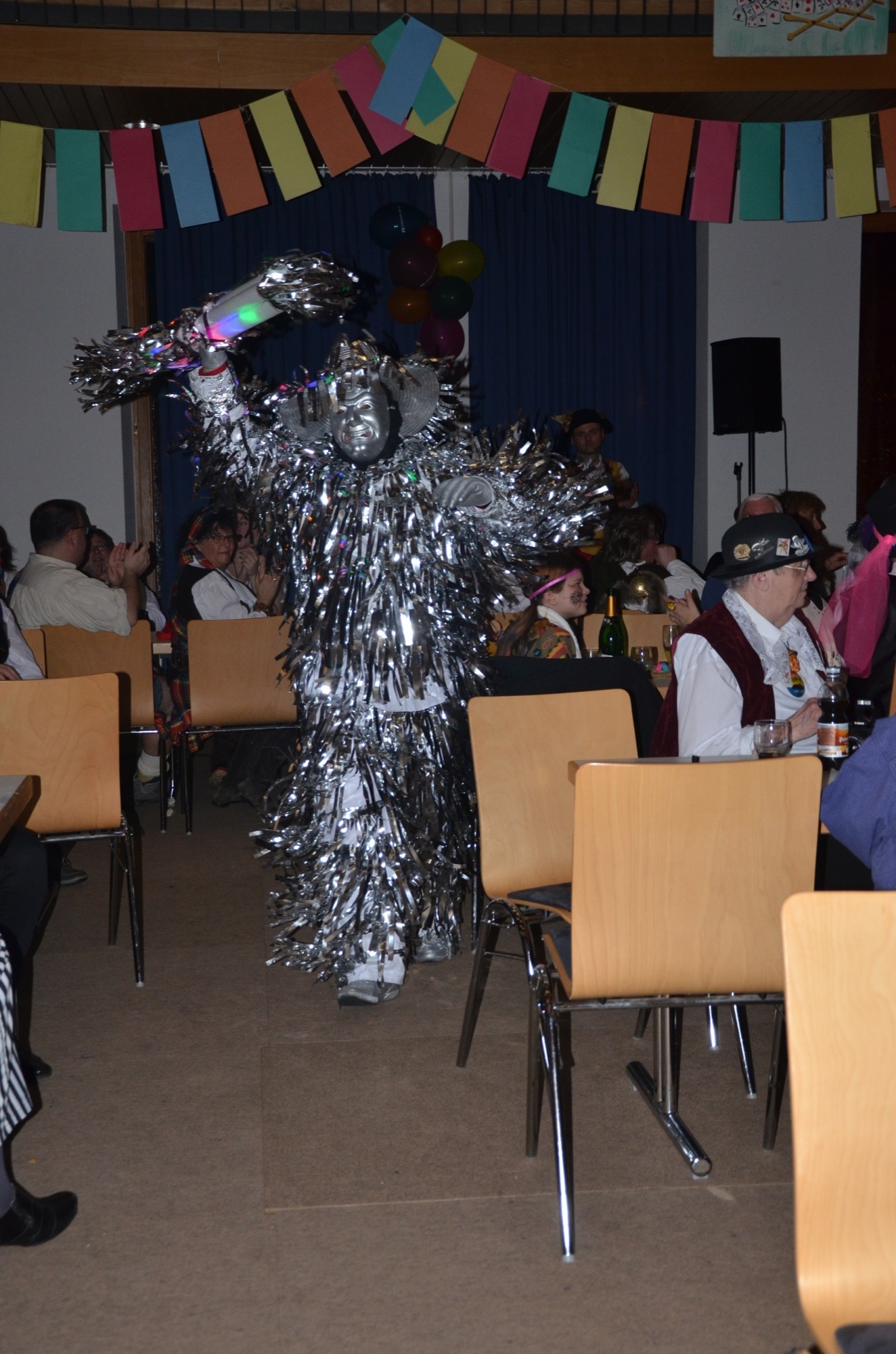 Luigis zweites Werk: Ein Silberstreif am Horizont oder vielleicht das Narro der Zukunft? Breite, silberne Folienstreifen haben die Kostümbildner zu Tausenden um den Narro geschlungen. Die Silber-Bändele flogen und wippten bei jedem Sprung wie Zotteln, dazu leuchtete das übergroße Knicklicht wie eine bunte Disco-Kugel.