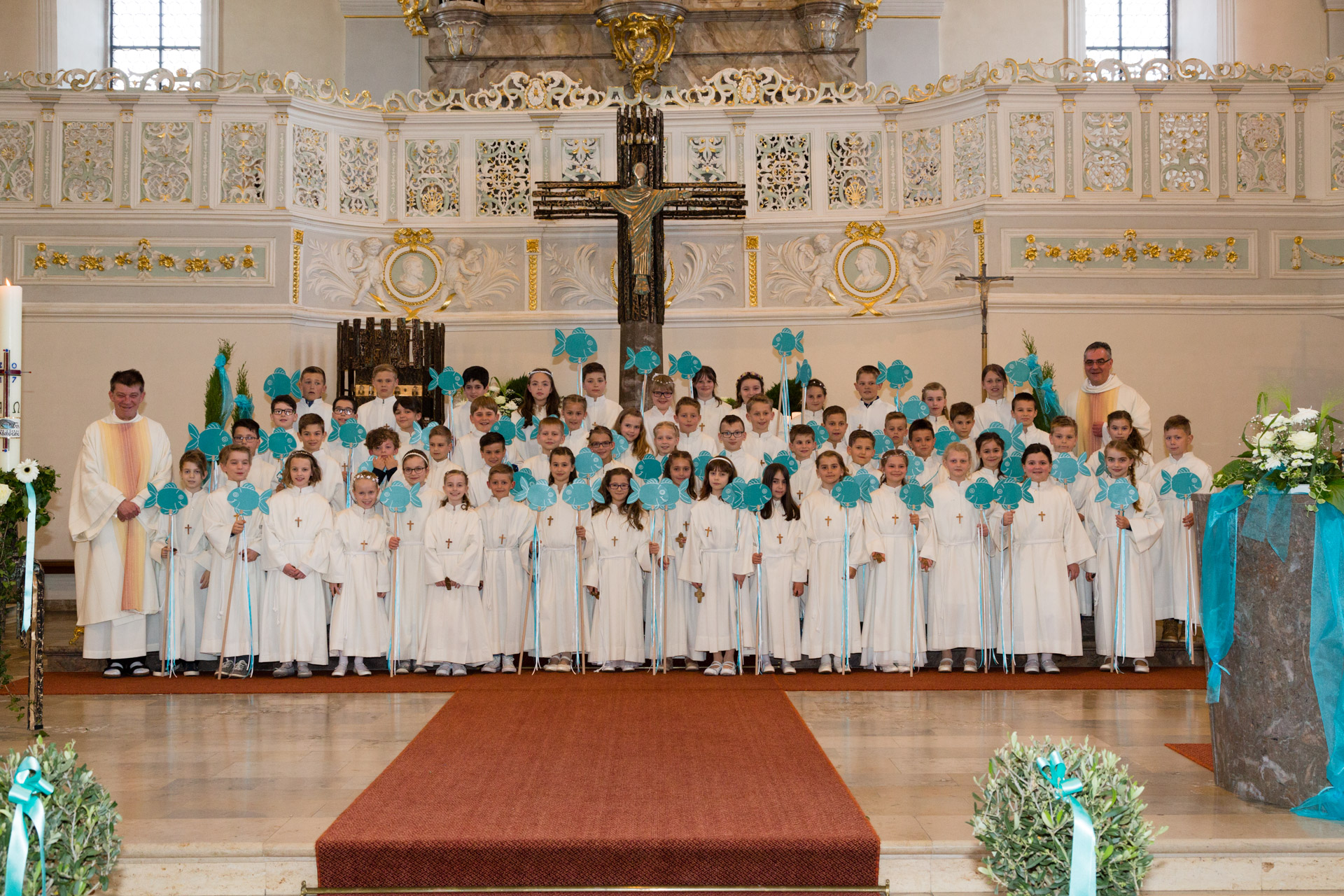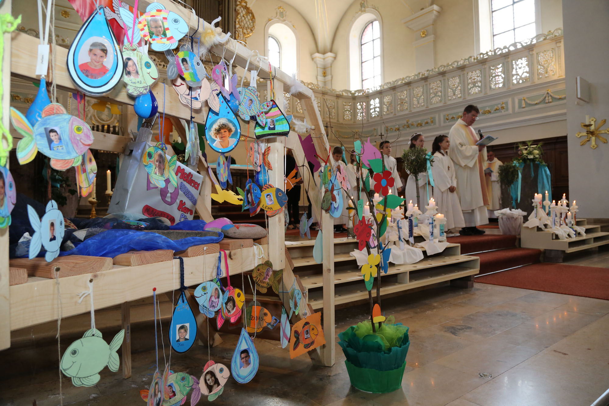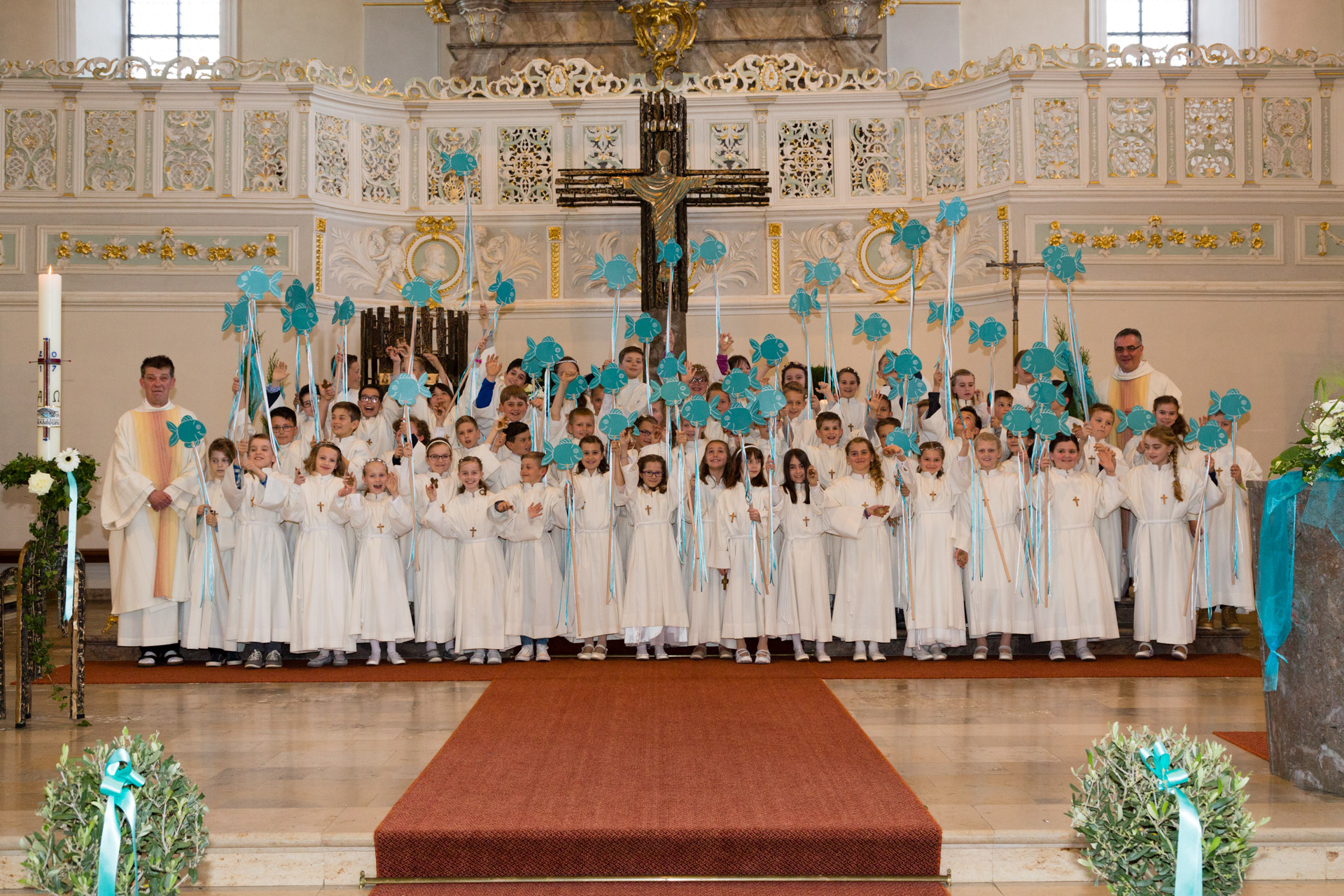 Die Gemeinschaft mit Jesus begann für die Erstkommunikanten in der Taufe, als sie zu Teilhabern an Jesus Christus wurden und im Sakrament der Taufe das Zeichen des neuen Lebens und der österlichen Hoffnung empfingen. Dieses Geheimnis des Glaubens bekräftigten sie im Gottesdienst während der Tauffeier, nachdem sie ihre Kerzen an der Osterkerze als dem Symbol für den Auferstandenen entzündeten und ihr »Ja« zu Jesus Christus und seiner Kirche in der Tauf-Erneuerung sprachen.