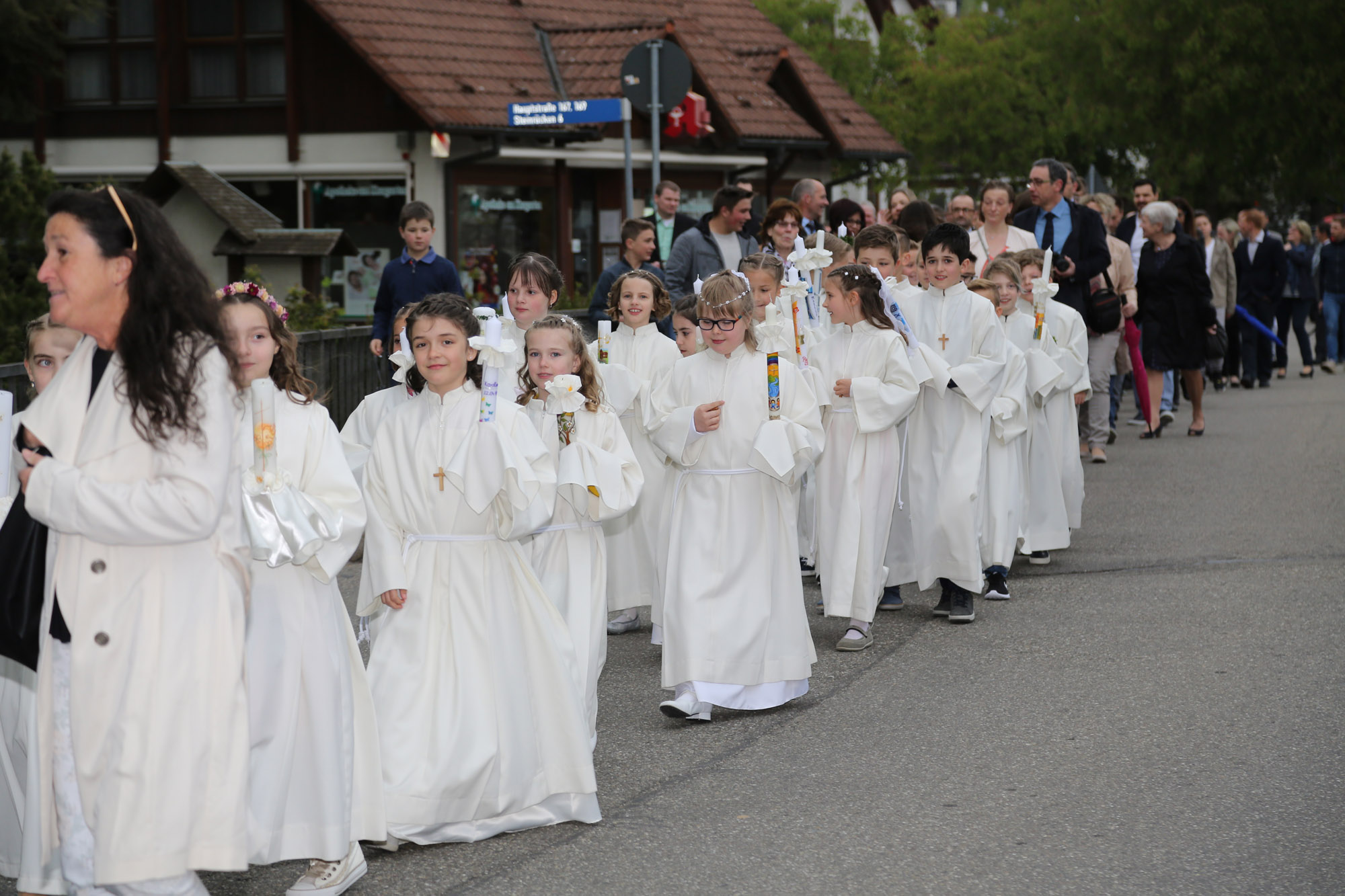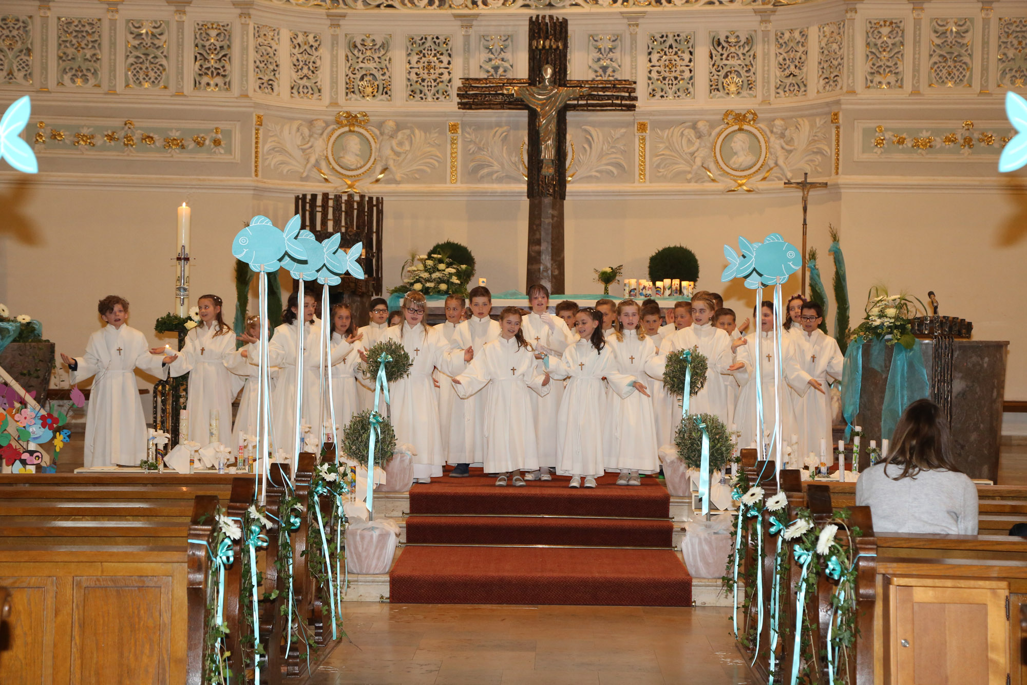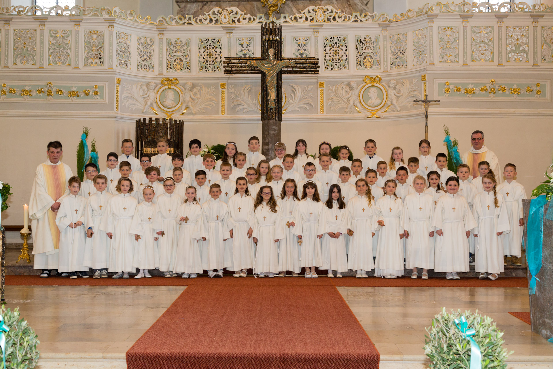 Die Gemeinschaft mit Jesus begann für die Erstkommunikanten in der Taufe, als sie zu Teilhabern an Jesus Christus wurden und im Sakrament der Taufe das Zeichen des neuen Lebens und der österlichen Hoffnung empfingen. Dieses Geheimnis des Glaubens bekräftigten sie im Gottesdienst während der Tauffeier, nachdem sie ihre Kerzen an der Osterkerze als dem Symbol für den Auferstandenen entzündeten und ihr »Ja« zu Jesus Christus und seiner Kirche in der Tauf-Erneuerung sprachen.