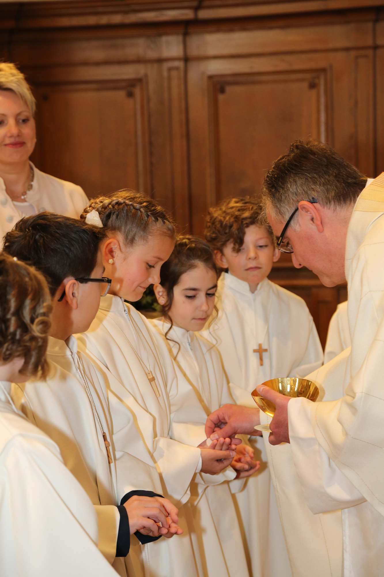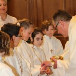 Im Kreis standen die Kinder dann um den Altar und beteten gemeinsam das »Vater unser«. Nun war der große Moment gekommen – die Kinder empfingen ihre Erste Kommunion und standen ganz ruhig und andächtig vor Pfarrer Gerner, der ihnen das heilige Brot überreichte. Ein einmaliger, besinnlicher und eindrücklicher Moment, welcher den Kindern und allen Angehörigen bestimmt lange in Erinnerung bleibt.