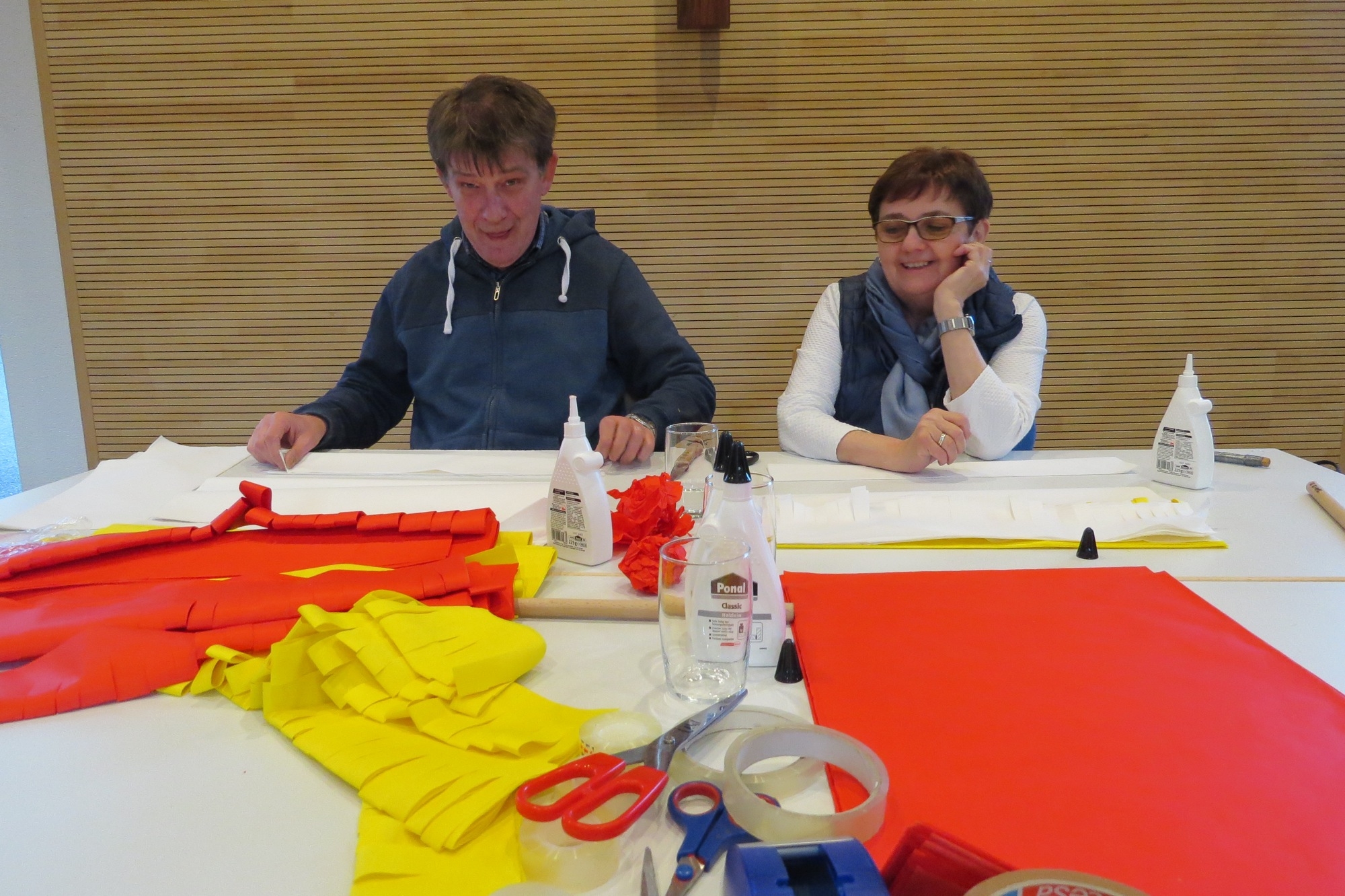 Am gestrigen Donnerstagabend brauchten sie vier Stunden, um aus dem schlichten Baumstamm eine prächtig geschmückte Palme entstehen zu lassen. Es konnte sogar noch Buchs aus einem Privatgarten geholt werden, der nicht vom Schädling befallen war. Trotzdem reichte der Vorrat an Buchs und Thuja nicht aus und die Helfer mussten im Pfarrgarten noch Nachschub holen. Drei Personen waren an dem Abend nur mit dem Schneiden und Kleben des Papiers beschäftigt. In diesem Jahr ist die Palme der Pfarrkirche in den Farben rot, gelb und weiß geschmückt.