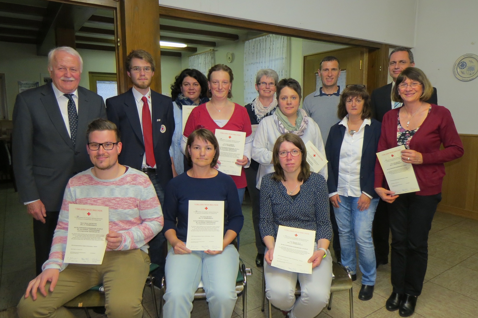 Bereitschaftsleiter Thomas Pietsch sagte in seiner Ansprache: »Sie helfen mit Ihrer Blutspende den Patienten in der Region. Die Blutspendeversorgung erfolgt regional.« »Vielleicht könne morgen schon Ihr Nachbar von Ihrer Blutspende profitieren«, führte er weiter aus. Der Vorsitzende der DRK Ortsgruppe Zell, Hans-Martin Moll, begrüßte die Gäste und dankte den Blutspendern im Namen der Ortsvereine. Er sagte: »Wenn man die Ehrungen solange durchführt wie ich, begegnet man bekannten Gesichtern – so oft haben Sie schon Blut gespendet. Zur Stärkung gibt es danach ein Vesper – und zahlen tut dies der Bürgermeister.«
