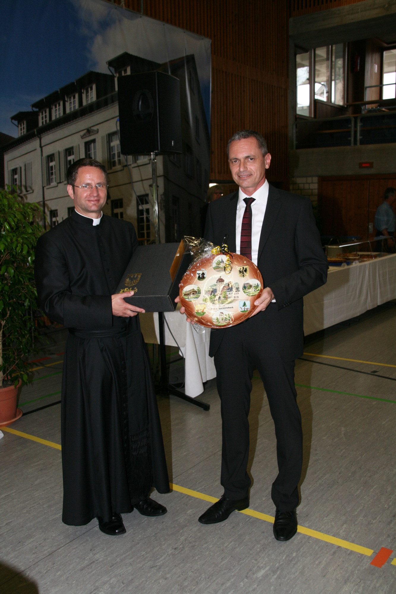 Bürgermeister Günter Pfundstein erinnerte den Primizianten an seine Schulzeit, die er unter anderem beim Schulsport in der Ritter von Buß-Halle verbracht habe. Es müsse ein schönes Gefühl sein, wenn sich ein Lebenskreis schließe. Er wünschte dem gelernten Kommunikationselektroniker Robert Willmann einen guten Draht zu den Menschen. Im Namen der Stadt überreichte der Bürgermeister dem Neupriester sinnigerweise einen Karton mit Messwein. Zusätzlich überreichte er ihm einen handgemalten Wandteller der Zeller Keramik mit dem Storchenturm als Wahrzeichen der Stadt. Er bat den Primizianten sich in das Goldene Buch der Stadt einzutragen, damit der Tag in Erinnerung bleibe.