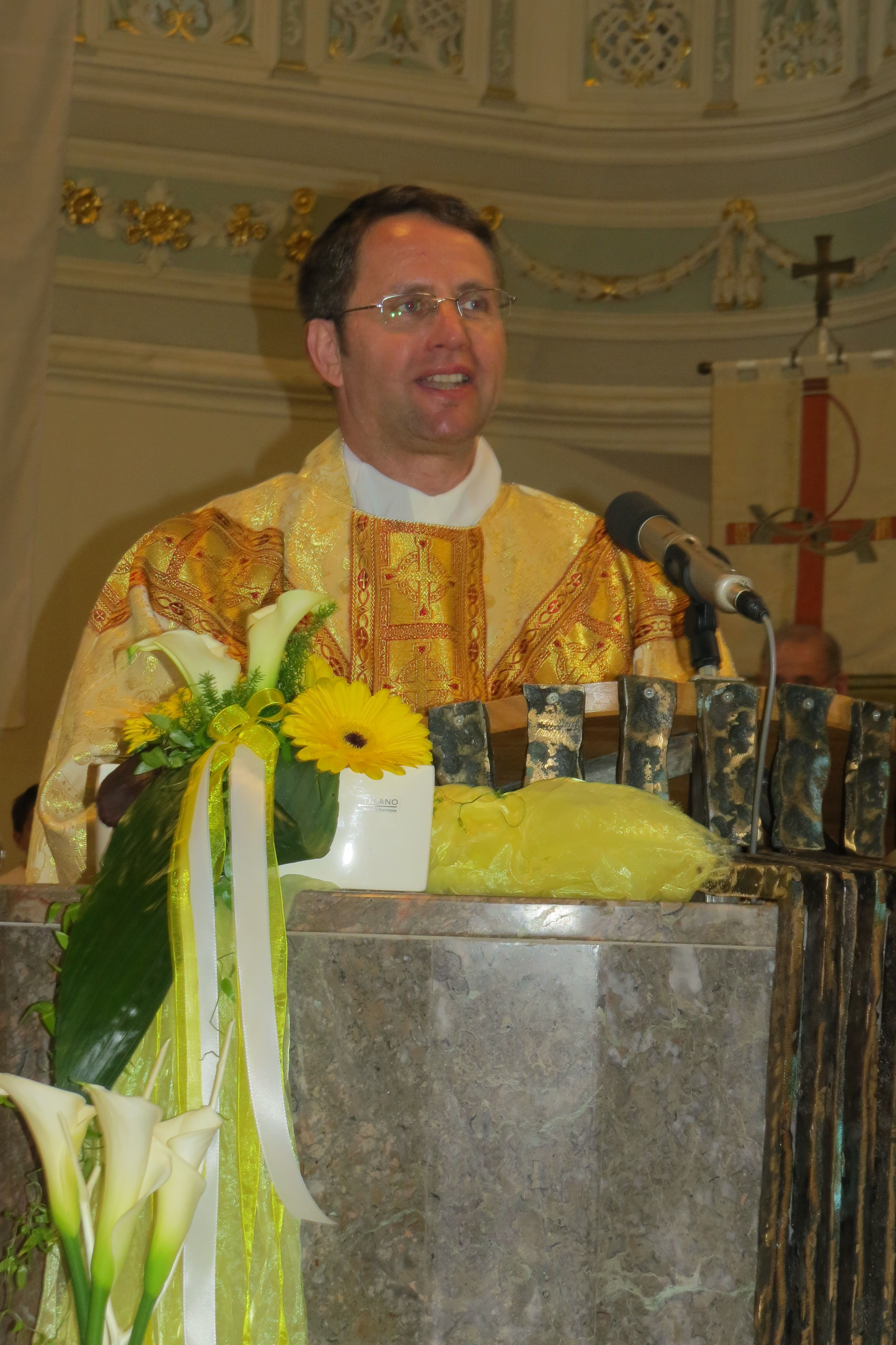 Der kleine Festakt wurde von der Musikkapelle unter Leitung von Markus Vollmer mit einem festlichen Musikstück eröffnet. Pfarrer Bonaventura Gerner dankte dem Neupriester für die erste Feier der Heiligen Messe mit seiner Heimatgemeinde. Das Zusammentreffen seiner Primiz mit dem »Sonntag vom guten Hirten« hätte nicht besser gewählt sein können. Priester sei man nicht für sich selbst, sondern immer für eine Gemeinde. Er wünschte dem künftigen Pfarrer, dass es ihm gelinge, die Tür zu den Menschen zu öffnen.
