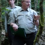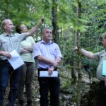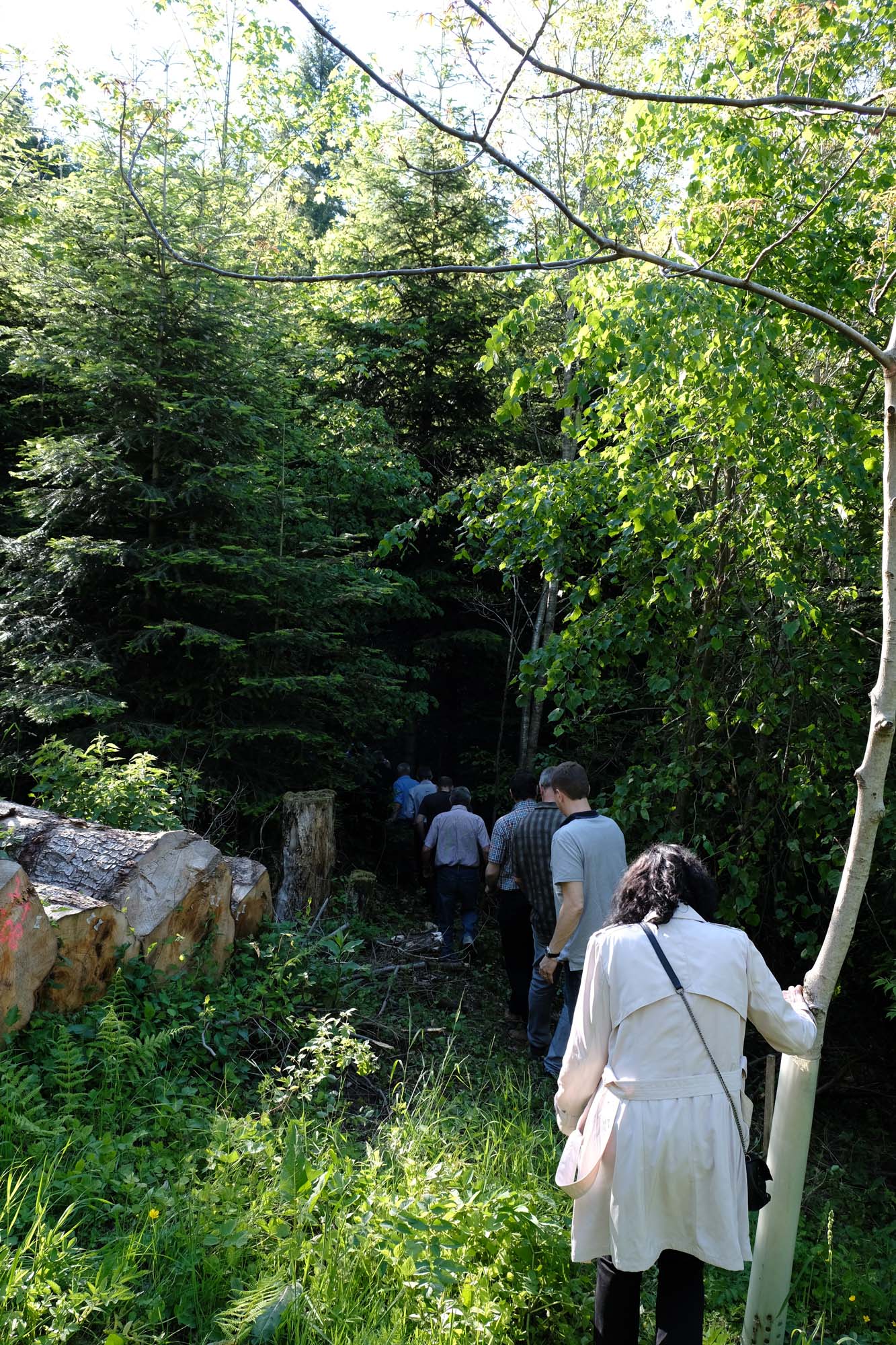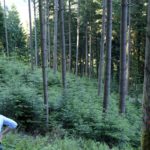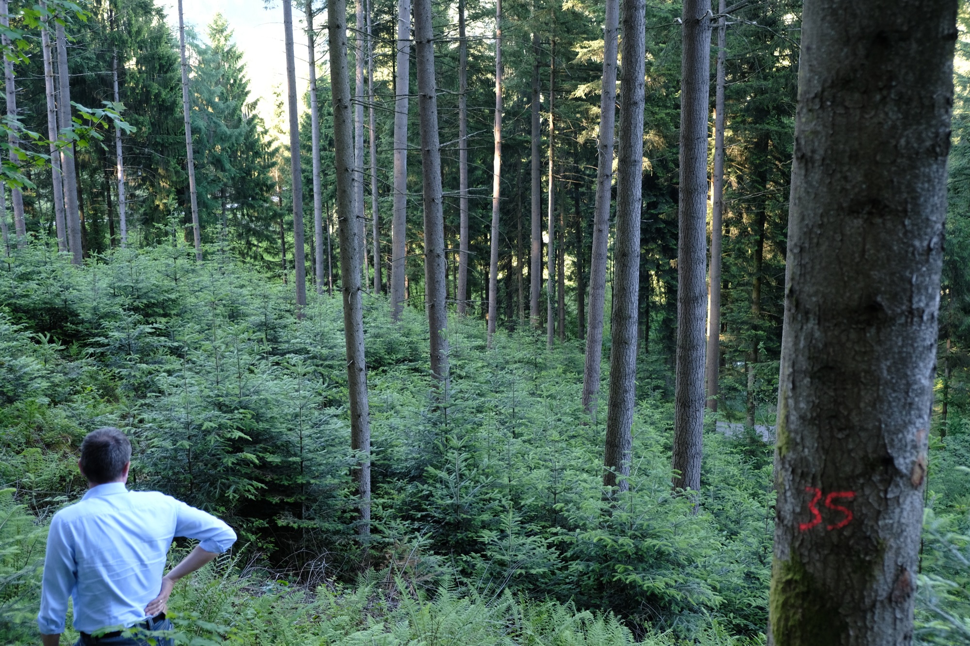Einige Meter weiter konnten die Teilnehmer der Exkursion in Augenschein nehmen, wie die Naturverjüngung nach einem Sturmschaden funktioniert. Es hatten sich dichte Bestände von jungen Bäumen unter dem Altbestand gebildet. Ein großer Vorteil des derart nachwachsenden Waldes sei, so die Forstexperten, dass die einzelnen Bäume aufgrund der diffusen Lichtverhältnisse trotz gleichen Alters unterschiedlich schnell heranwachsen und man so einzelne Bäume aus dem Bestand ernten kann. Eine Verjüngung freizustellen sei nicht gut, denn dann würde die Konkurrenzsituation befeuert. Die Hiebreife, so lernten die Anwesenden außerdem, hängt nicht am Alter, sondern am Durchmesser. Über 50 Zentimeter starkes Holz solle bewusst genutzt werden, um es nicht überdick werden zu lassen.