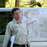 Im Bestand nahe des Eckwald-Pavillons erläuterte Revierförster Klaus Pfundstein anhand eines Beispiels die Waldbau-Strategie, die im Stadtwald verfolgt wird. An der besichtigten Stelle wurden einige Eichen als Insel zwischen die natürlich nachwachsenden Tannen gepflanzt. Das sei relativ kostengünstig, weil nur wenig Setzlinge zugekauft werden müssen. Die noch jungen Eichen werden nun regelmäßig gepflegt. Ein Stamm der Eichen-Insel, dessen Potenzial für die Zukunft am höchsten eingeschätzt wird, hat bereits ein rotes Band bekommen und wird bei Pflegeeingriffen und Durchforstungen besonders pfleglich behandelt. Dass es nach den Durchforstungen im Stadtwald manchmal etwas »wild« aussehe, sei Teil des Konzepts. Das Holz bleibt oft liegen und wird so in den