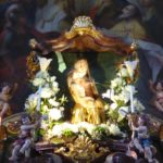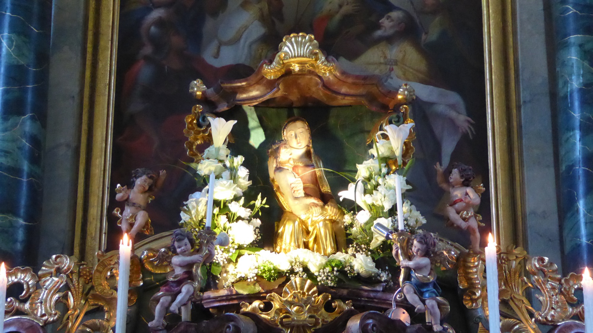 Kaum richtig im Bus sitzend, war bereits die Wallfahrtskirche auf dem Palmbühl in Sicht und damit das Tagesziel erreicht. Da wir Zeller nicht als einzige den Wallfahrtsort besuchten und zu pünktlich dort eintrafen, wurde die zur Verfügung stehende Zeit bereits vor und nach dem Besuch der Kirche zum Verweilen in den Anlagen rund um die Kirche genutzt. Nachdem die Gruppe vor uns das Gotteshaus verließ, erstürmten die Zeller Senioren die Wallfahrtskirche zur »Schmerzhaften Mutter Maria«, um gemeinsam mit Br. Pirmin und dem Altenratsteam eine kleine Maiandacht zu halten. Bei der Andacht wurde auch der am 9. April verstorbenen Gemeindereferentin Johanna Schaub gedacht, die 1978 zusammen mit Pfarrer Wolfgang Burger das Altenwerk Zell gründete.
