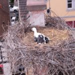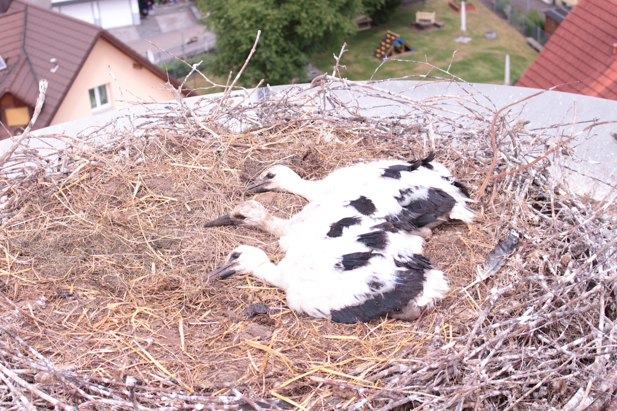 Die Kinder durften sogar einmal streicheln. Dass sich das Jungtier während der ganzen Prozedur nicht bewegte, das lernten die Anwesenden, liegt an einem Reflex – der sogenannten Thanatose. In der Natur schützt dieser Mechanismus vor Fressfeinden. Im Falle der Beringung trägt der kleine Adebar keine Schäden davon, denn sobald er wieder im Nest ist, streicheln die Eltern ihn mit ihren Schnäbeln wieder munter. Herausgenommen werden die Kleinen jedoch nur, wenn mindestens noch ein Geschwisterchen im Nest verbleibt. Sonst könnte es sein, dass die Eltern das Nest vorzeitig aufgeben. Sobald die Brut flügge geworden ist, verlieren nämlich auch die Elterntiere die Nestbindung. Diesen Eindruck gilt es tunlichst zu vermeiden. Am Geruch stören sich Storchenmama und –papa anders als andere Wildtiere indes nicht. »Sie riechen nichts, hören schlecht«, erklärt Gérard Mercier. »Dafür sehen sie kilometerweit.«