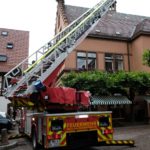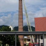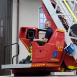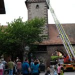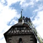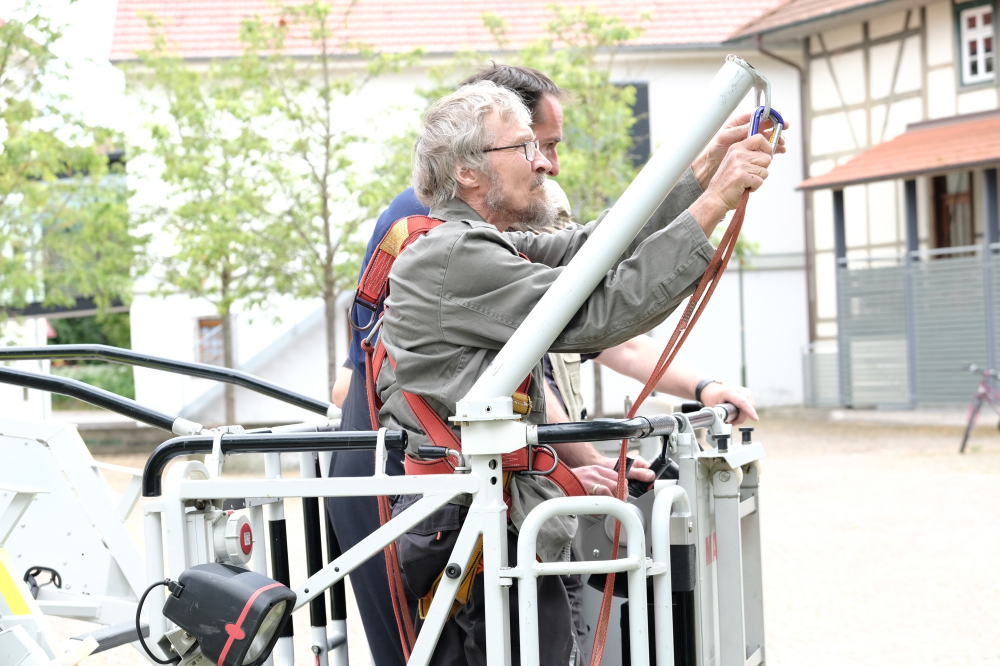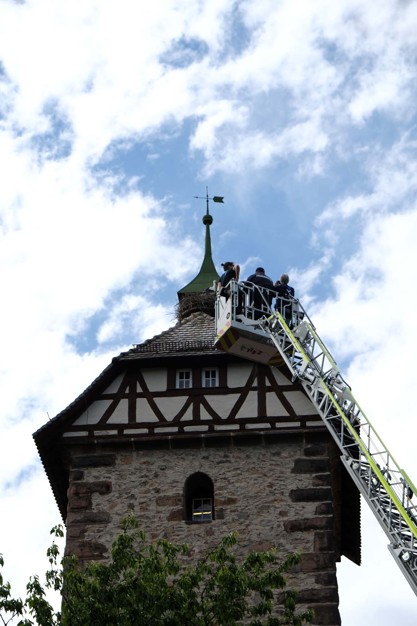 Die Feuerwehr hilft bei der Beringungsaktion mit der Drehleiter aus. Ralf Sell war am Freitag der Mann am Fahrzeug. Karl-Heinz Gienger behielt die Gesamtlage im Blick und Thomas Burger komplettierte die Fahrzeugbesatzung.