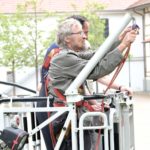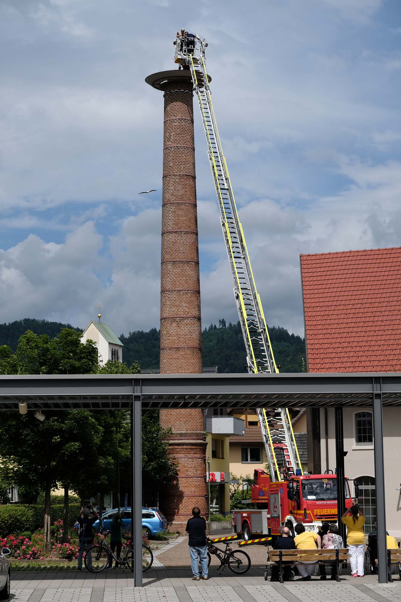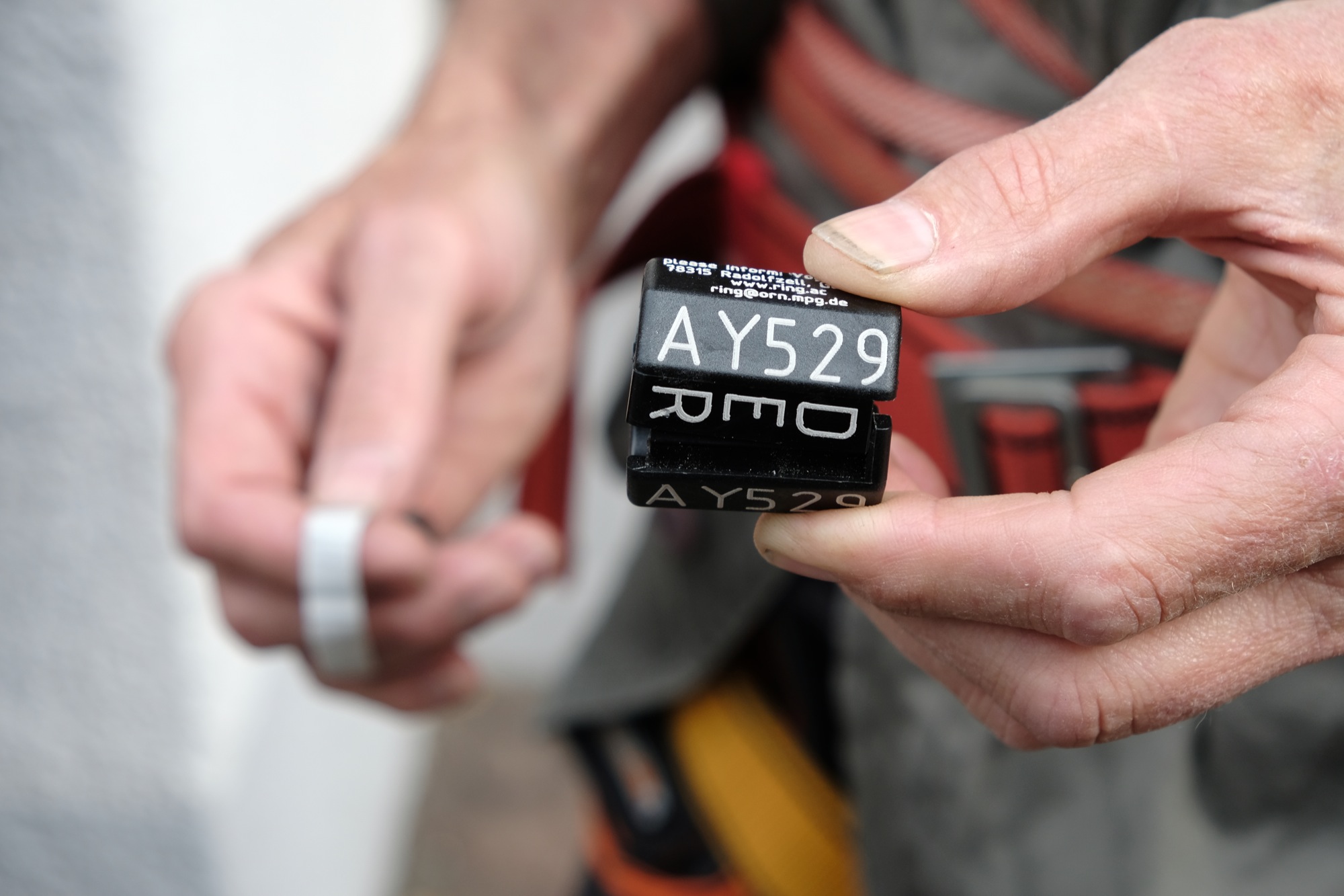 Gérard Mercier, Vorsitzender des Naturschutzbundes Kehl (NABU), leitete die Aktion. In Biberach konnten die Zuschauer nicht nur aus großer Entfernung das Beringen erleben. Er brachte von seinem Ausflug in die luftigen Höhen des Rietsche-Kamins sogar ein Tierkind mit nach unten und klickte die Markierung auf festem Boden an. »In ungeraden Jahren links, in geraden Jahren rechts«, erklärte er, als er den »Ausweis« oberhalb des Sprunggelenks um das linke Bein legte.