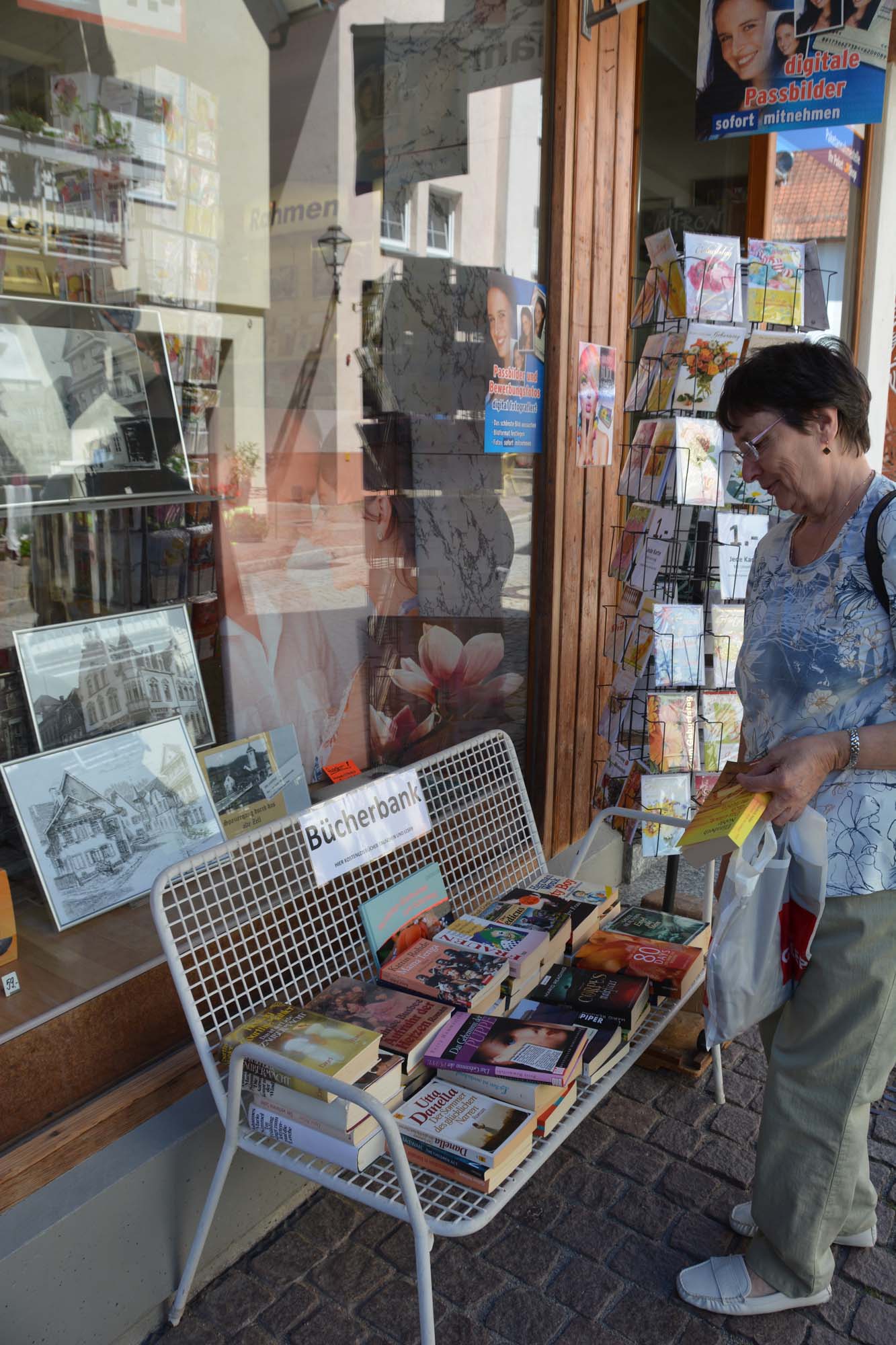 »Die Straße als solches ist positiv«, bezieht Inhaber Klaus Bergmann vom Fotofachgeschäft Stellung. Wichtig sei, dass man zum Be- und Entladen in die Straße einfahren könne. Auf den Umsatz in seinem Geschäft habe sich die Fußgängerzone bisher weder positiv noch negativ ausgewirkt. Die Straße müsse sich langfristig entwickeln, meint Klaus Bergmann. Neue Fahrradständer müssten noch installiert werden oder eine E-Bike-Station. Mit einem »Bücherbänkle« vor seinem Geschäft sorgt er schon seit längerer Zeit für einen Kundenstopper.