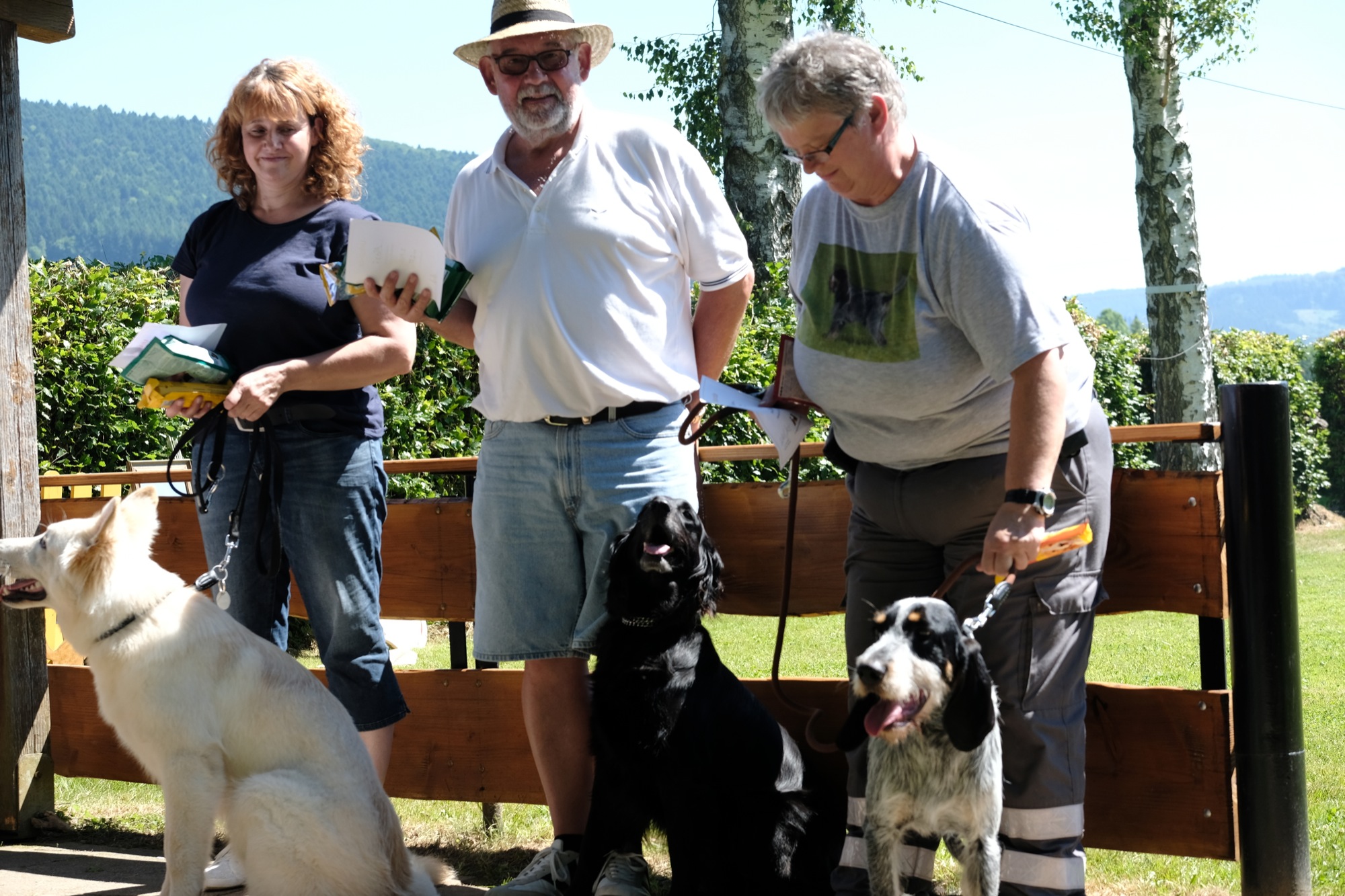 Beim Sprintrennen auf 30 Meter konnte »Maxi«, die Flat Coated Retriever-Hündin von Lothar (Mitte), in der Kategorie »Gäste« ihren Titel mit 2,77 Sekunden auf 30 Meter als »Schnellster Hund im Kinzigtal« verteidigen. Zweiter wurde Ingrids Rettungshund-Azubi »Balduin«, ein Griffon bleu de Gascogne (rechts). Den dritten Platz belegte der weiße Schäferhund »Chief« von Andrea (links). Die Hunde des Vereins liefen unter einer separaten Wertung. Hier waren drei Malinois einsame Spitze.