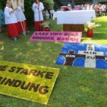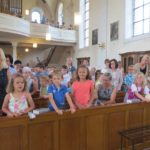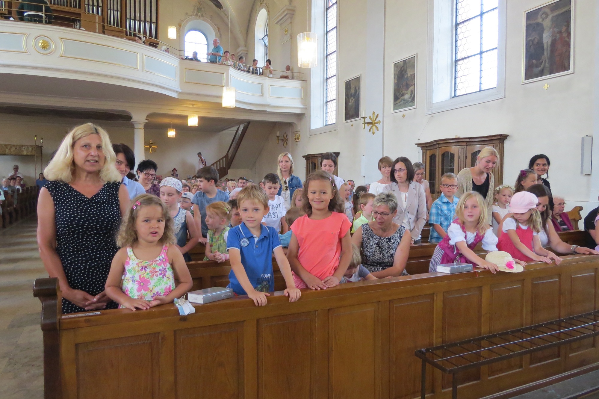 Lektorin Jutta Uhl sprach in einem meditativen Text ebenfalls dieses Thema an. Sie nannte verschiedene Möglichkeiten des Brückenbaus zwischen den Menschen. Für die Kommunionkinder waren Bänke im Altarraum reserviert. Sie sangen ihr Mottolied aus dem Kommunionkurs, das in ihrem Jargon kurzerhand »Brückenbaulied« heißt und mit vielen Gesten vorgetragen wird. Hell klangen ihre schönen Kinderstimmen in der Kirche.