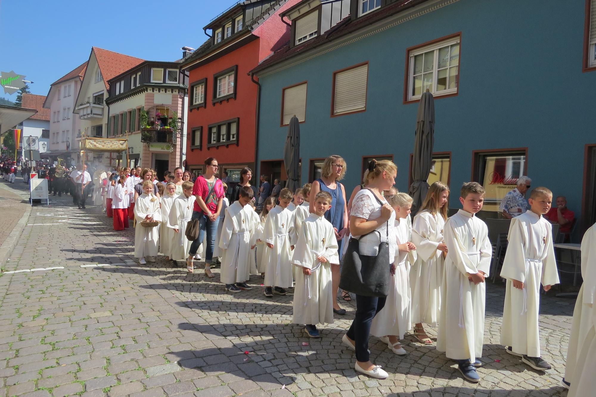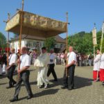 Die Prozession ging über die St.-Gallus-Straße, Spitalstraße wieder zur Hauptstraße und zur Pfarrkirche zurück. Auch dort wurde nochmals der eucharistische Segen gespendet. Mit dem Choral »Großer Gott, wir loben dich« endet traditionell die kirchliche Feier am Herrgottstag. Pfarrer Gerner bedankte sich abschließend bei allen Personen, die bei der Planung und Durchführung des Fronleichnamstags beteiligt waren. Vor allem dankte er den Kindern: »Trotz der großen Hitze habt ihr gut durchgehalten.«